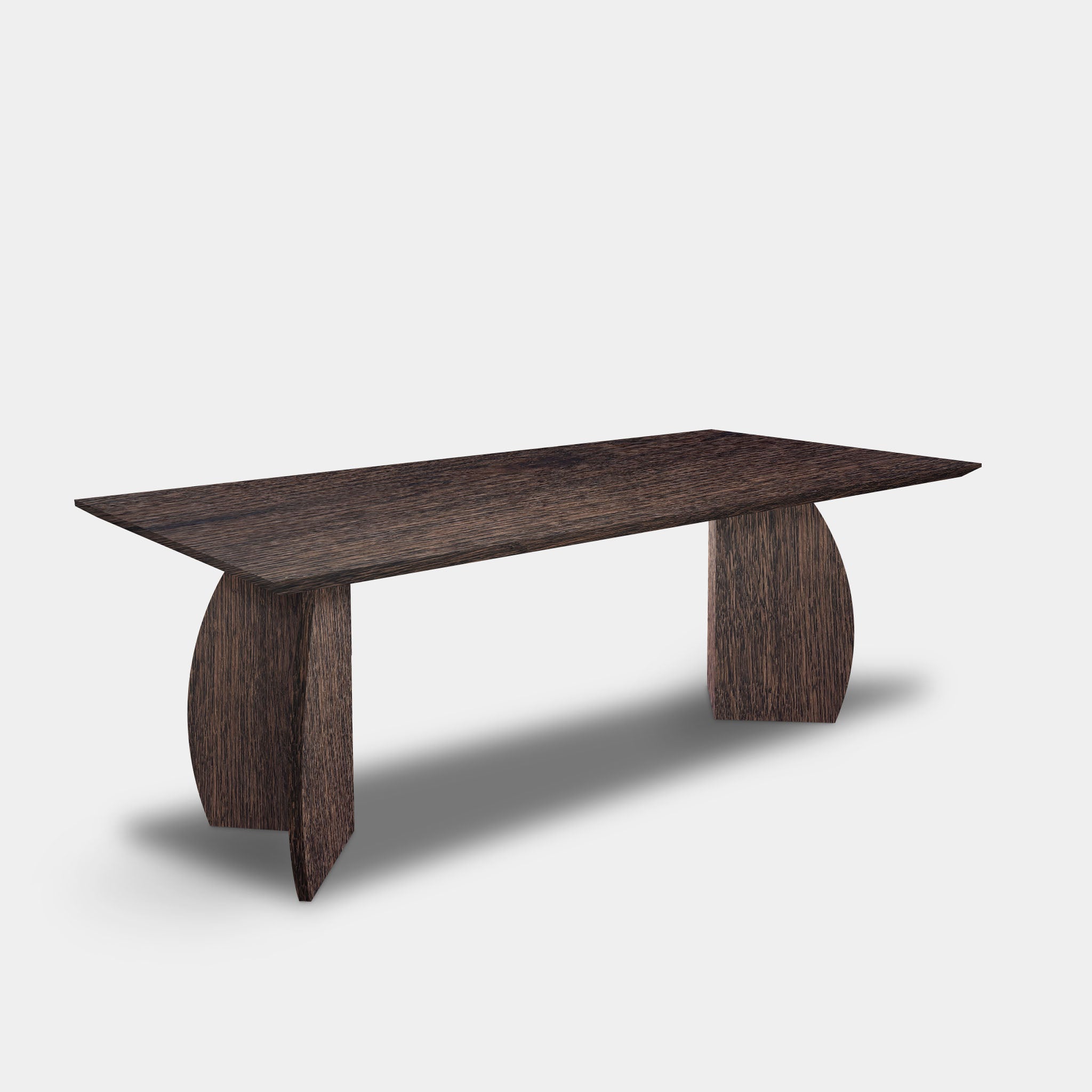 Deze massief eikenhouten tafel met een karaktervolle driehoek poot wordt volledig afgewerkt in de kleur dear brown. Zowel het blad als het onderstel worden in exact dezelfde kleur gelakt, voor een strak en elegant totaalbeeld dat past in elk interieur.