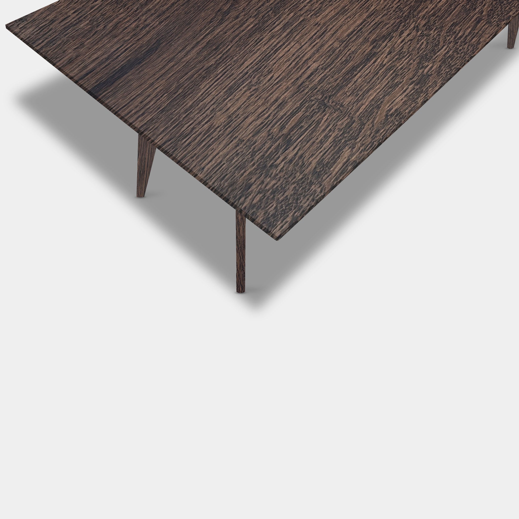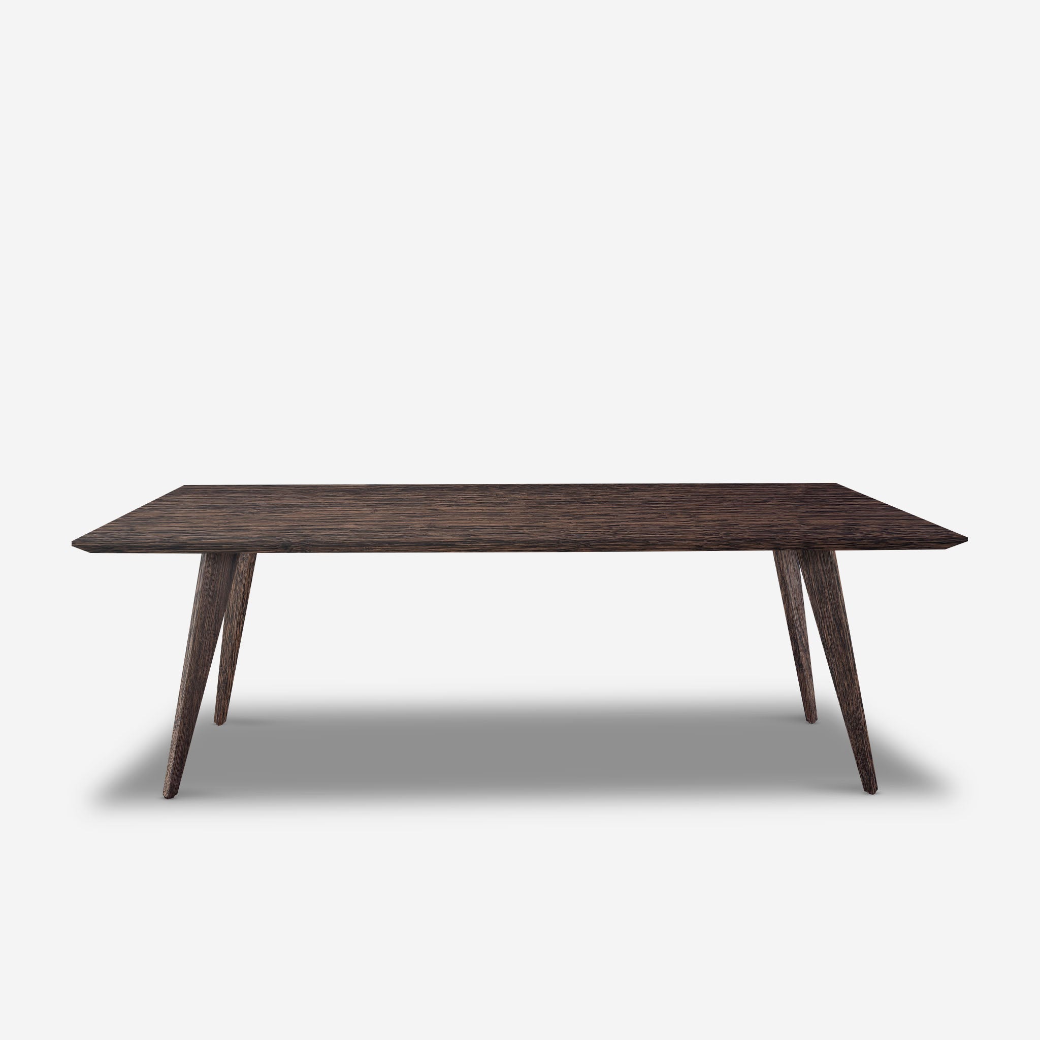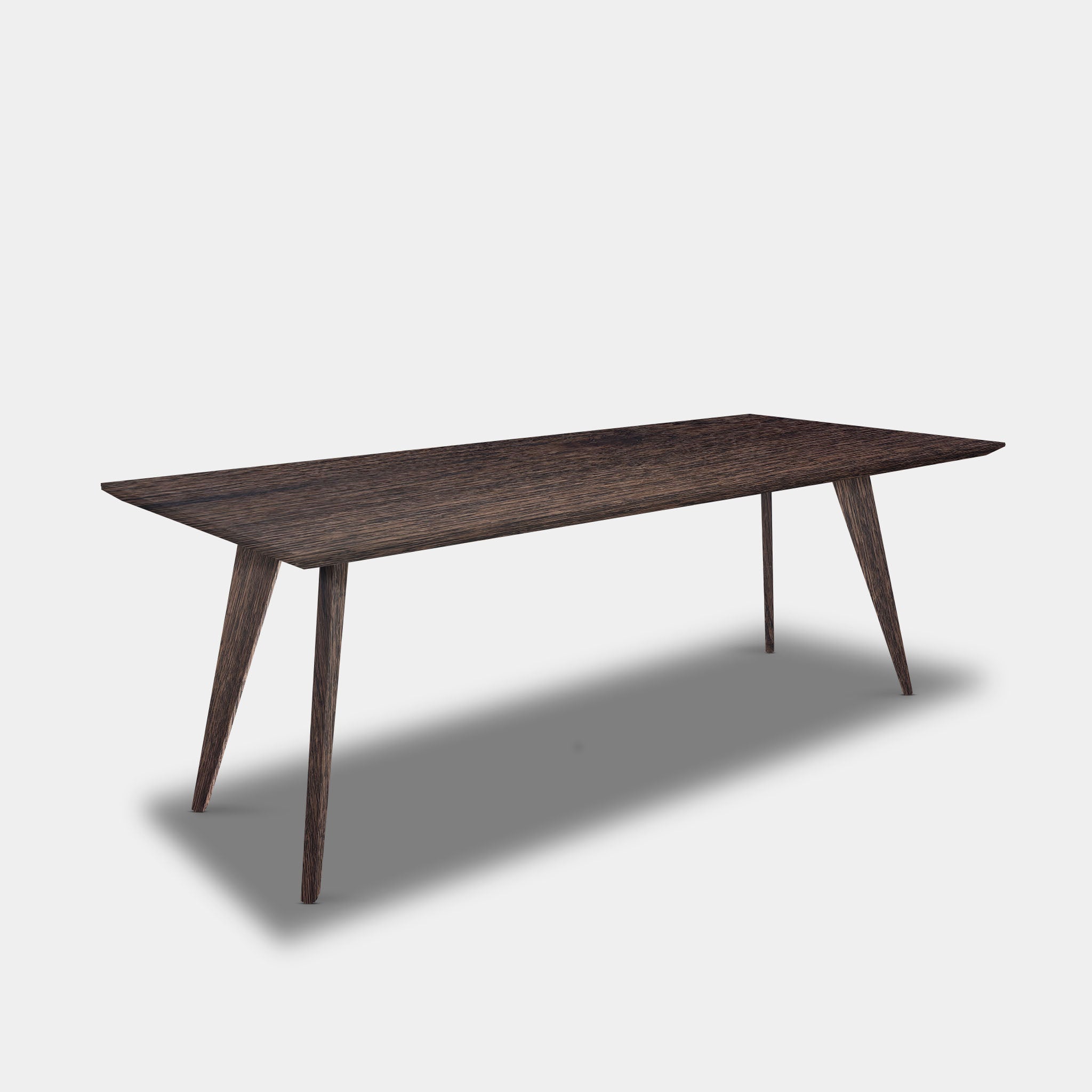 Deze massief eikenhouten tafel met volledig houten onderstel is volledig afgewerkt in de kleur dear brown. Door blad en onderstel in één kleur te spuiten ontstaat er een strak, modern en evenwichtig geheel – perfect voor ieder interieur dat rust en verfijning uitstraalt.