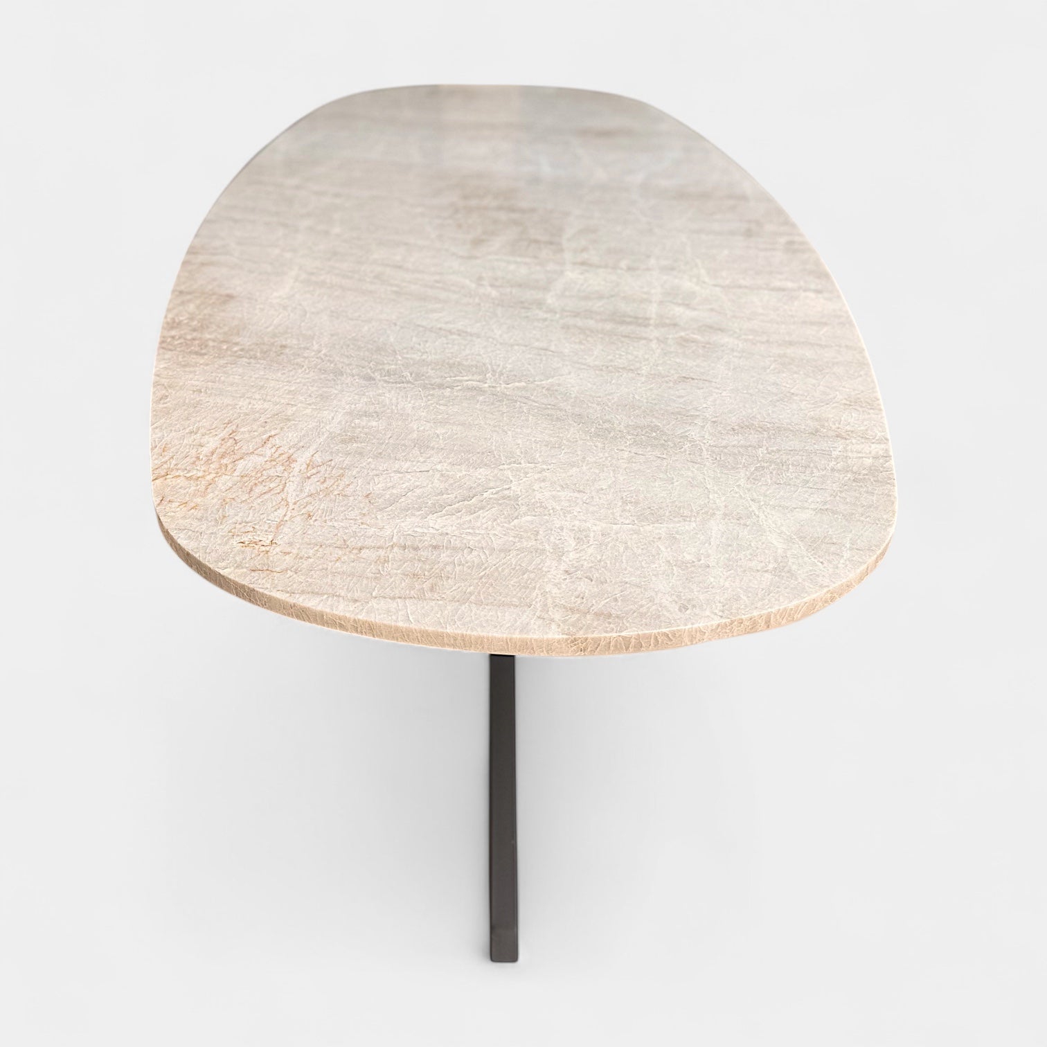 Deze prachtige Deens ovale eettafel is vervaardigd uit exclusief Taj Mahal kwartsiet – een natuurlijk gesteente met subtiele aders en warme, elegante tinten. Het blad is met zorg afgewerkt en rust op een robuuste zwarte metalen matrix poot, wat de tafel een modern industrieel karakter geeft.