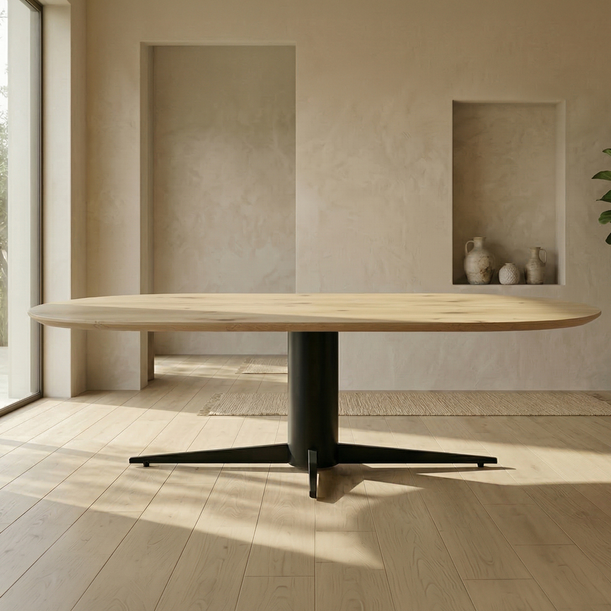Plat ovale eiken eettafel met kolompoot – massief Europees eiken