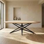 Deze plat ovale eettafel is gemaakt van massief Europees eiken en uitgevoerd met een opvallend matrix star onderstel van metaal. De combinatie van het warme eikenhout en het stervormige stalen onderstel geeft de tafel een moderne en unieke uitstraling.