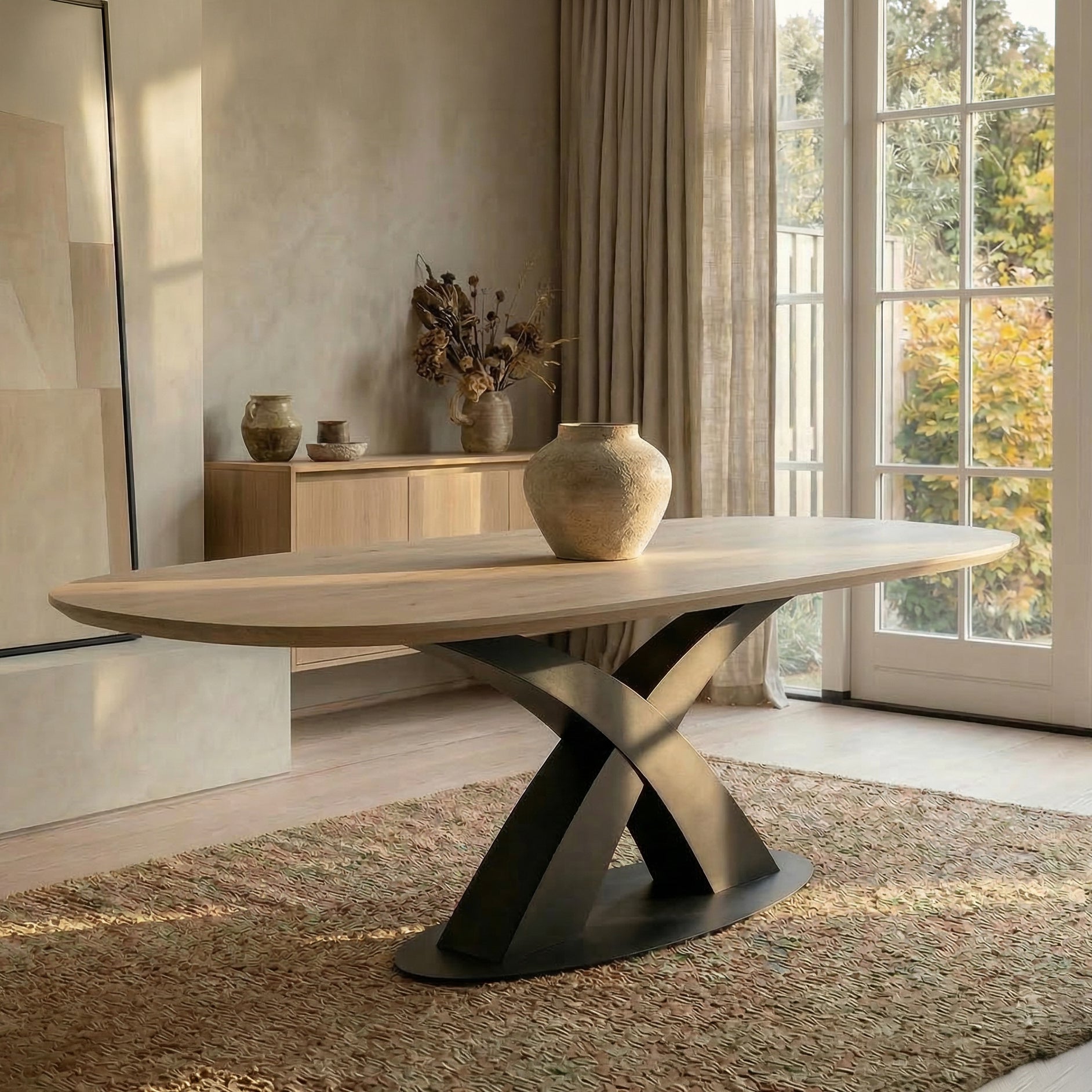 Plat ovale eiken eettafel met bridge onderstel – massief Europees eiken