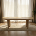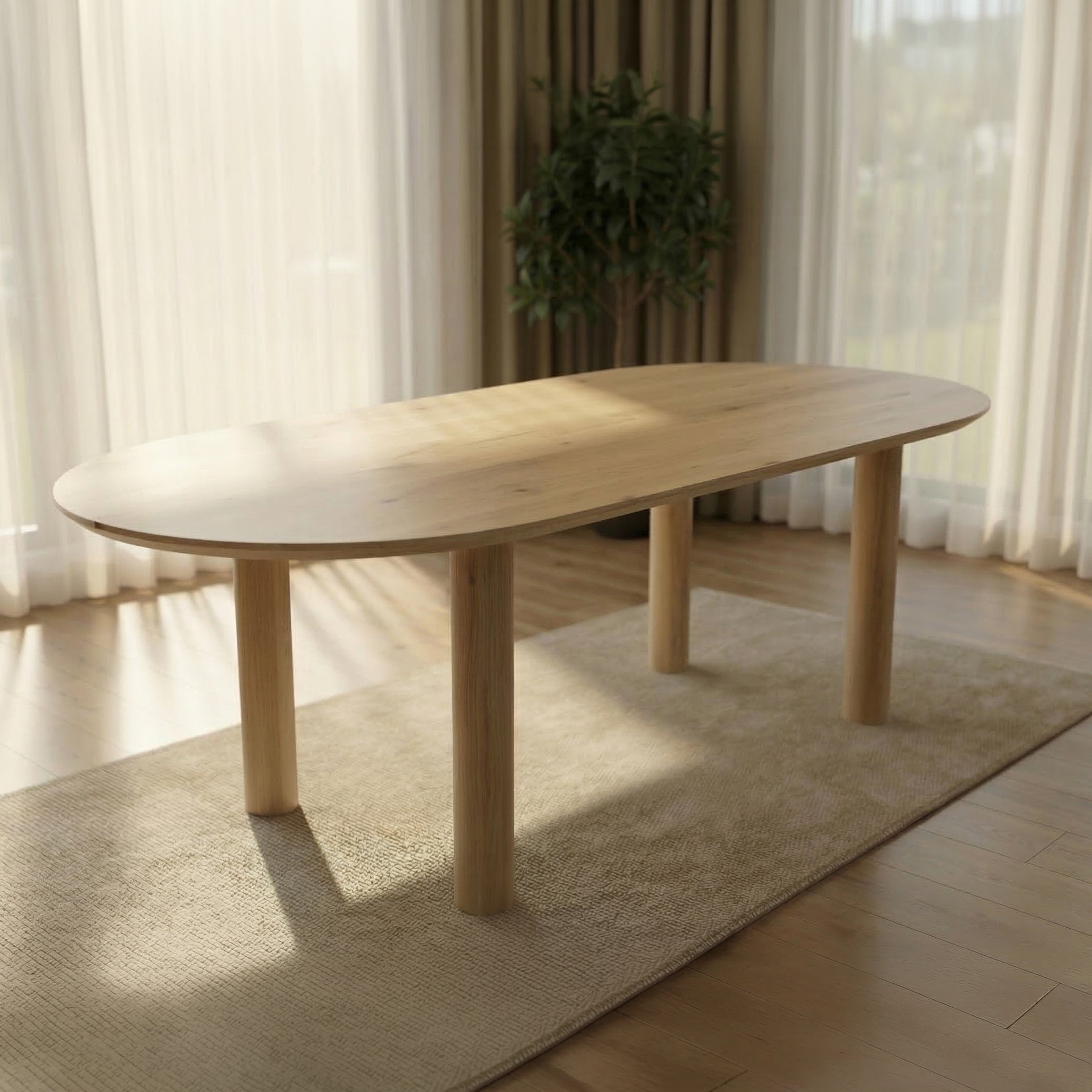 Deze plat ovale eettafel is vervaardigd uit massief Europees eiken en voorzien van pilaar poten van eikenhout (set van 4). Het solide onderstel geeft de tafel een stabiele en robuuste uitstraling, terwijl het eikenhout zorgt voor een warme en natuurlijke basis.