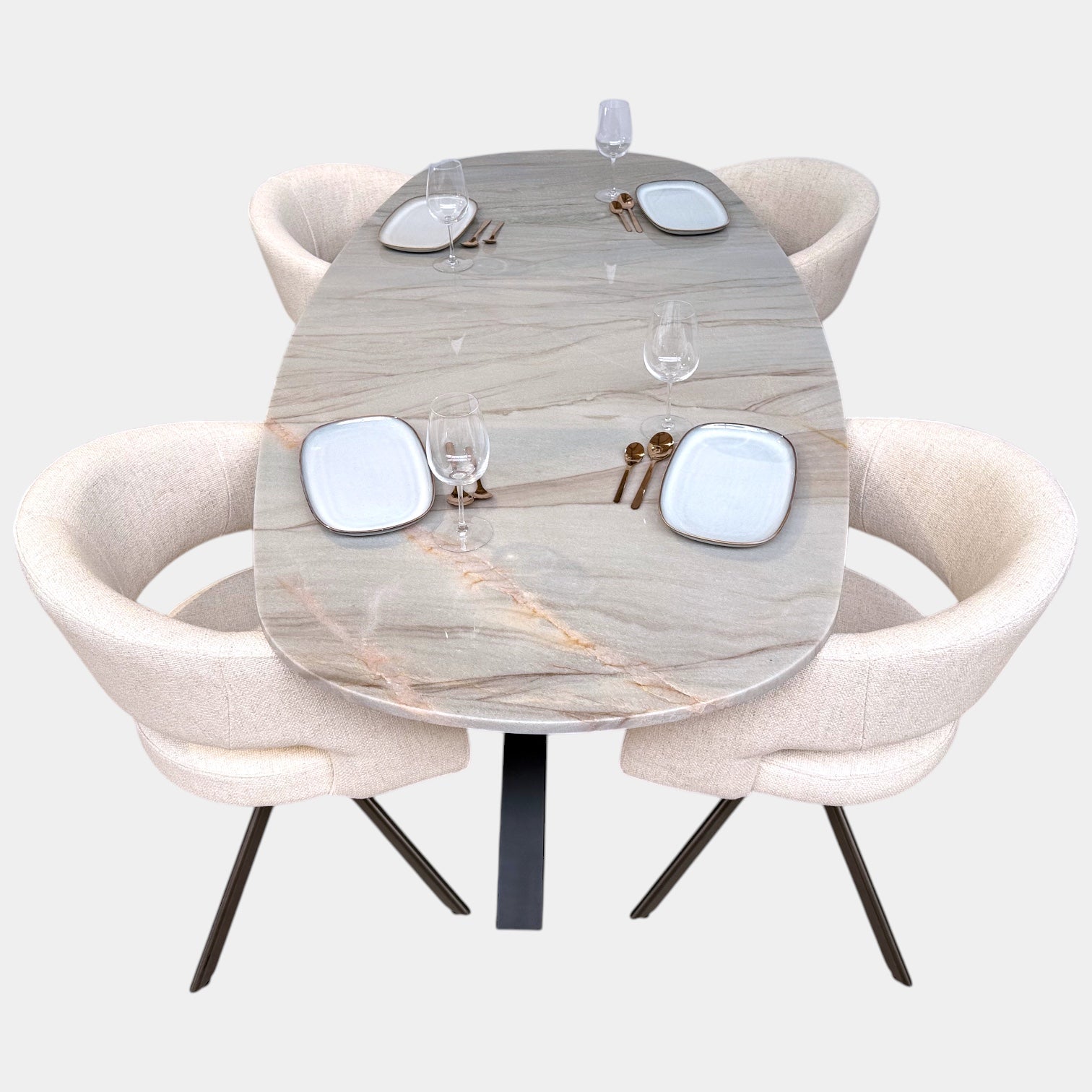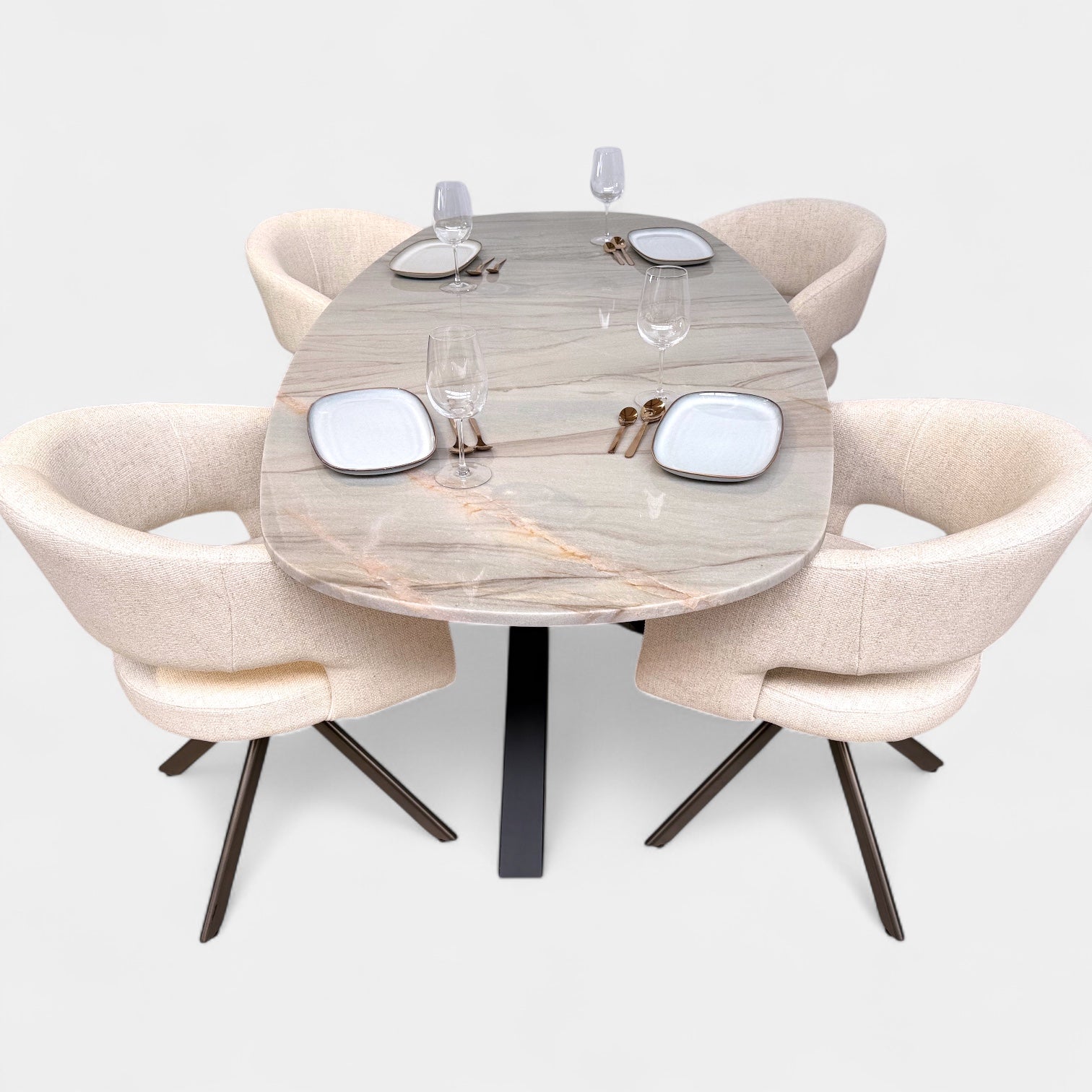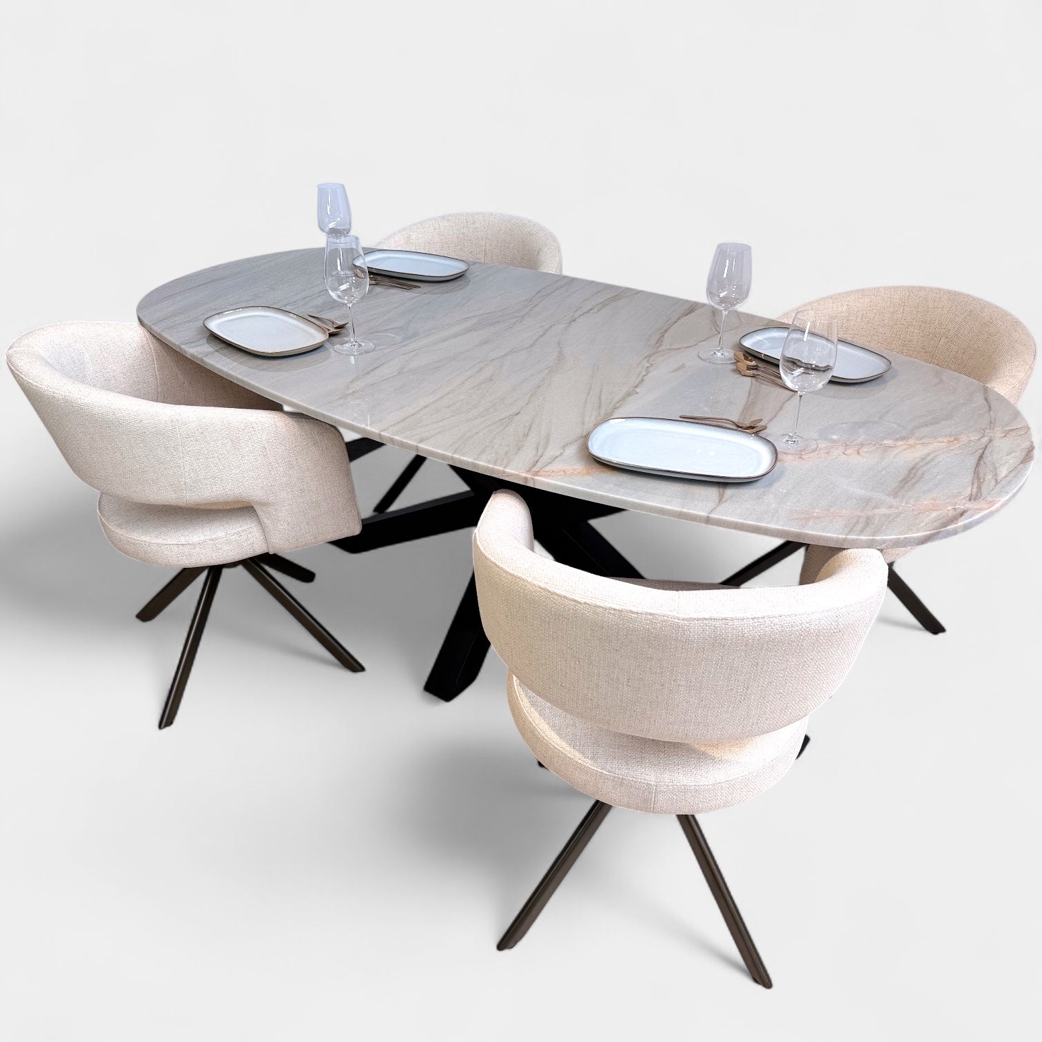 Deze verfijnde eettafel met Deens ovale vorm is een waar pronkstuk in elk interieur. Het blad is vervaardigd uit exclusief Mediterraneo kwartsiet – een hoogwaardige natuursteen met warme mediterrane kleurnuances en een levendige adering. Elk stuk steen is uniek, wat elke tafel een eigen karakter geeft.