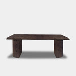 Deze elegante en krachtige boomstamtafel van massief eikenhout, afgewerkt in de diepe kleur Dear Brown, straalt klasse en rust uit. Het organisch gevormde blad en het stevige half rond onderstel zijn beide meegespoten in dezelfde warme tint, wat zorgt voor een harmonieus en stijlvol geheel.