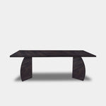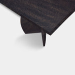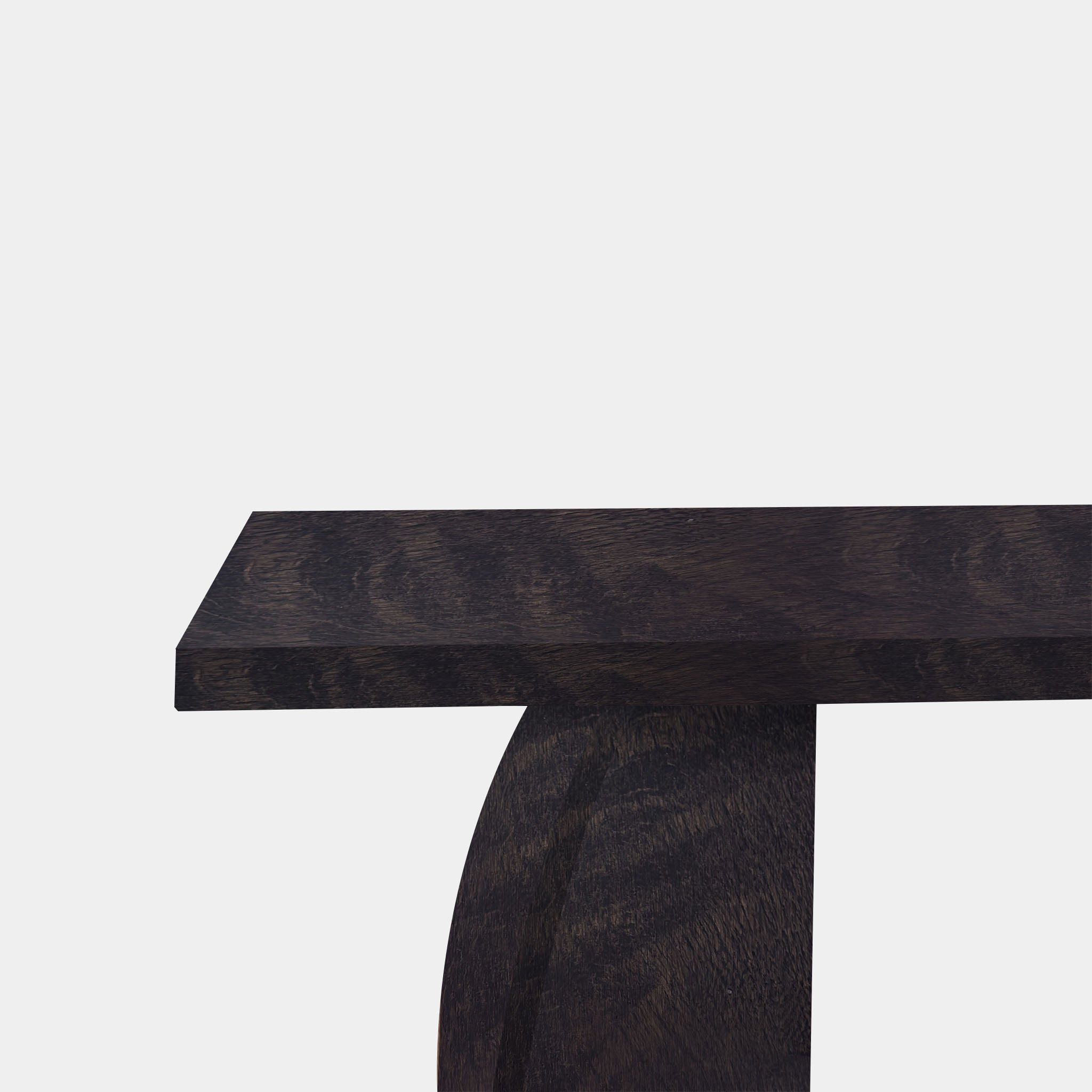 Deze krachtige en stijlvolle boomstamtafel van massief eikenhout, afgewerkt in de diepe kleur Dark Grey, is een echte blikvanger in ieder interieur. Het natuurlijk gevormde blad wordt ondersteund door een strak en robuust driehoek onderstel, volledig meegespoten in dezelfde kleur voor een strakke, moderne uitstraling.