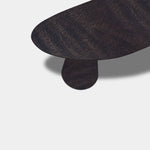 Deze moderne en stijlvolle organisch gevormde tafel van massief eikenhout, afgewerkt in de diepe kleur Dark Grey, brengt natuurlijke elegantie samen met eigentijdse luxe. Het vloeiende, asymmetrisch gevormde blad zorgt voor een speelse en zachte uitstraling, terwijl de vier taps toelopende kegelpoot poten, meegespoten in dezelfde tint, voor een stabiel en strak geheel zorgen.