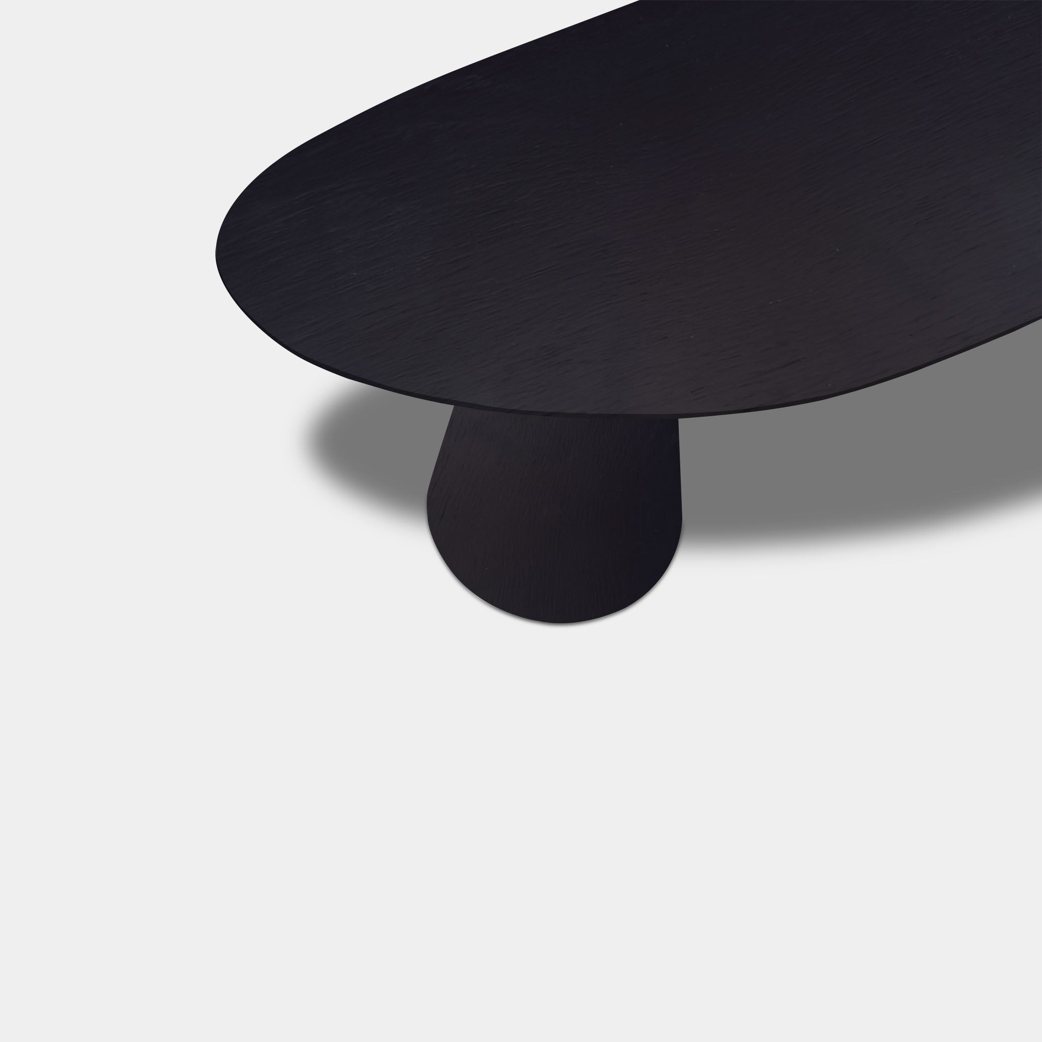 Deze robuuste en elegante organisch gevormde tafel van massief eikenhout, afgewerkt in de diepe kleur Donker Eiken, combineert natuurlijke vormen met klassieke kracht. Het vloeiende blad met asymmetrische lijnen zorgt voor een zachte en uitnodigende uitstraling, terwijl de vier taps toelopende kegelpoot poten, meegespoten in dezelfde tint, zorgen voor een solide en harmonieus geheel.