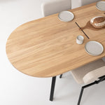 Een plat ovale eikenhouten tafel combineert elegantie met functionaliteit. Dankzij de subtiele, langgerekte vorm creëer je een ruimtelijk en uitnodigend effect in elke eetkamer of werkruimte. Stel jouw ideale tafel eenvoudig samen: