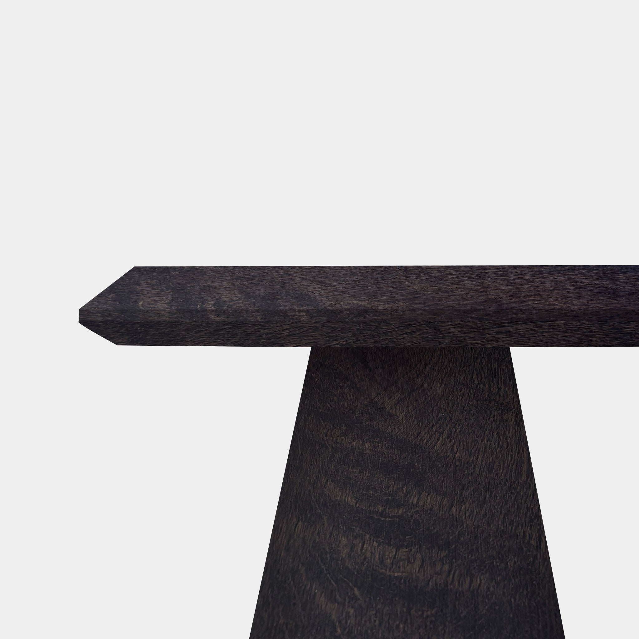 Deze elegante eikenhouten tafel met kegelvormige poten wordt volledig afgewerkt in de kleur dark grey. Het blad en onderstel vormen zo een strak geheel dat past in zowel moderne als klassieke interieurs.