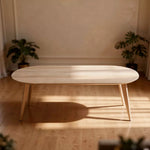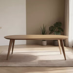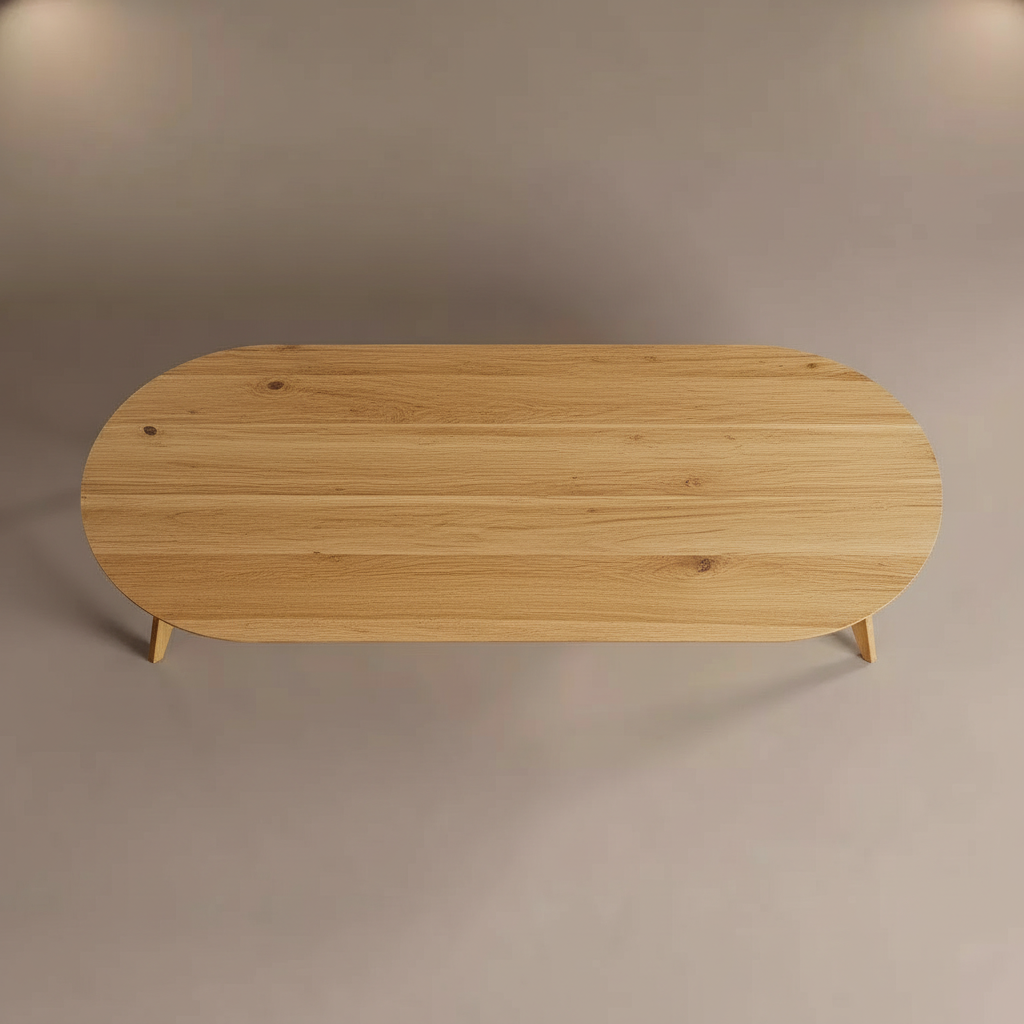 Ontdek ons Plat ovaal tafelblad van 40 mm massief Europees eiken. De verfijnde verjongde rand geeft het blad een moderne, tijdloze uitstraling die perfect past in Scandinavische en minimalistische interieurs.