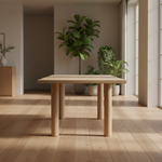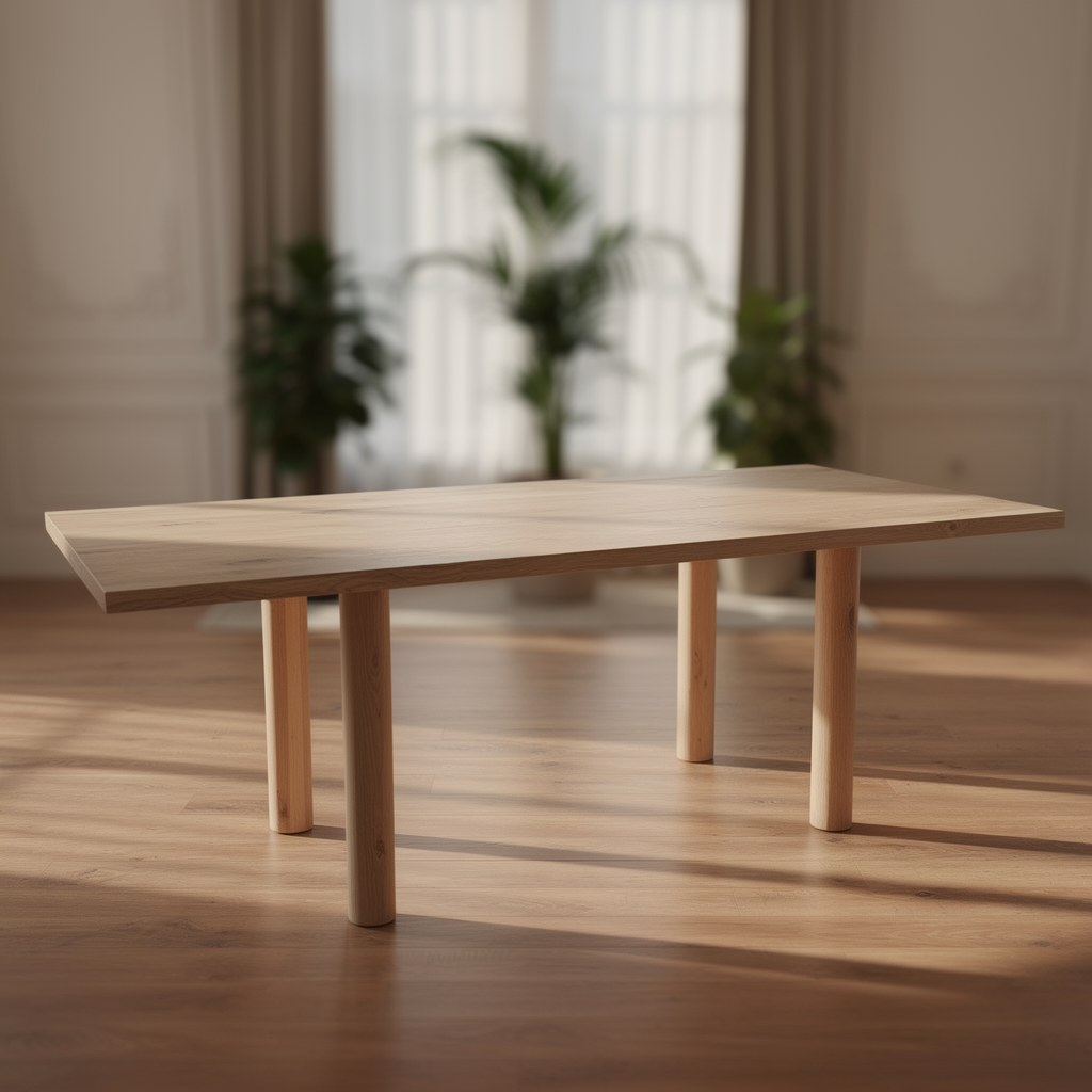 De tafel rust op vier robuuste pilaarpoten van massief eiken, elk met een diameter van 15 cm. Deze krachtige, cilindervormige poten geven de tafel een solide en architectonische uitstraling, terwijl ze zorgen voor optimale stabiliteit en een perfect uitgebalanceerd geheel. Het ontwerp oogt strak en rustig, met een duidelijke focus op vorm, proportie en materiaal.