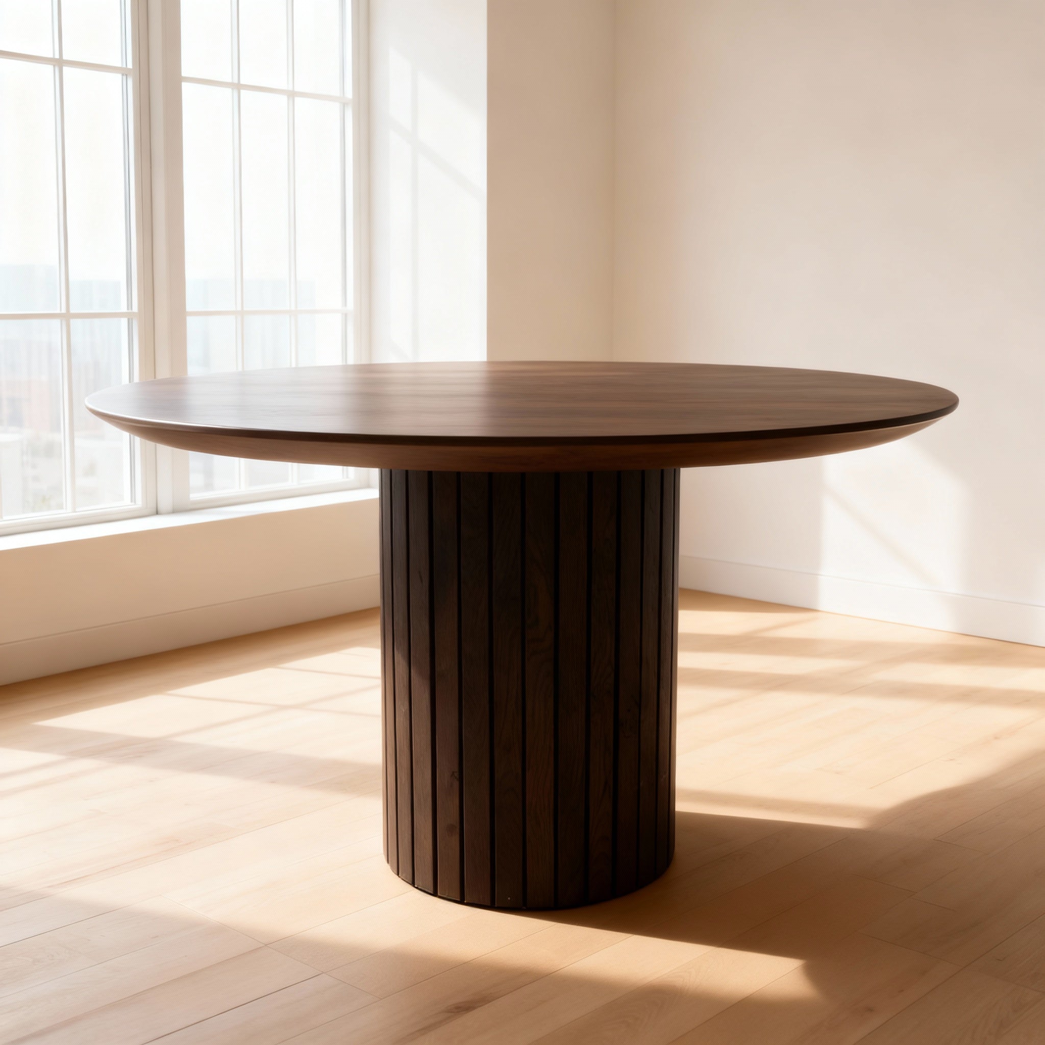 Rond is de ultieme vorm voor gezelligheid. Iedereen kan elkaar aankijken en meepraten. De diepe 'Dear Brown' kleur is rijk en sfeervol. Het unieke latjes onderstel maakt het design compleet. Het zorgt voor een moderne en speelse uitstraling. Een tafel met een warm hart en een uniek karakter.