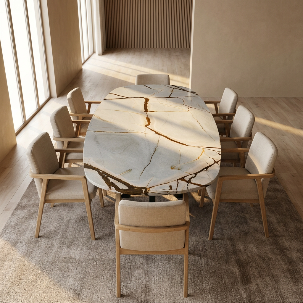 We craft exclusive custom-made natural stone tables using carefully selected marble, quartzite, and granite from the world's most beautiful caves. In our workshop in the Netherlands, all tables are designed and finished entirely to your specifications.