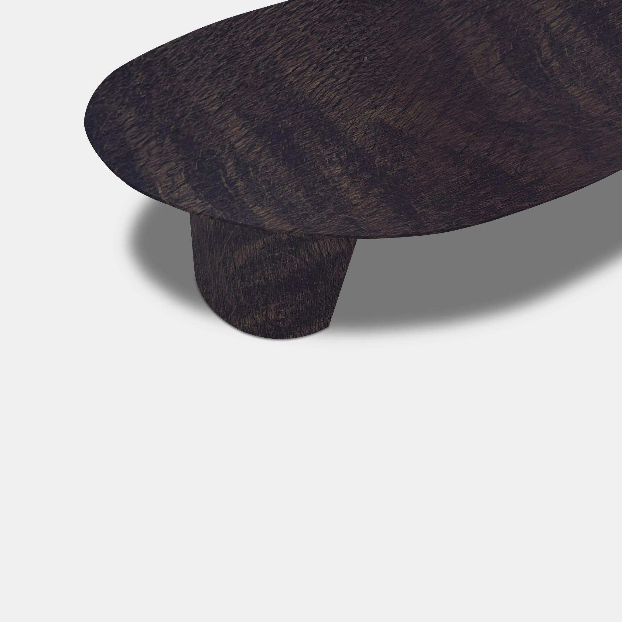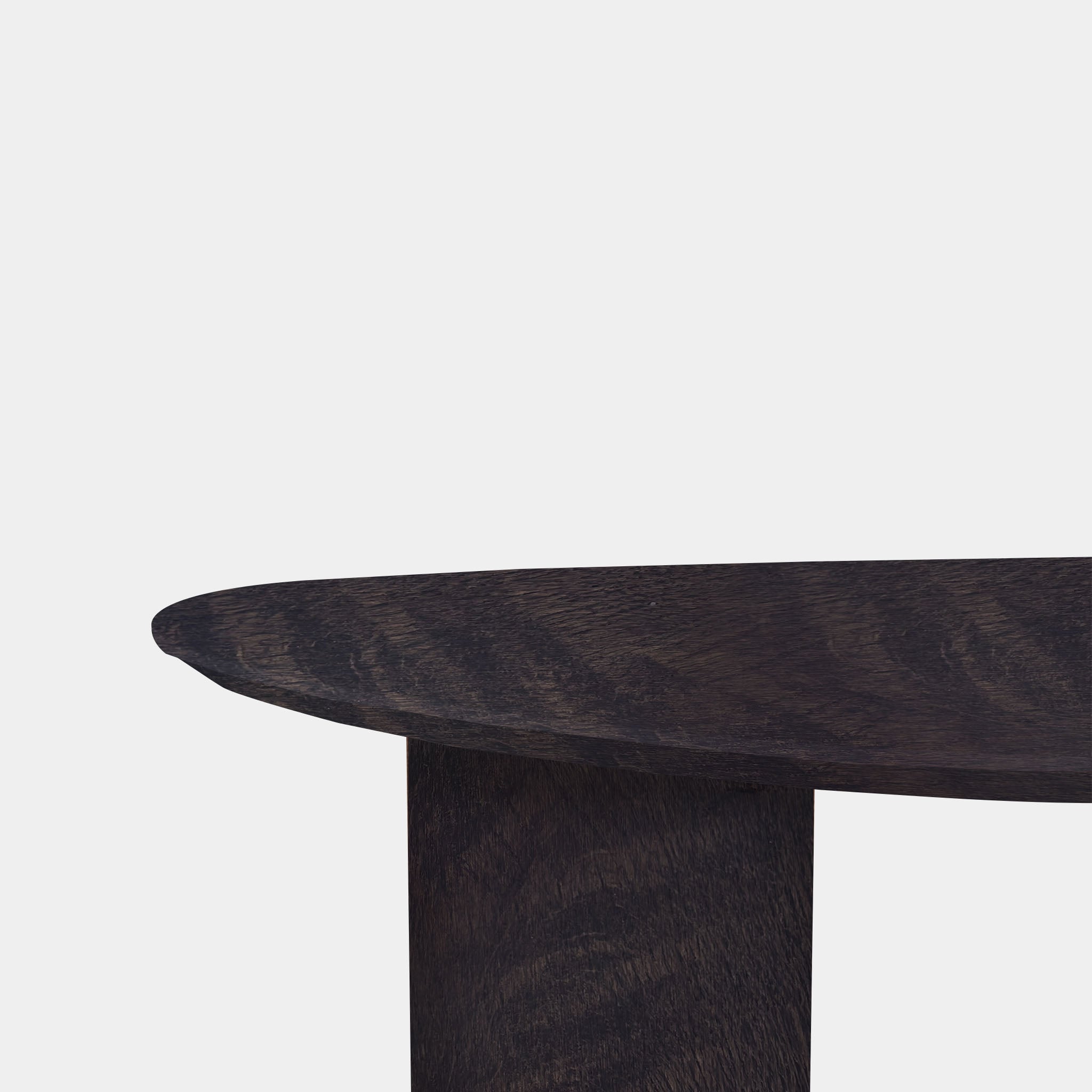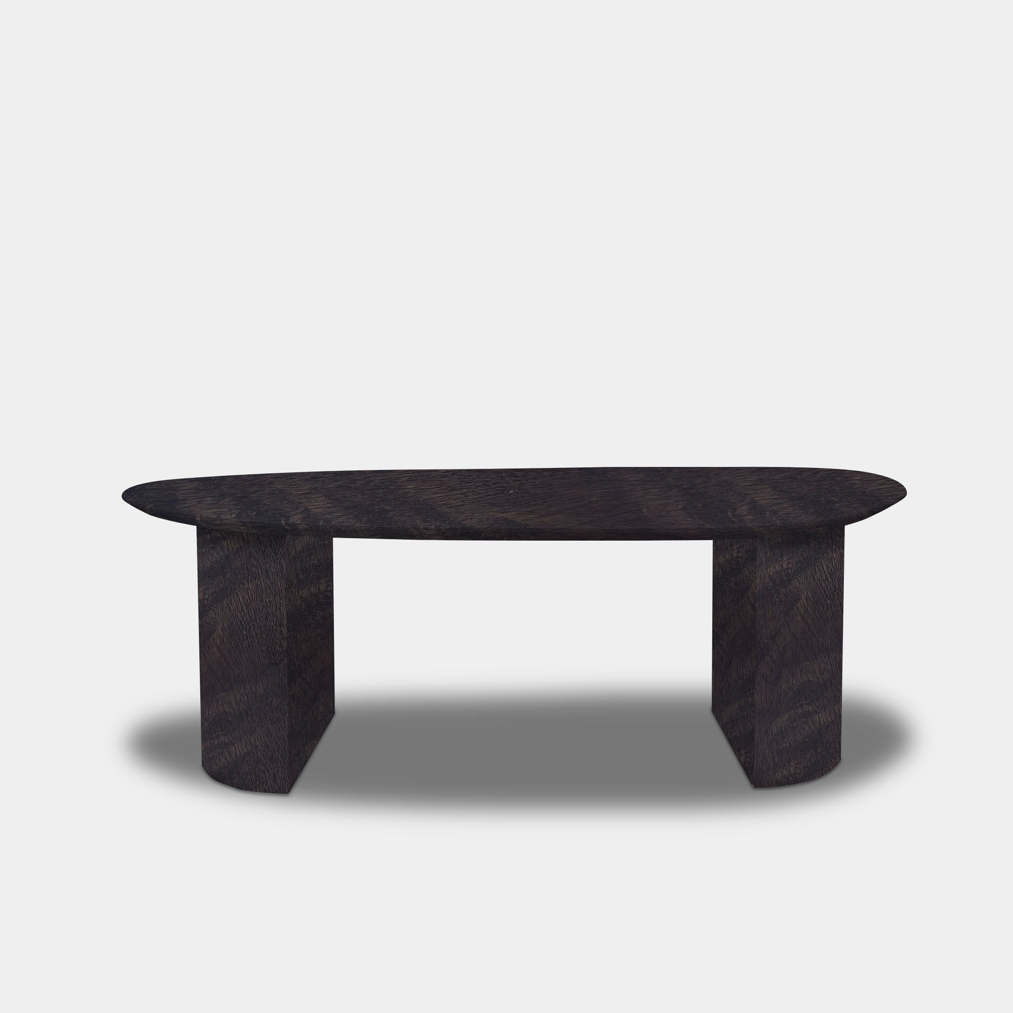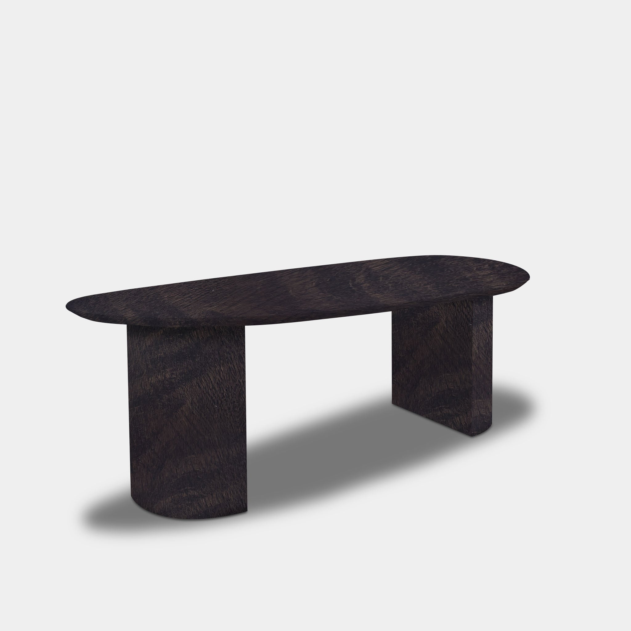 This modern and powerful, organically shaped table made of solid oak, finished in a deep Dark Grey, combines soft, natural shapes with a robust and stylish character. The flowing top creates an inviting, contemporary silhouette, while the semi-circular base, spray-painted in the same dark shade, provides a stable and visually strong foundation.