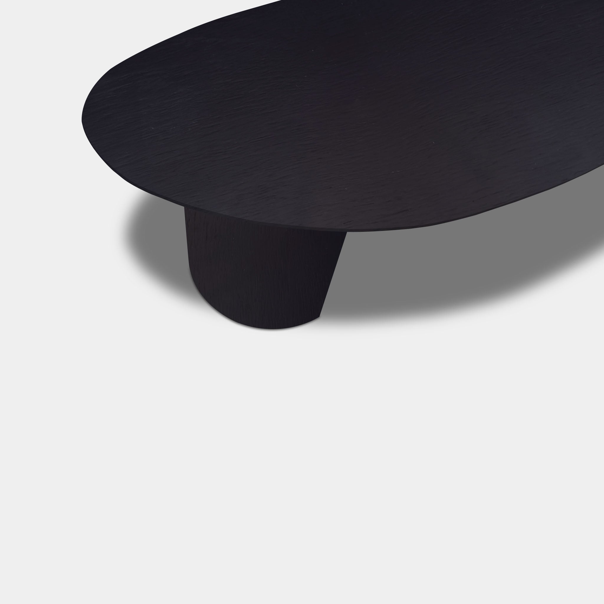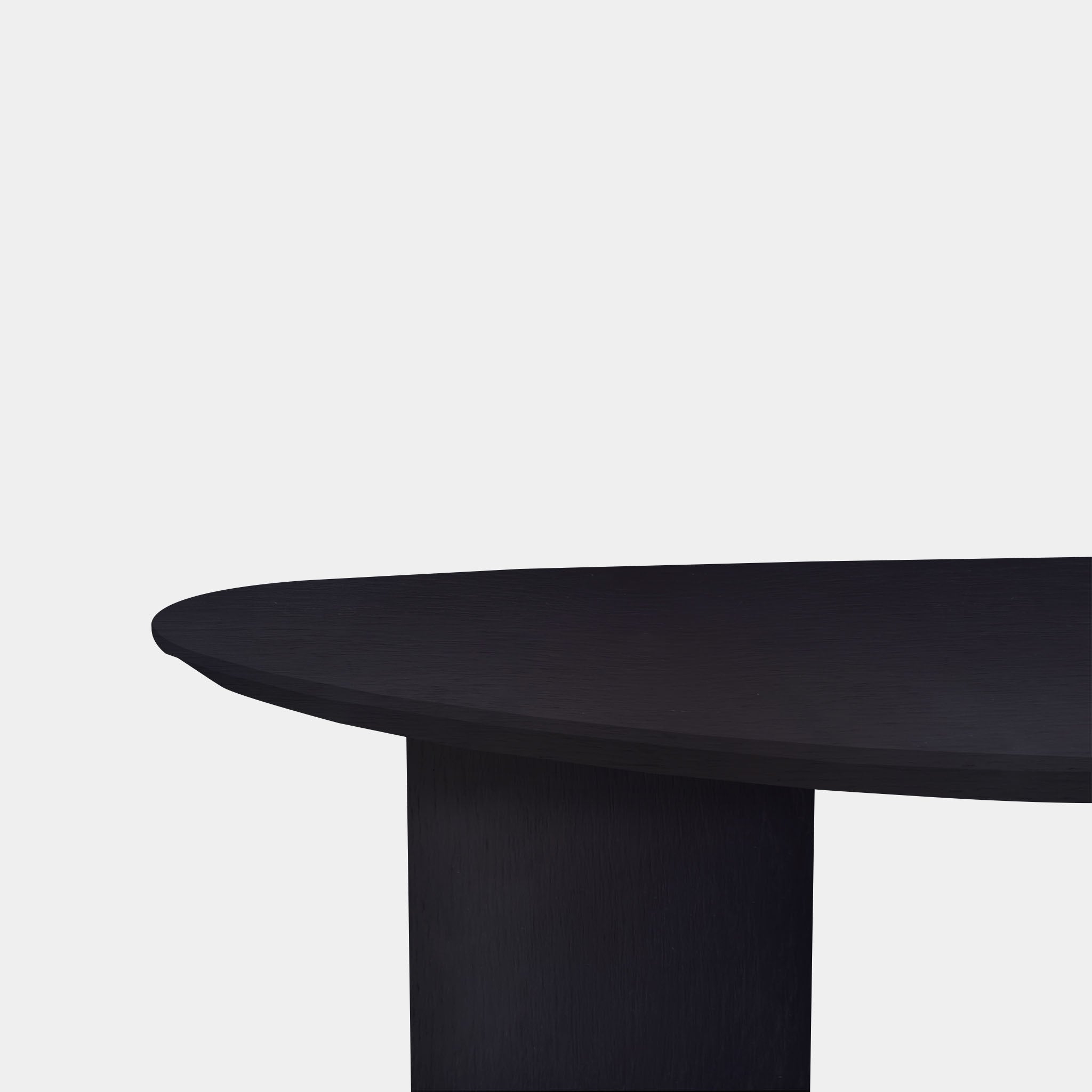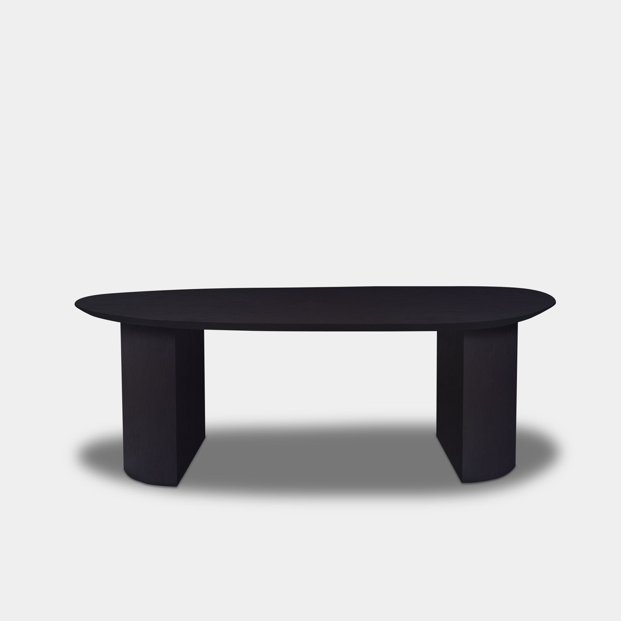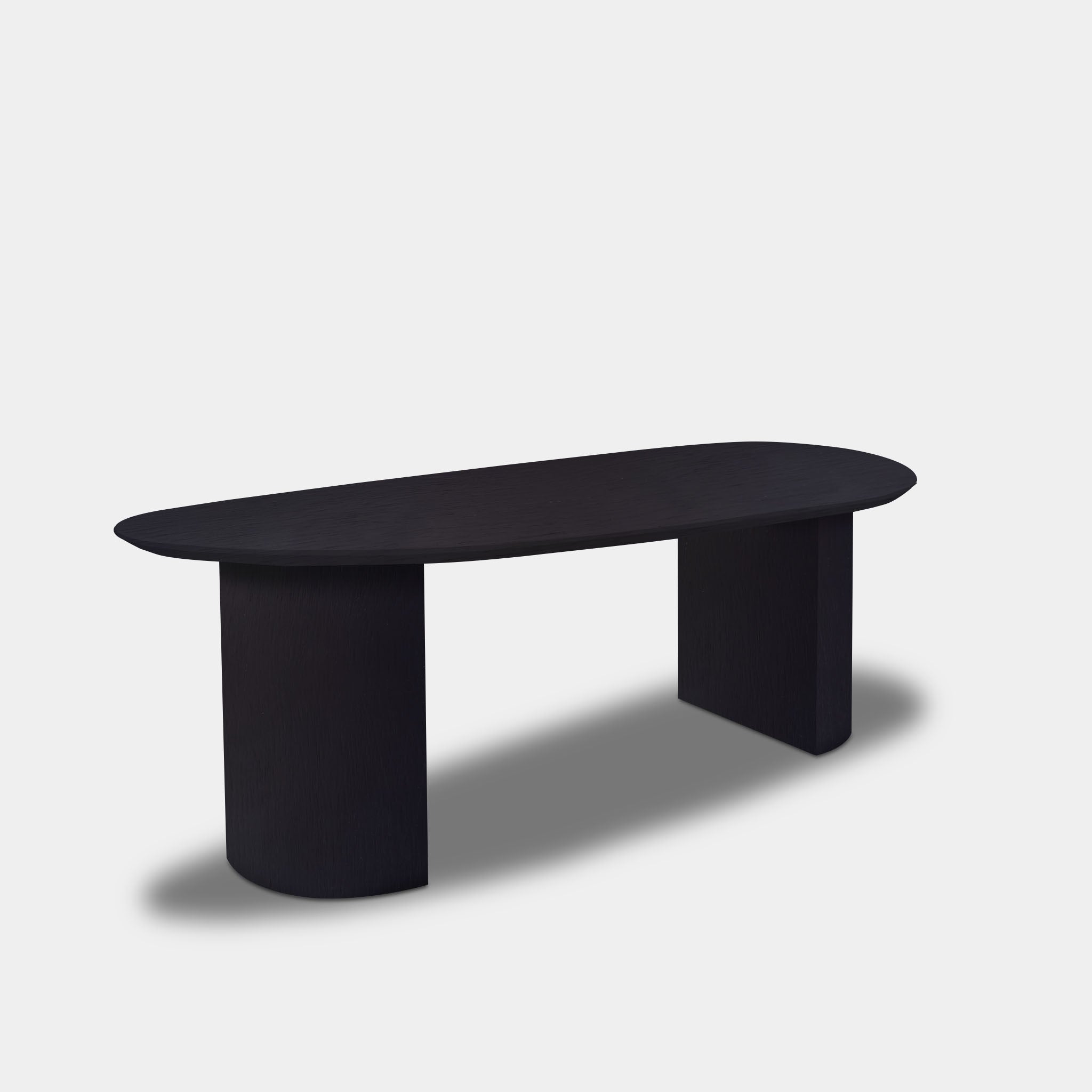 This robust and elegant, organically shaped table, crafted from solid oak and finished in the deep, classic Dark Oak color, exudes strength, craftsmanship, and timeless beauty. The undulating, naturally shaped top gives the table a soft, organic look, while the semi-circular base, spray-painted in the same color, provides a sturdy and visually balanced foundation.