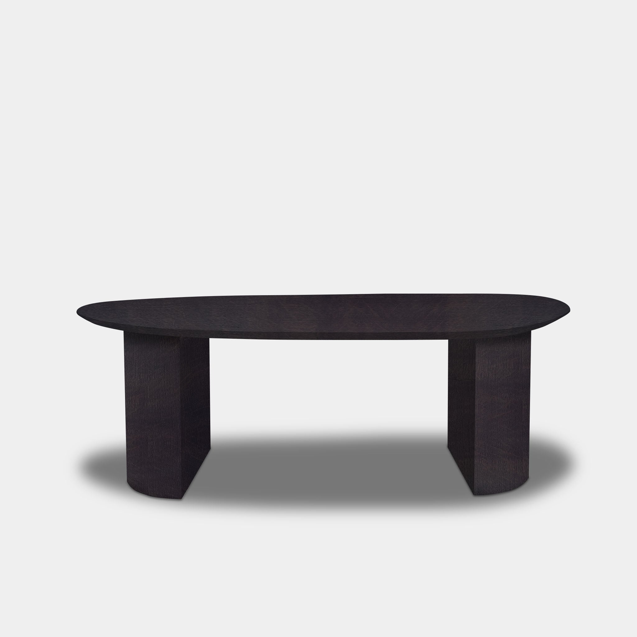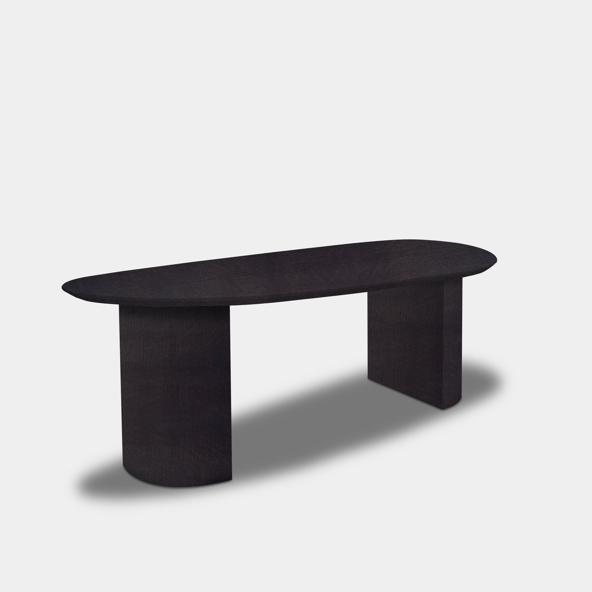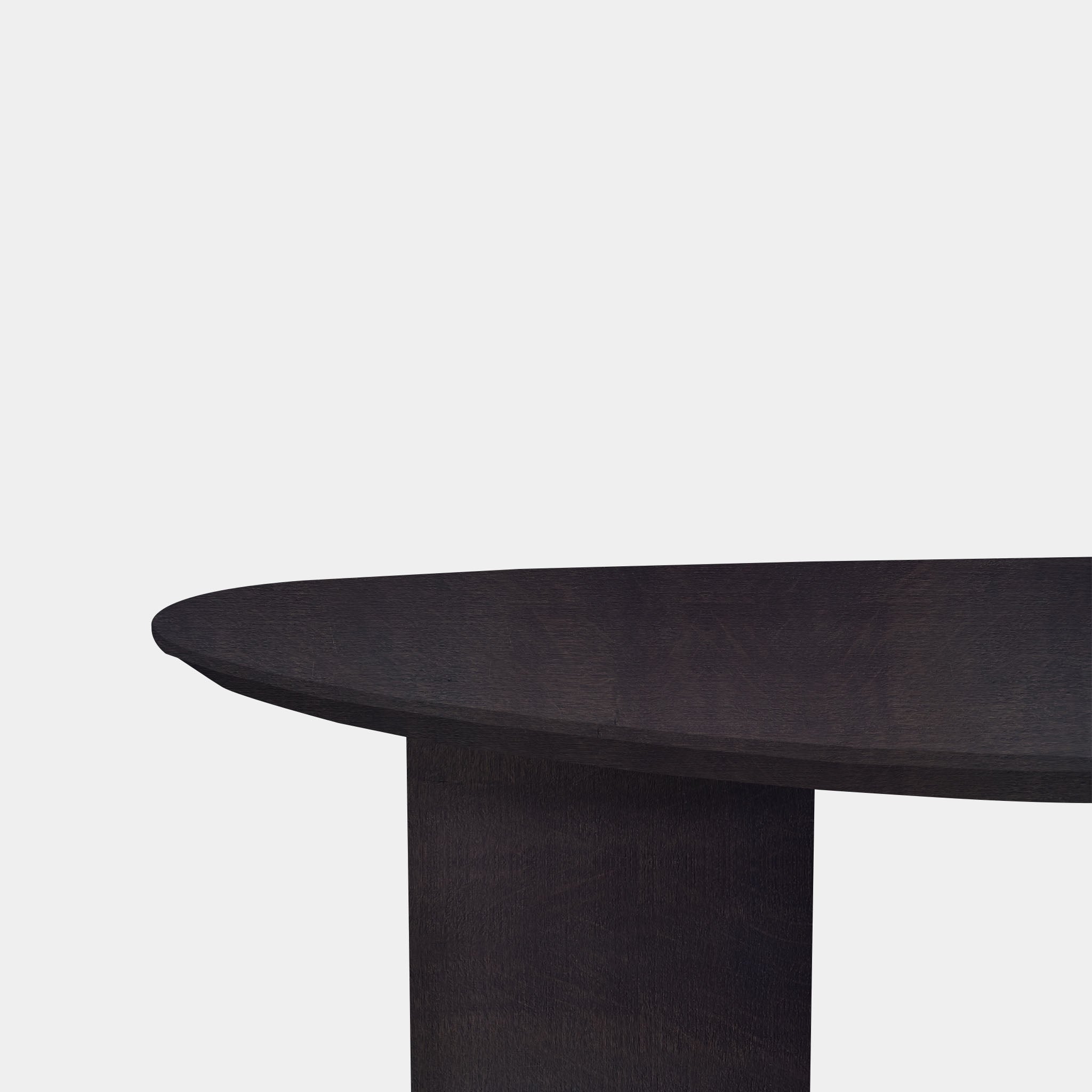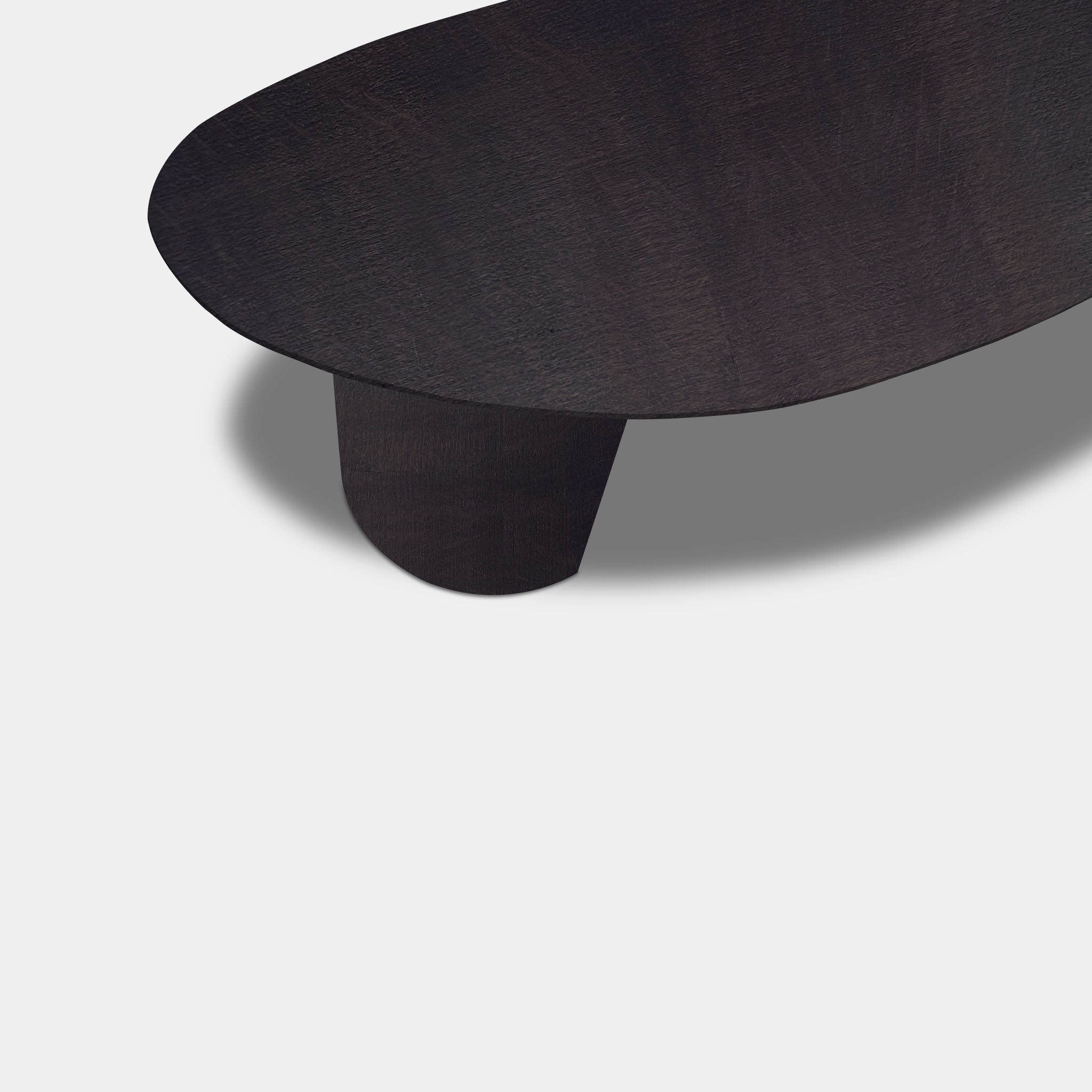 This atmospheric, organically shaped table made of solid oak, finished in the deep and warm Night Glow color, combines natural elegance and modern craftsmanship. The flowing, asymmetrical top creates a soft and inviting look, while the semi-circular base, spray-painted in the same color, creates a strong and stylish foundation.