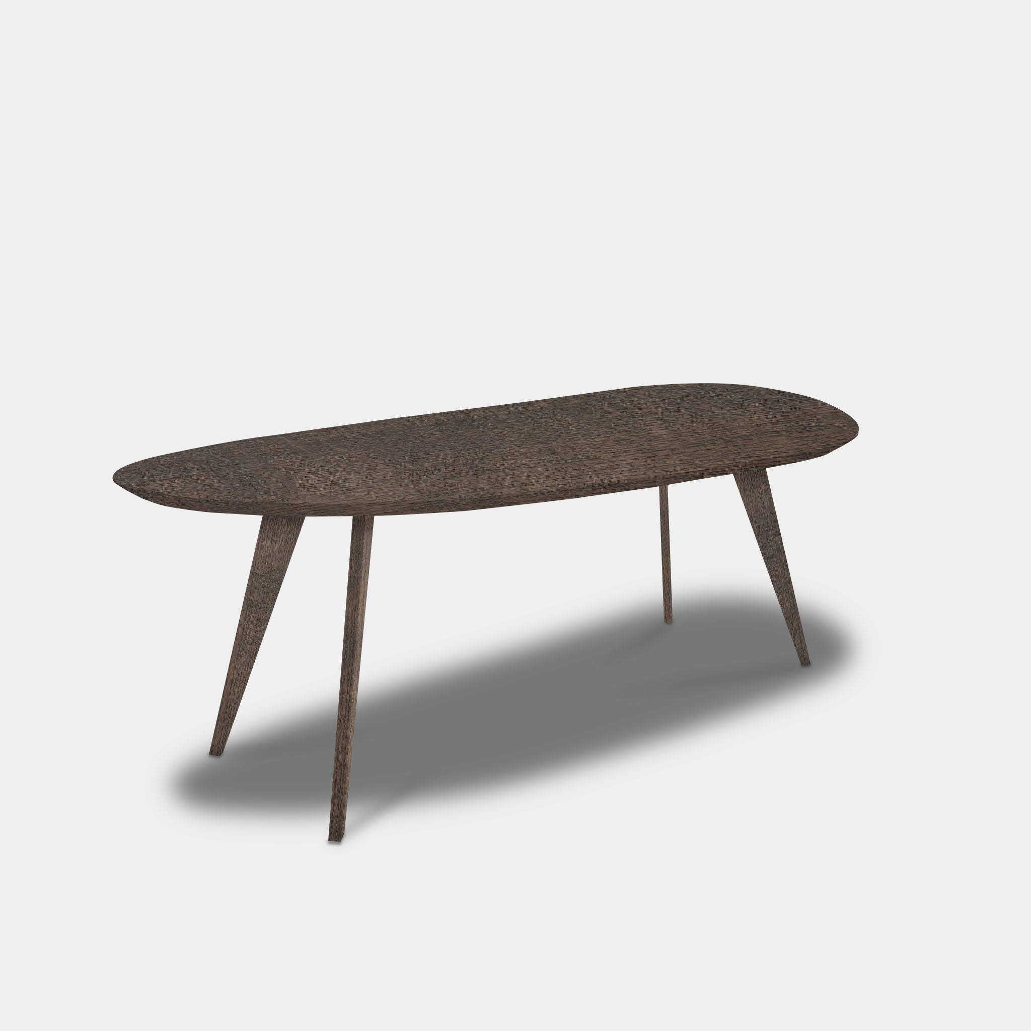 This light and refined, organically shaped table made of solid oak, finished in the natural color Sand, combines tranquility and elegance with a handcrafted design. The flowing top with soft, asymmetrical lines creates an inviting profile, while the solid wood base, spray-painted in the same color, creates a solid and harmonious whole.