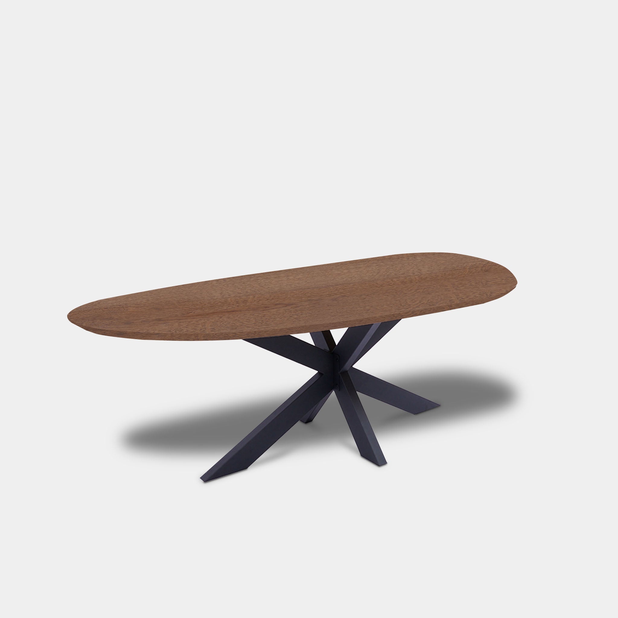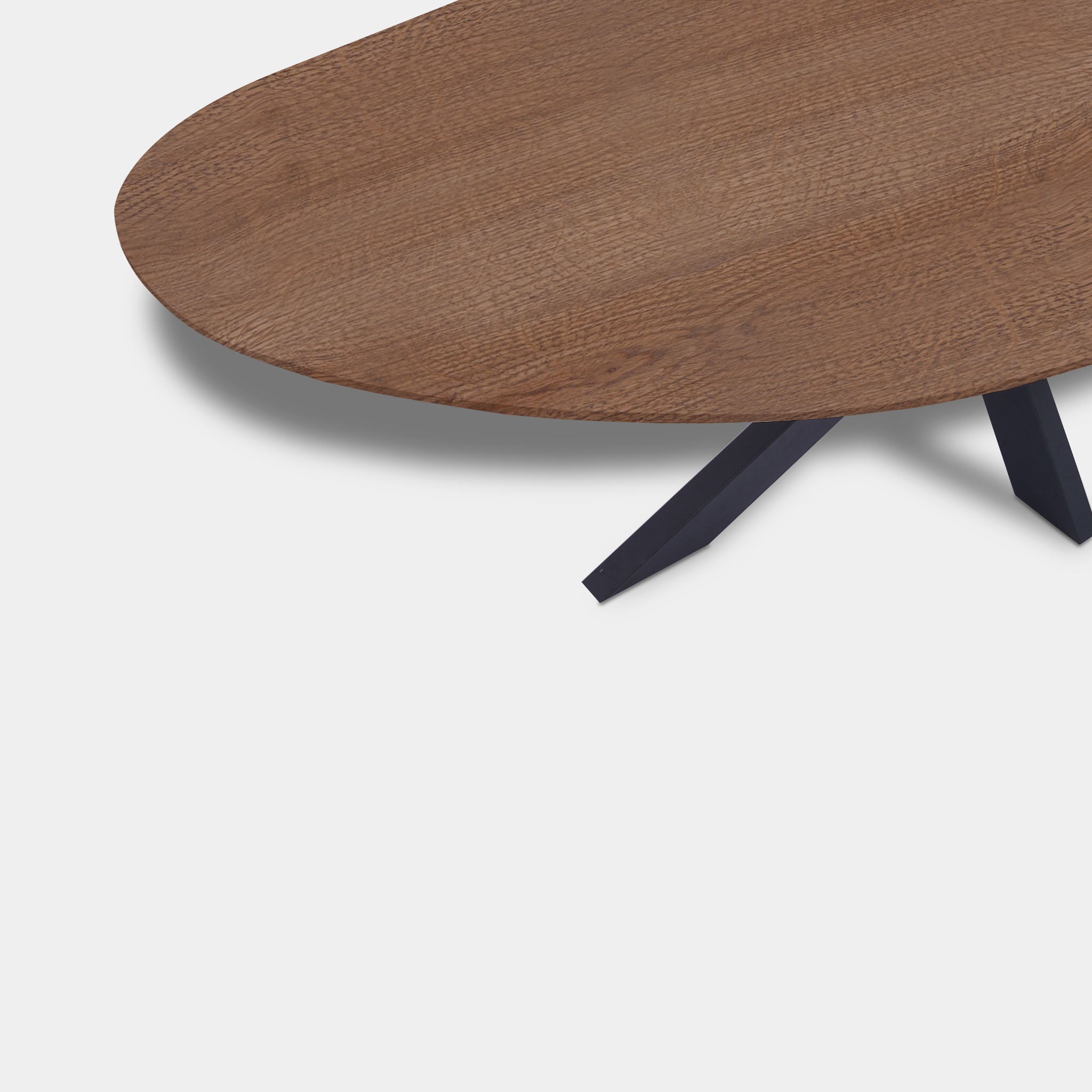 This warm and characterful, organically shaped table in solid oak, finished in the atmospheric Cinnamon color, perfectly combines soft craftsmanship and modern design. The undulating, natural lines of the top create a playful and inviting shape, while the sturdy black powder-coated steel matrix base provides a stylish and robust foundation.