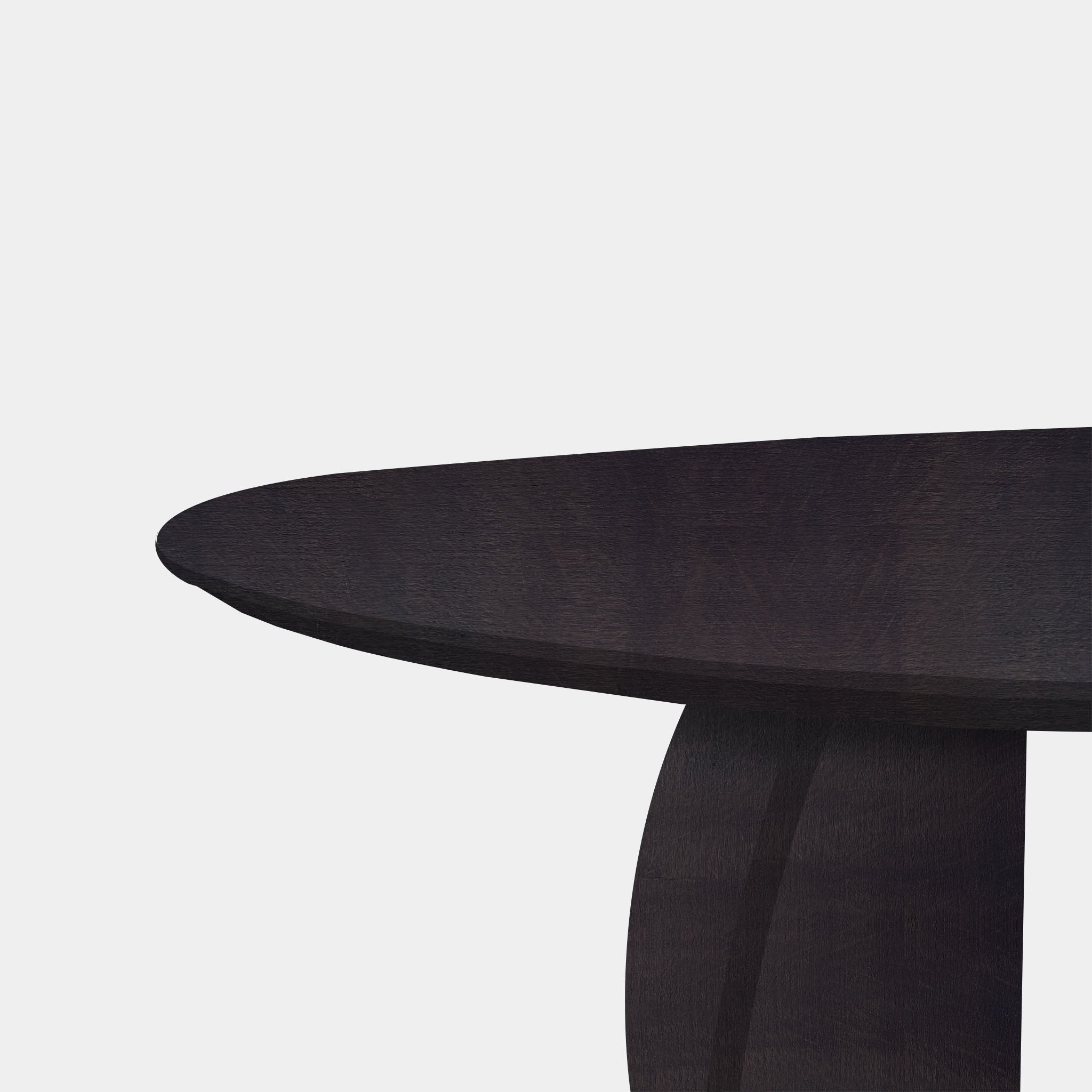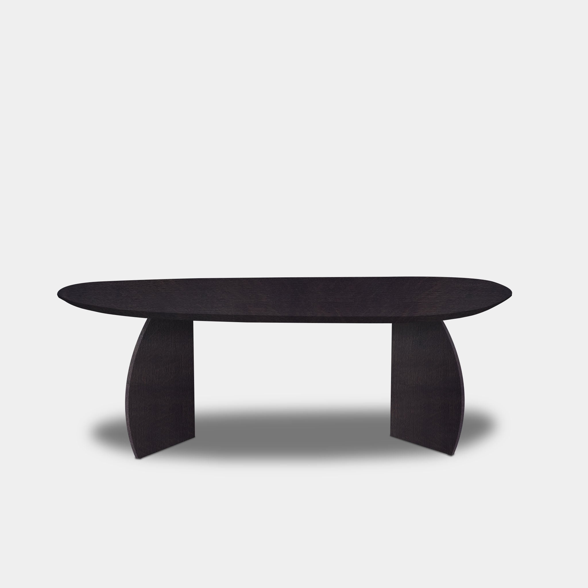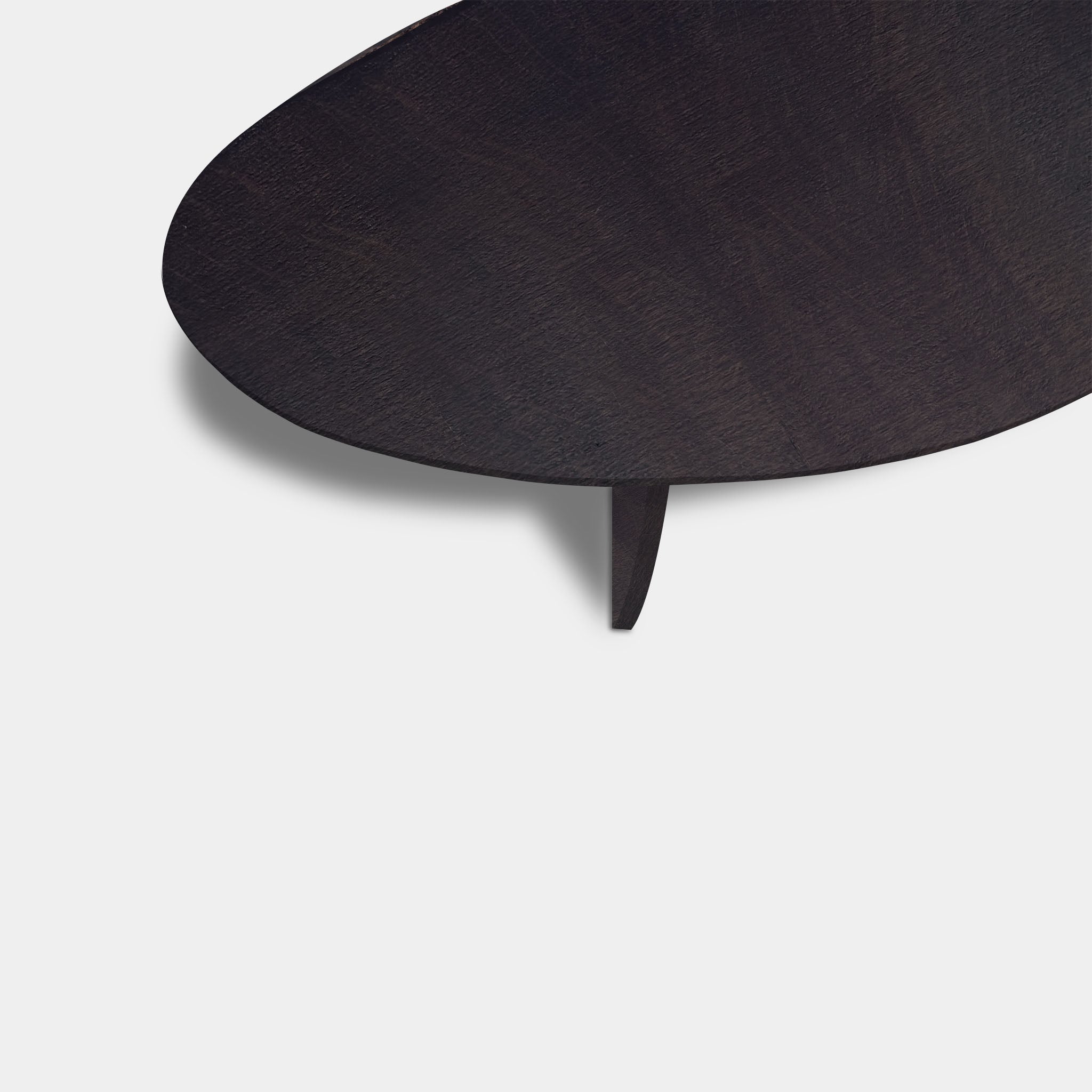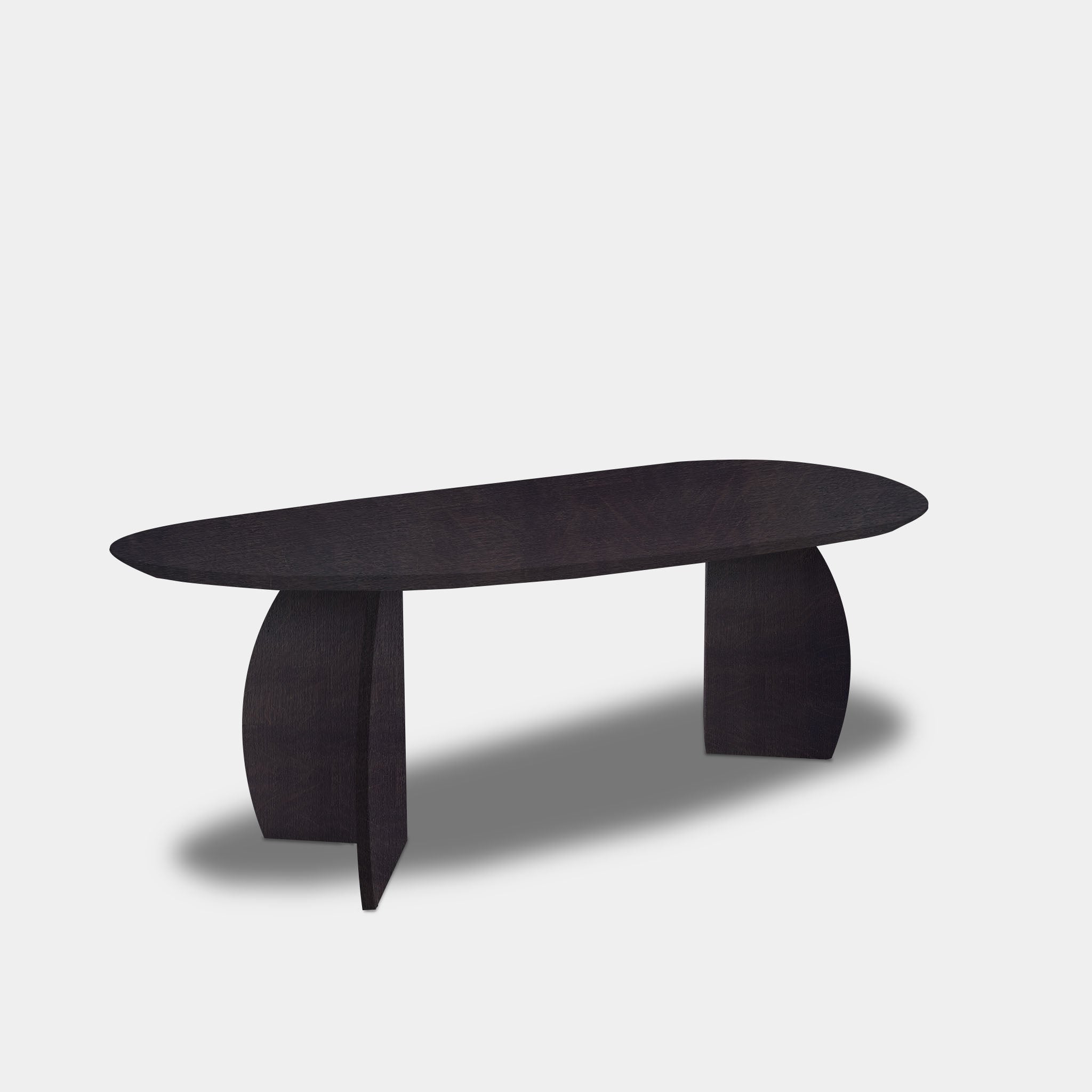 This atmospheric, organically shaped table made of solid oak, finished in the deep, warm Night Glow color, combines playful elegance with timeless class. The undulating, naturally shaped top creates a soft, dynamic look, while the pair of triangular legs, spray-painted in the same shade, create a stable and visually powerful whole.