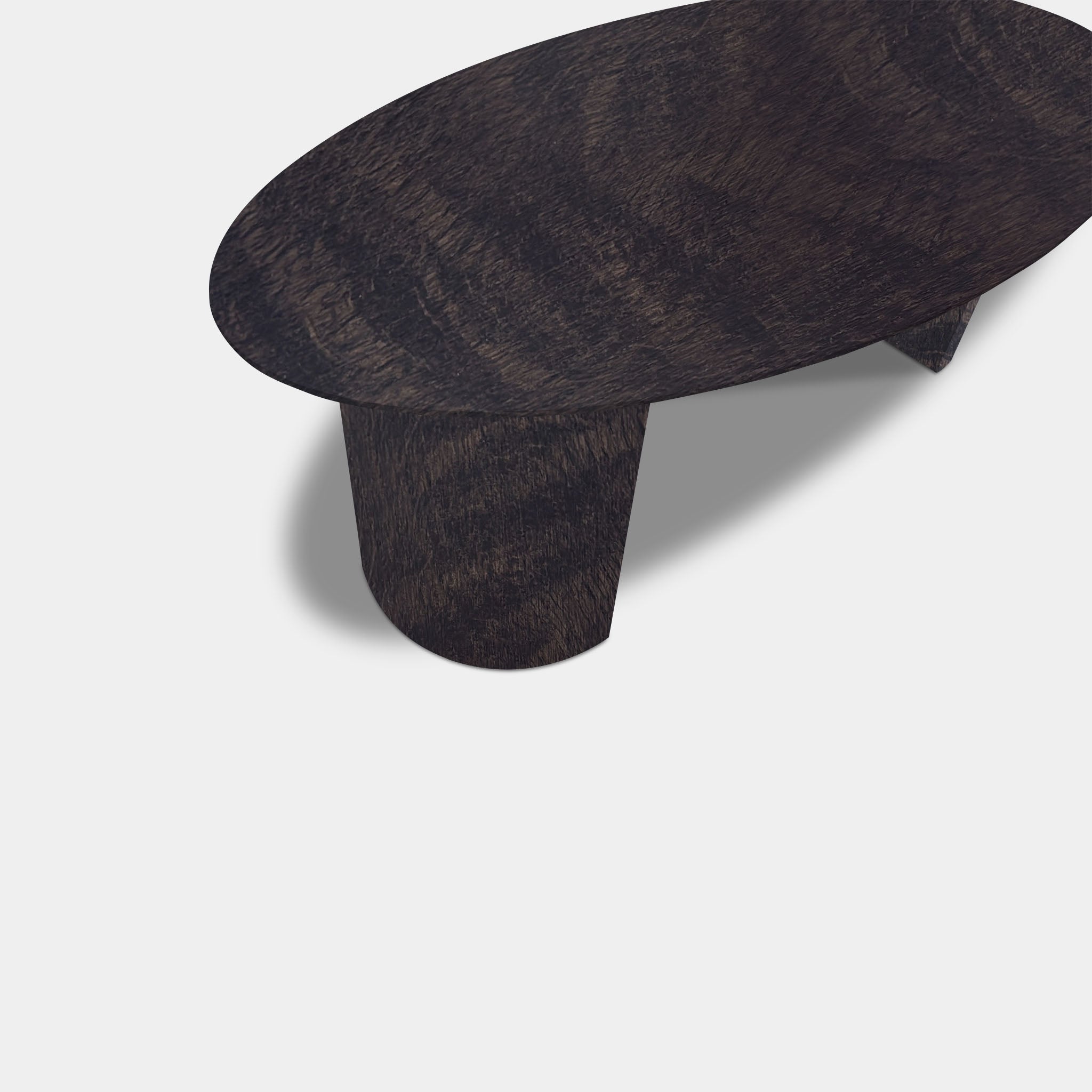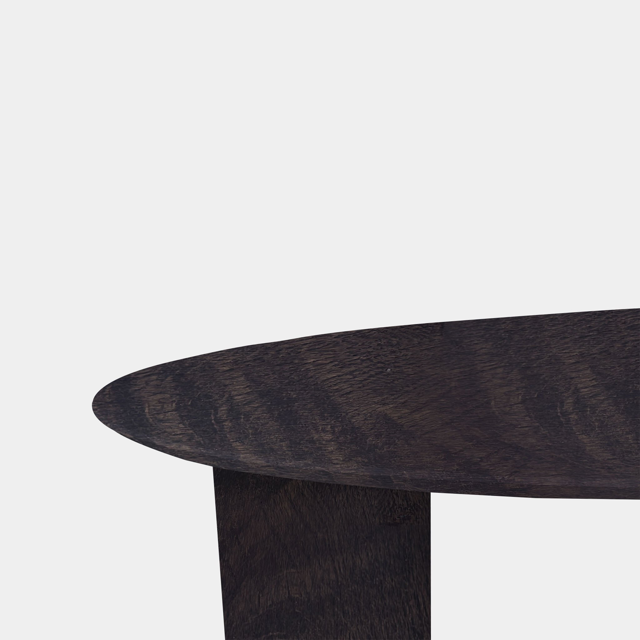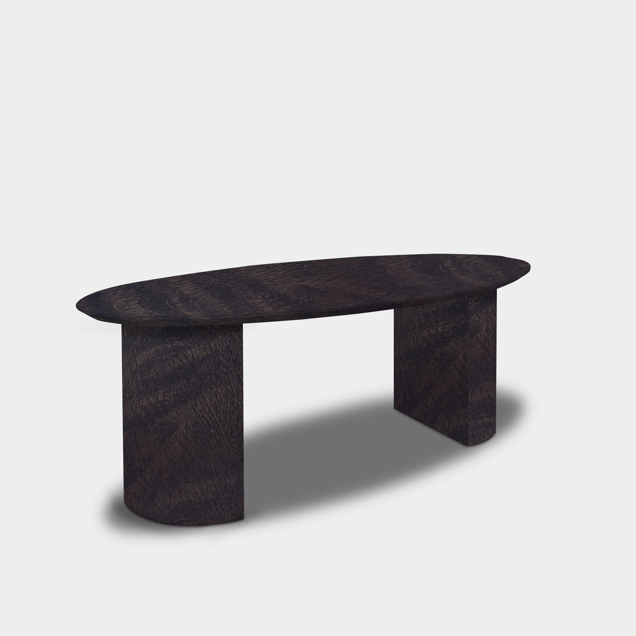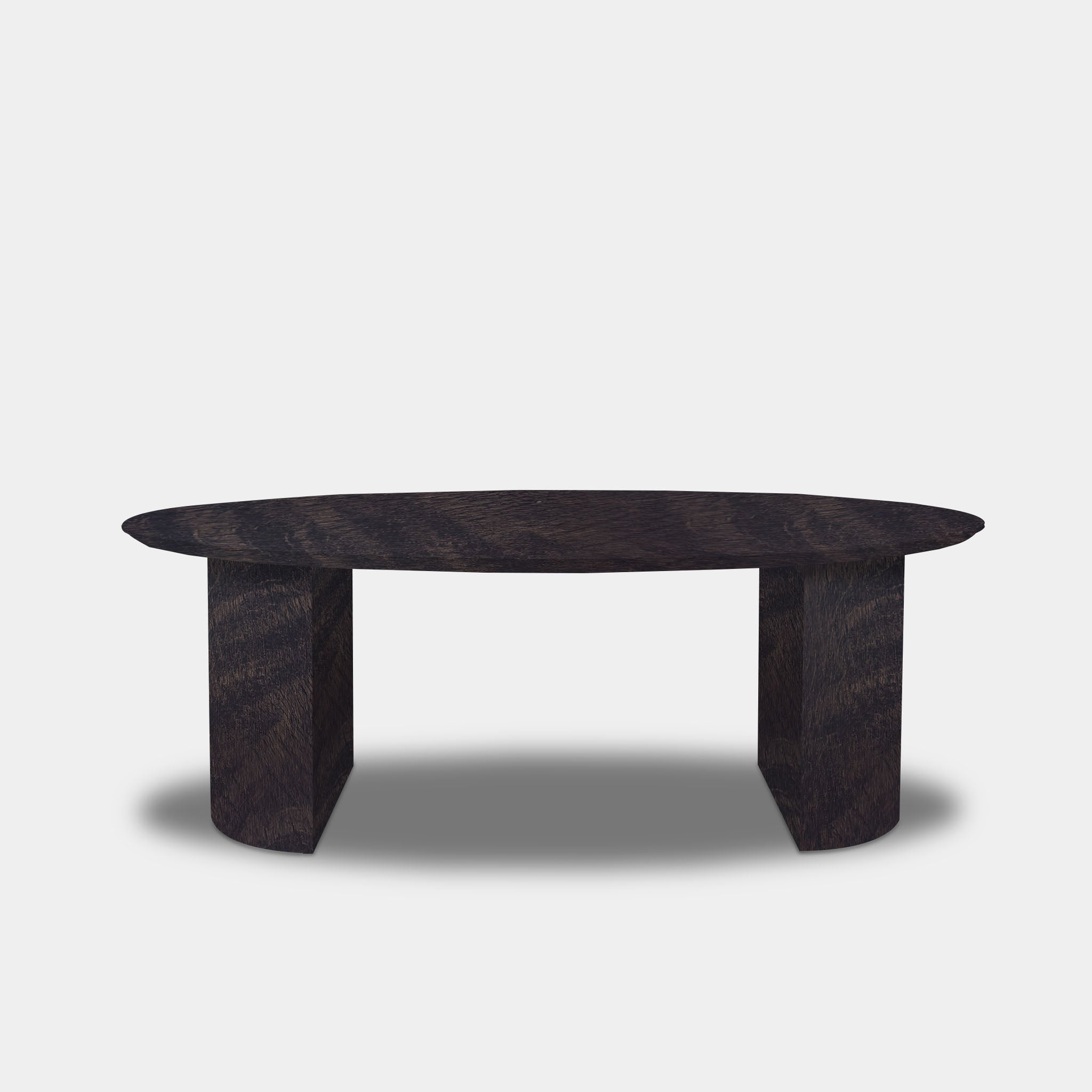 This elegant oval table, crafted from solid oak and finished in the deep and stylish Dark Grey , exudes modern class and artisanal finesse. Its rounded, flowing shape creates a soft and harmonious profile, while the robust, semi-circular base, spray-painted in the same dark shade, provides stability and a strong overall look.