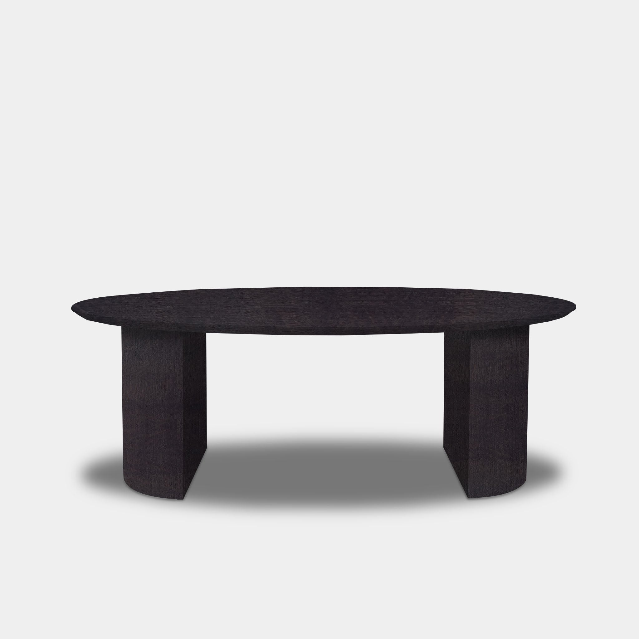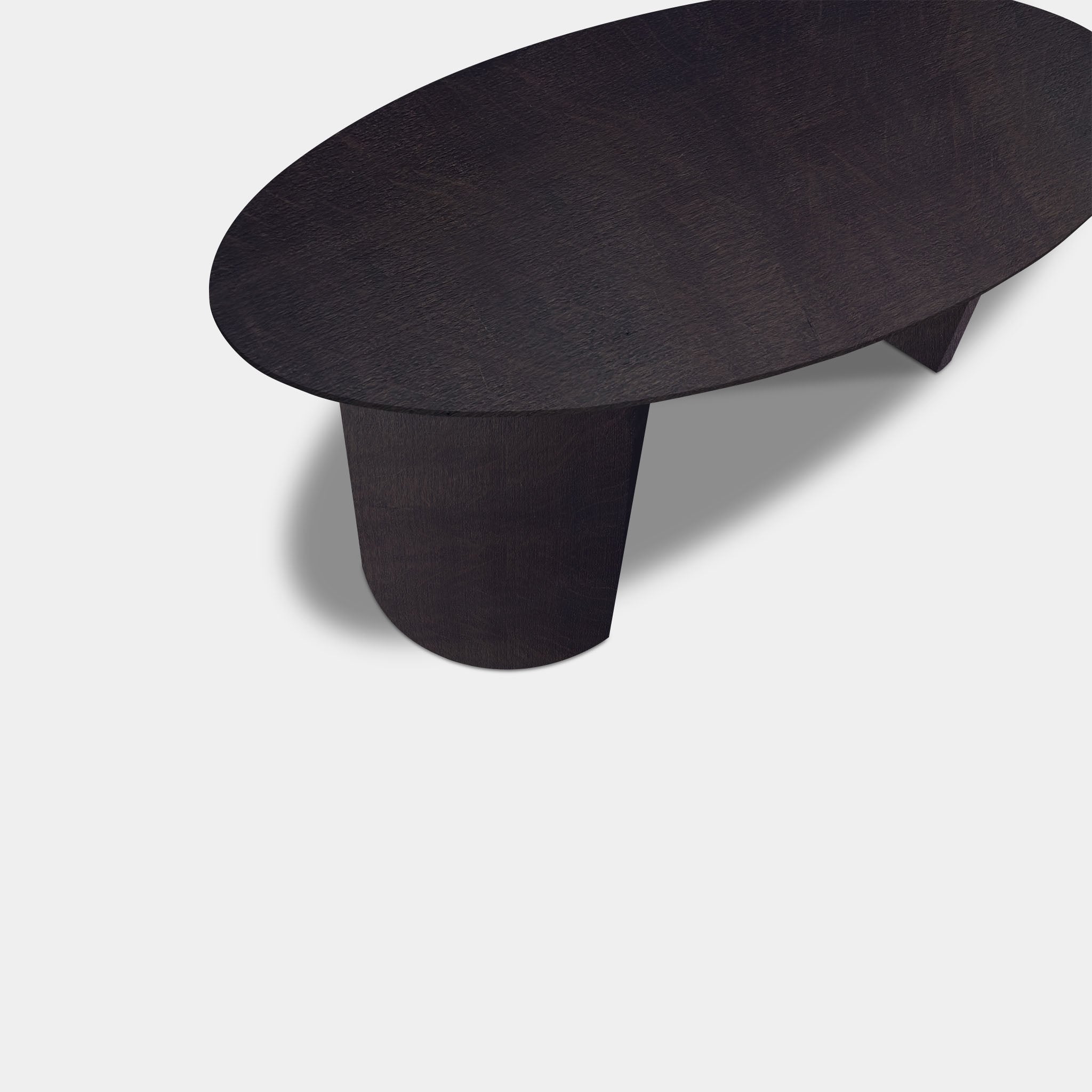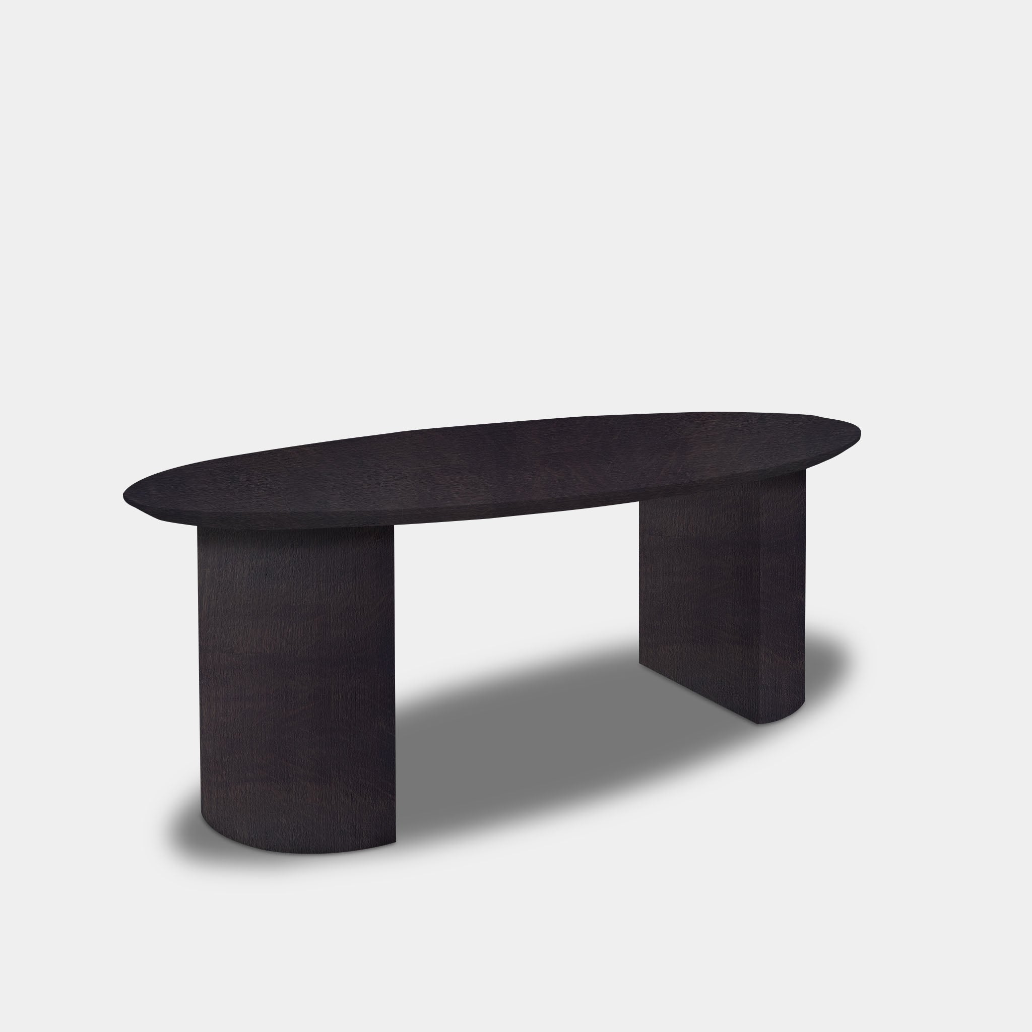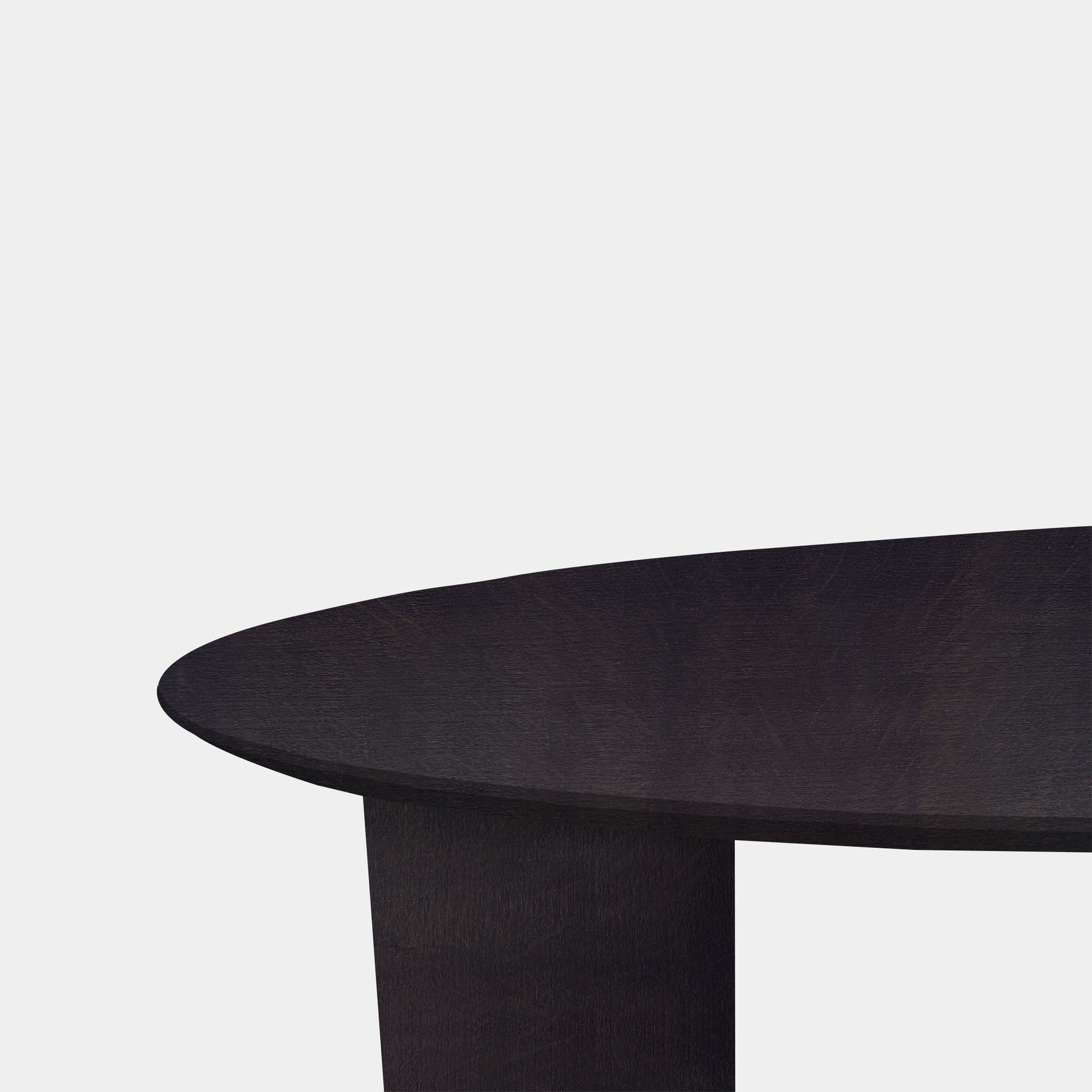 This atmospheric oval table, crafted from solid oak and finished in the deep, warm Night Glow color, exudes luxury, character, and tranquility. Its rounded, flowing shape creates an inviting and harmonious profile, while the robust, semi-circular base, spray-painted in the same color, creates a solid and visually powerful whole.