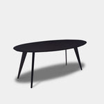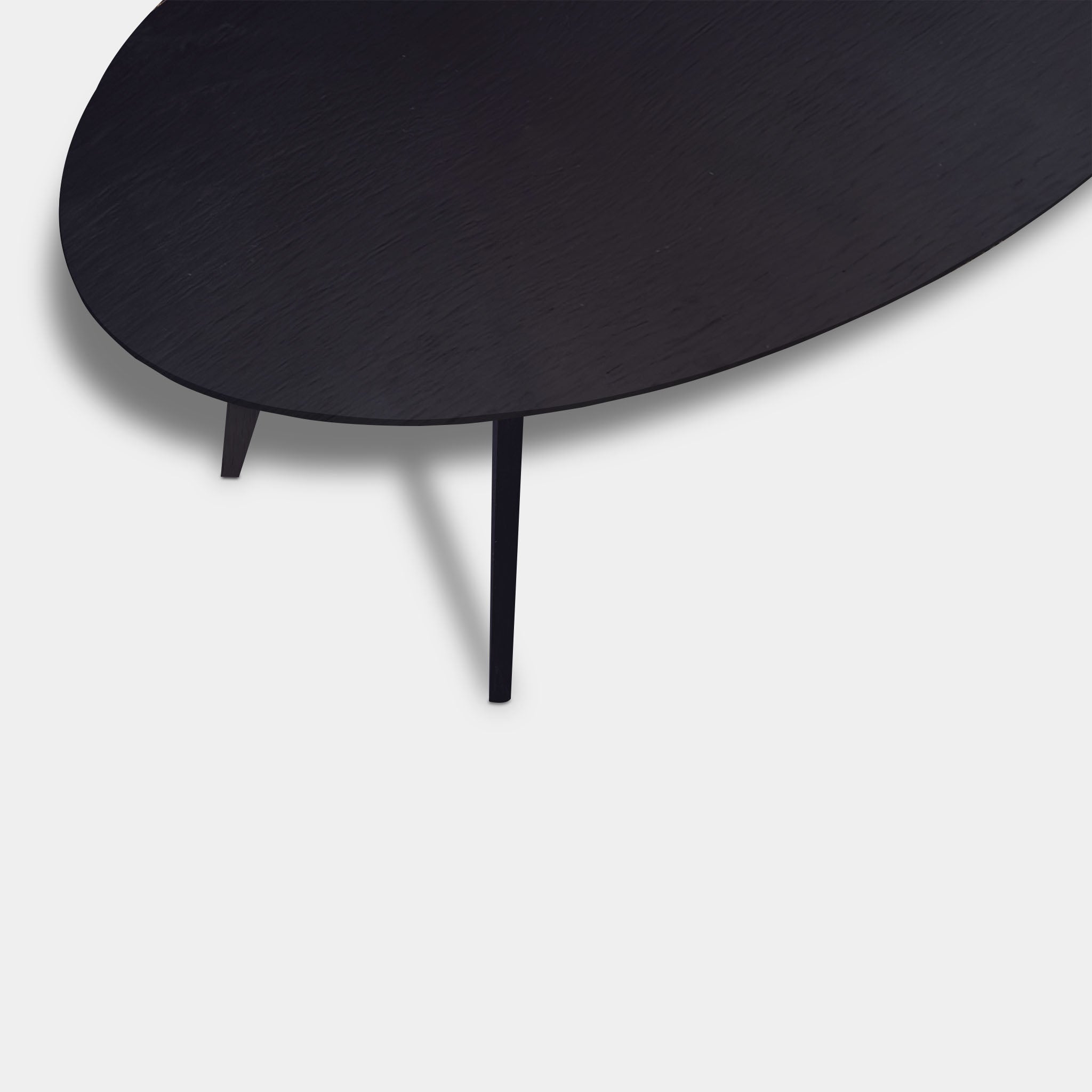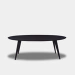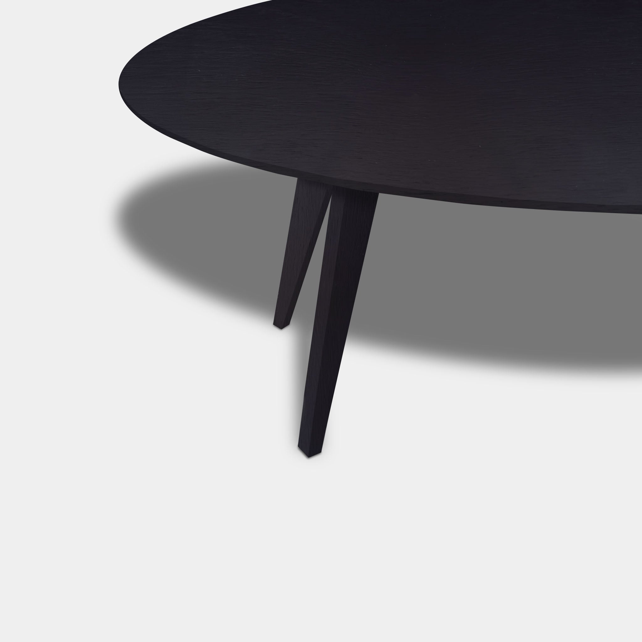 This impressive This oval table, crafted from solid oak and finished in a deep dark oak, exudes strength, elegance, and timeless craftsmanship. Its rounded, flowing shape gives the table a soft and inviting profile, while the sturdy, all-wood base, spray-painted in the same shade, creates a robust and visually balanced look.