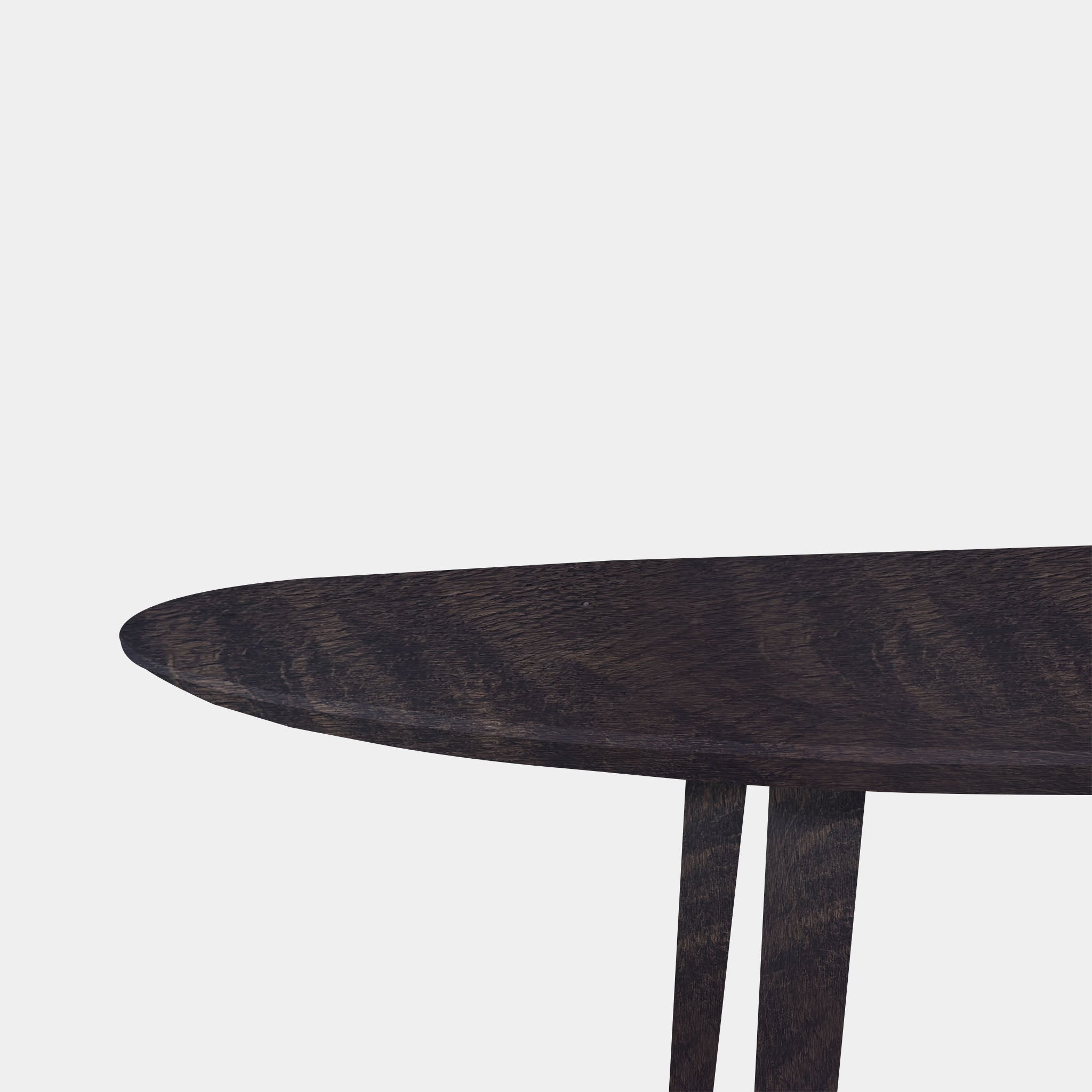 This modern and powerful oval table, crafted from solid oak and finished in a deep Dark Grey, combines contemporary elegance with natural robustness. Its rounded, flowing shape creates a sleek yet inviting profile, while the set of four tapered legs, painted in the same shade, creates a sleek and stable base with a uniform look.