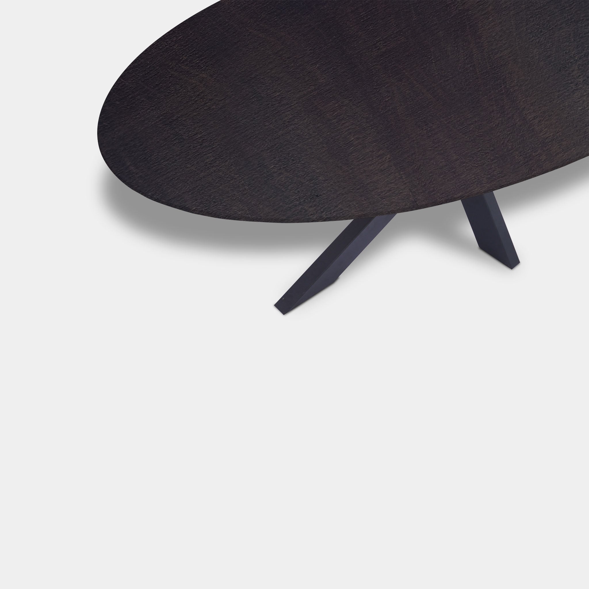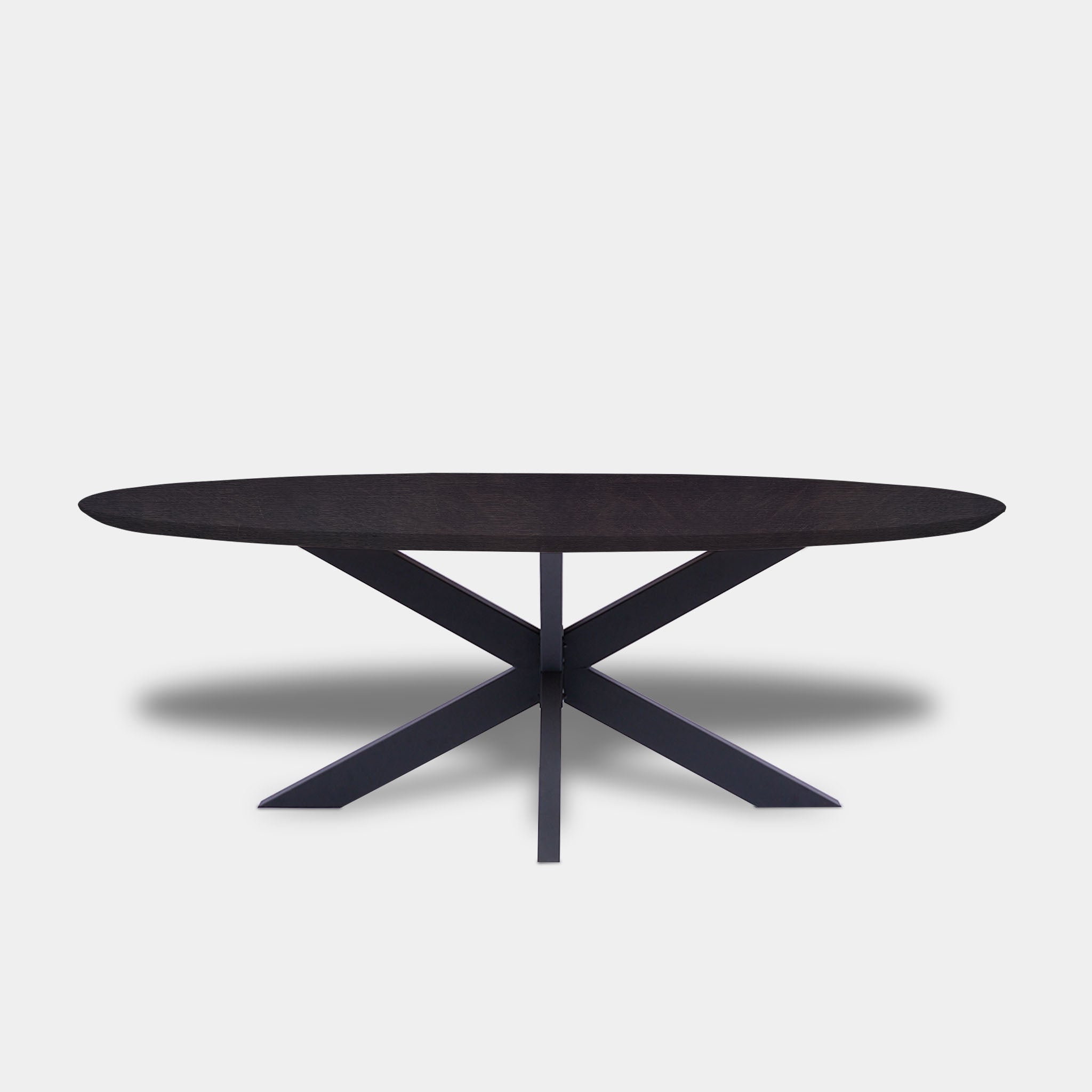 This atmospheric oval table, crafted from solid oak and finished in the deep, warm Night Glow color, exudes class, strength, and refined craftsmanship. Its elegant oval shape creates a soft and inviting look, while the robust black steel matrix base adds a solid, modern touch.