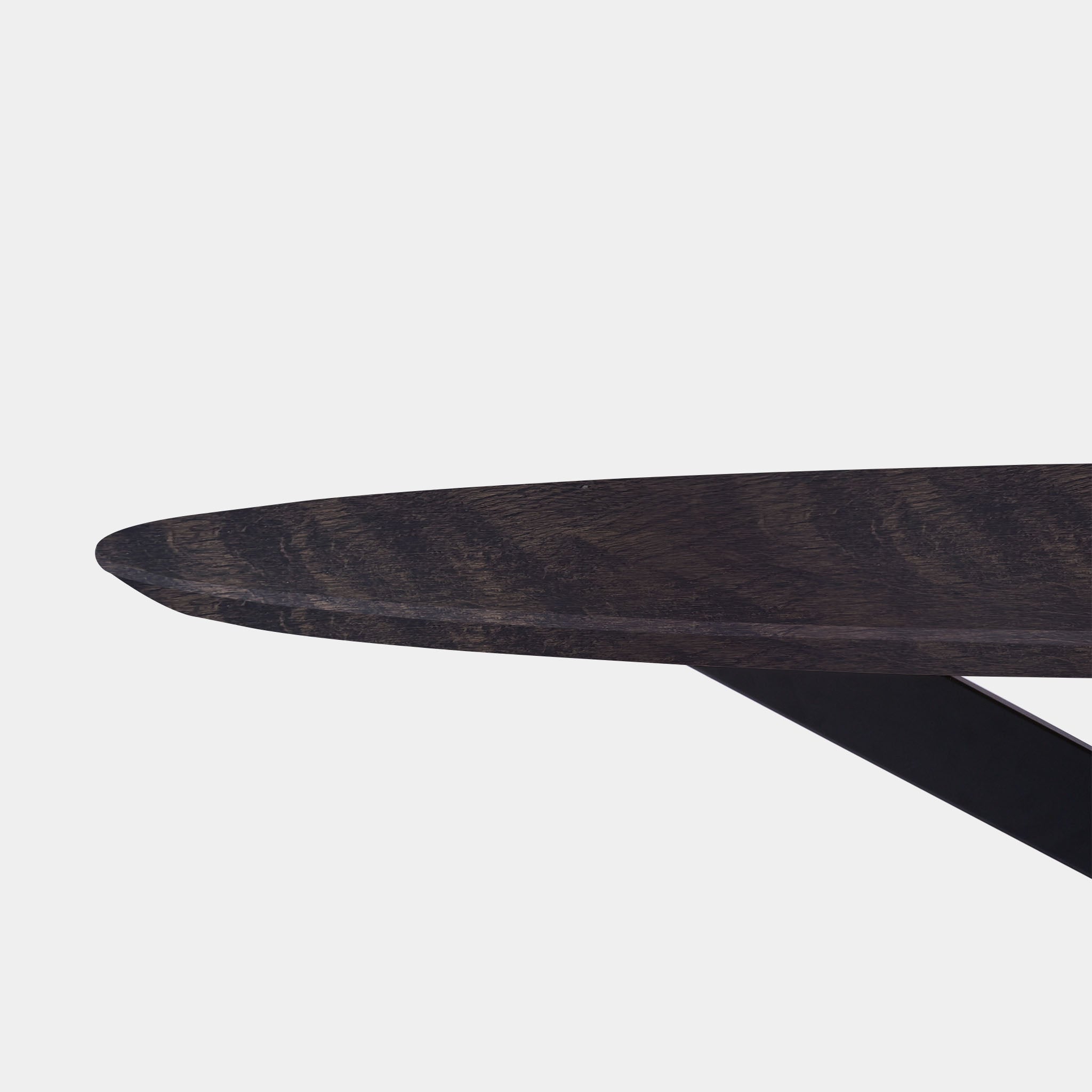 This modern and powerful oval table, crafted from solid oak and finished in a deep Dark Grey, combines contemporary design with natural robustness. The flowing oval shape creates a spacious and inviting feel, while the extra-wide Matrix XL base, made of black powder-coated steel, provides a sturdy and stable foundation.