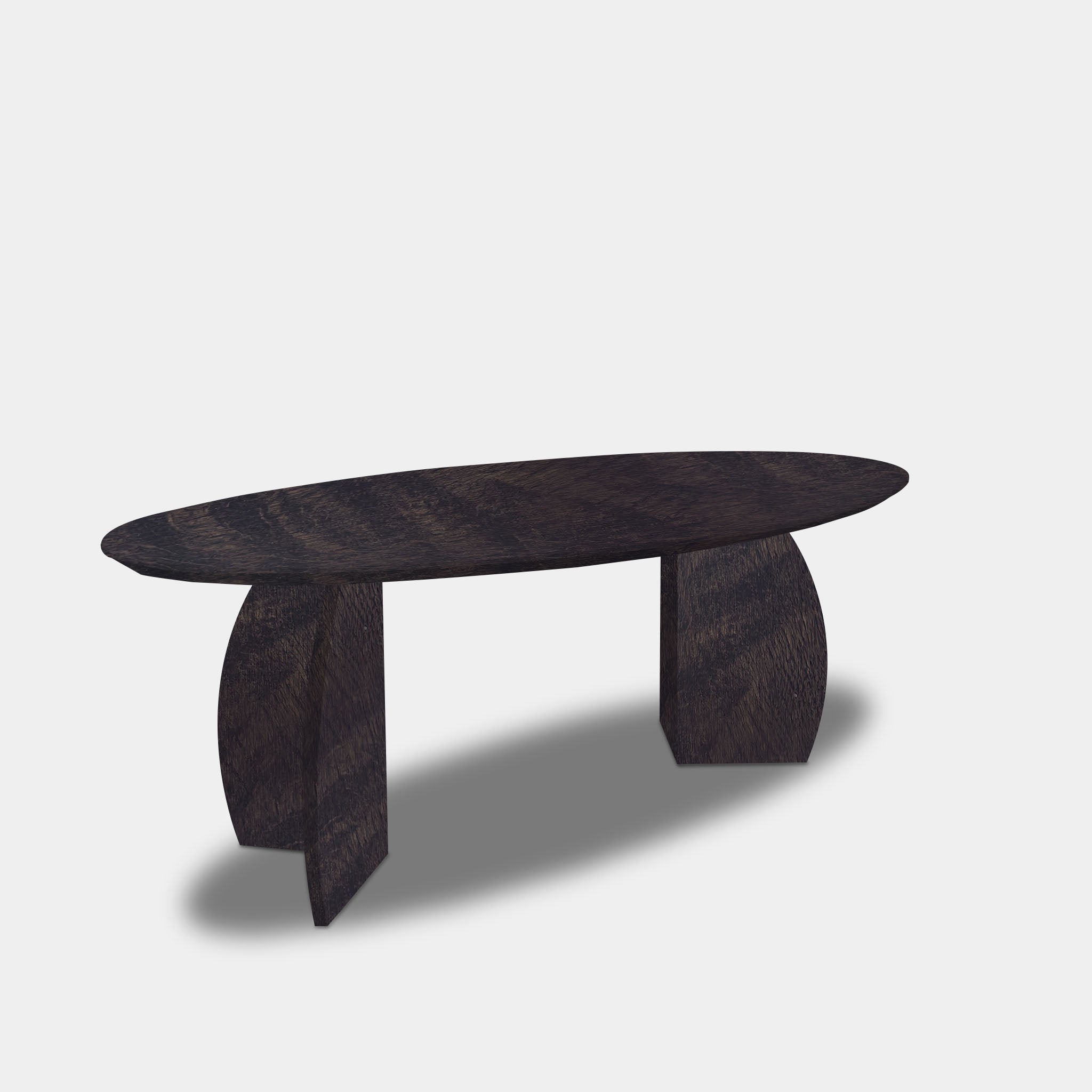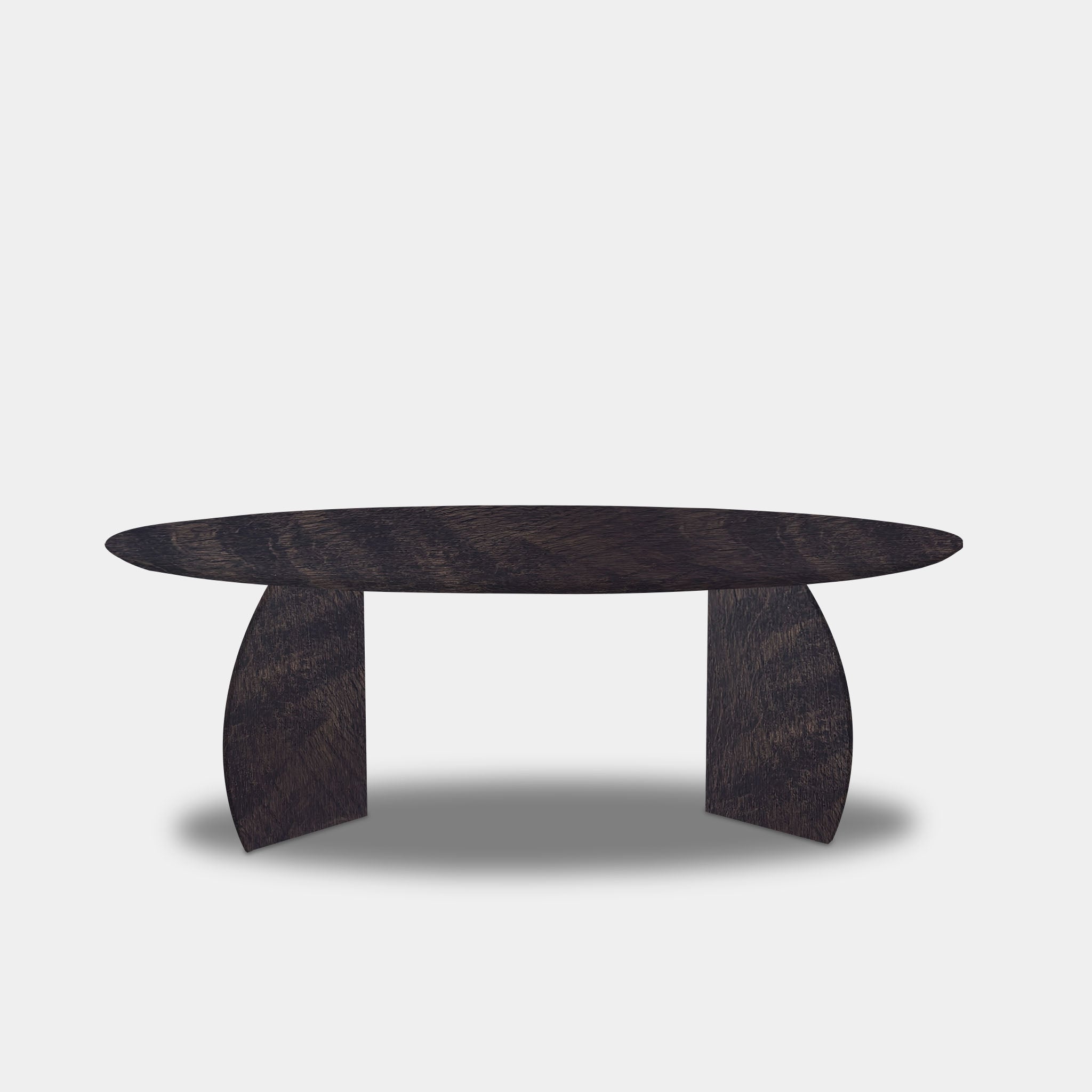 This powerful and modern oval table, crafted from solid oak and finished in a deep Dark Grey, combines contemporary style with natural materials. The rounded, flowing shape creates a sleek yet inviting look, while the pair of triangular legs, spray-painted in the same shade, creates a geometric and stable look.