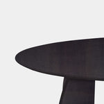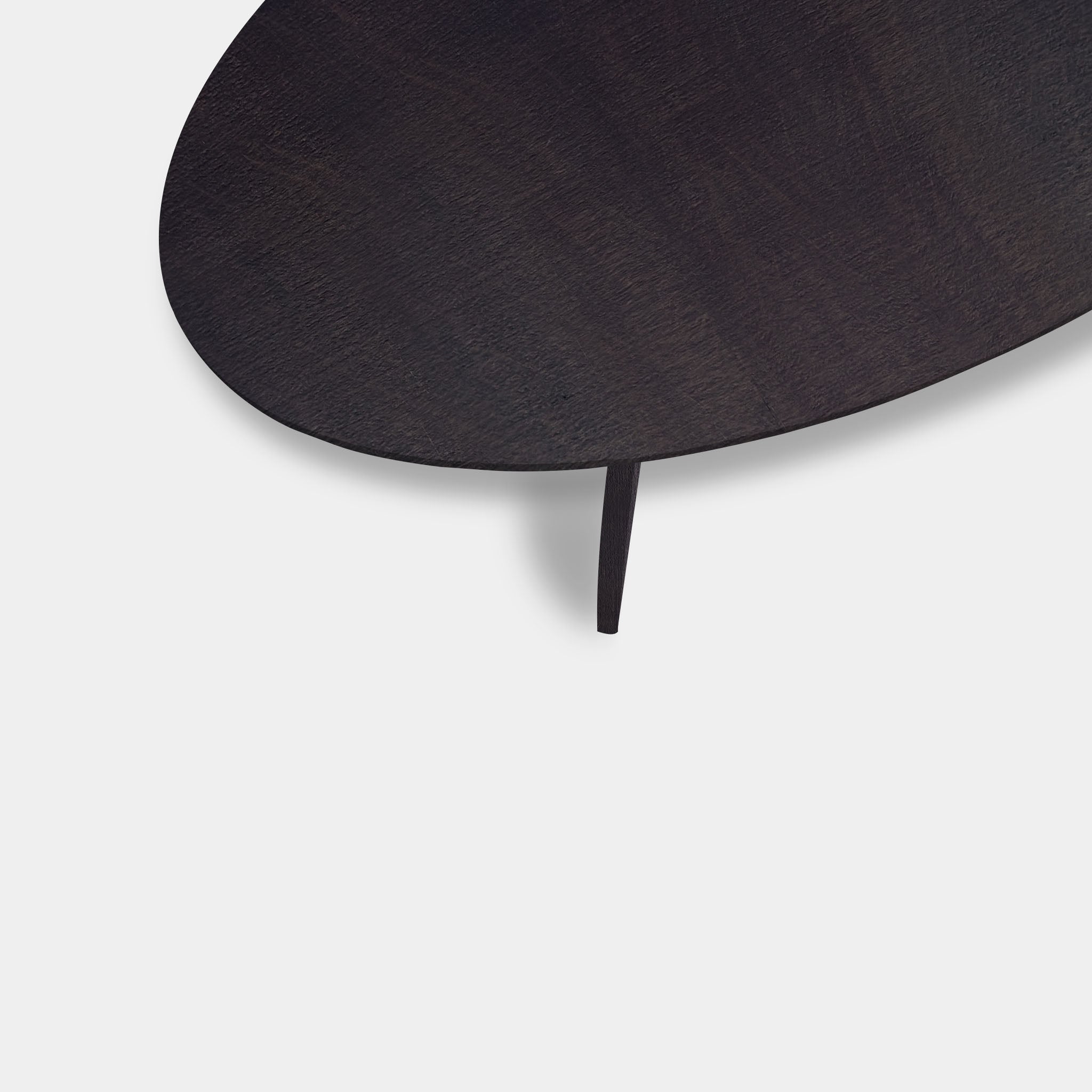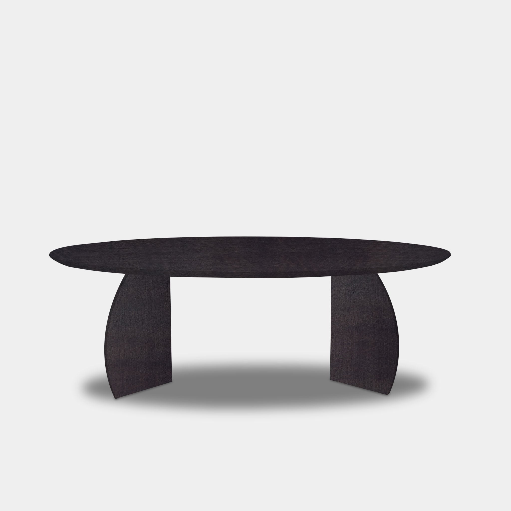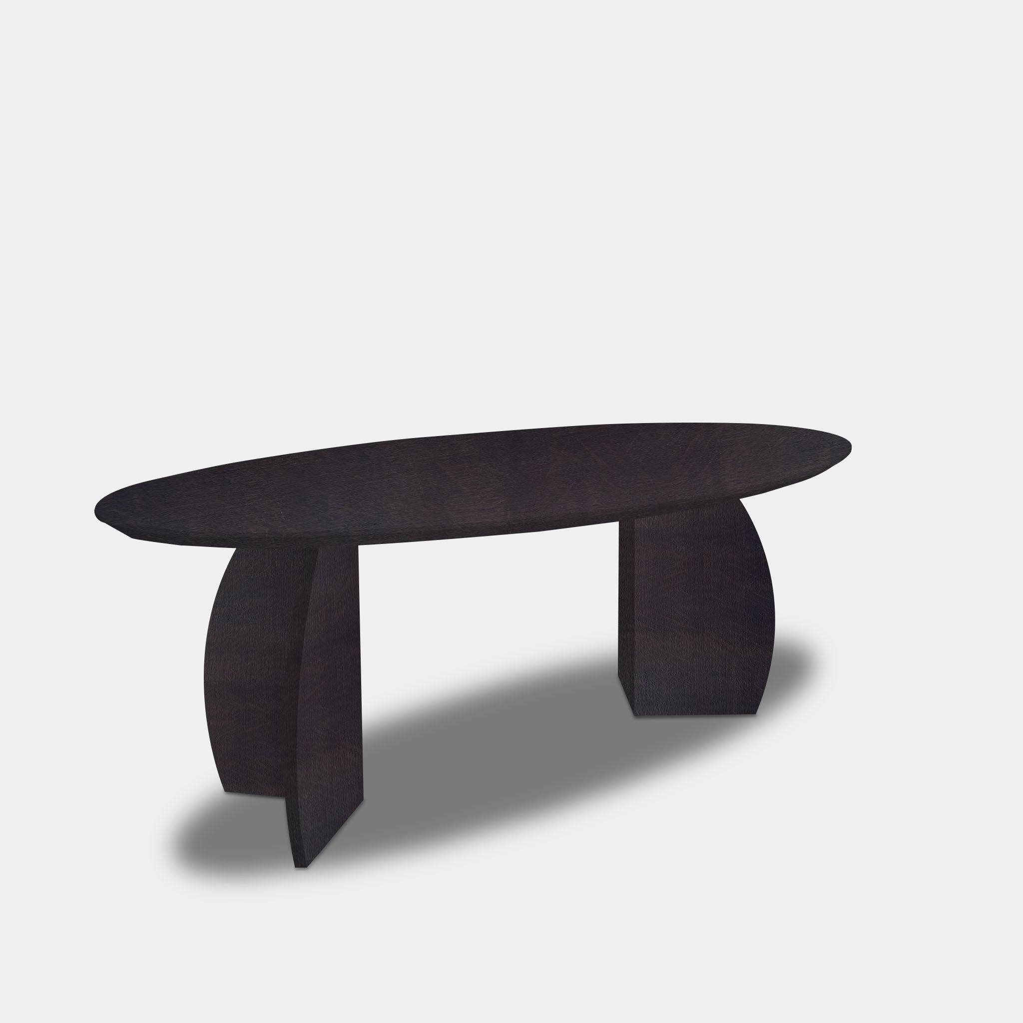 This atmospheric oval table, crafted from solid oak and finished in the deep, warm Night Glow color, combines character, elegance, and modern craftsmanship. Its rounded, flowing shape gives the table a soft and inviting appearance, while the pair of triangular legs, spray-painted in the same shade, creates a strong, stable base with a geometric flair.