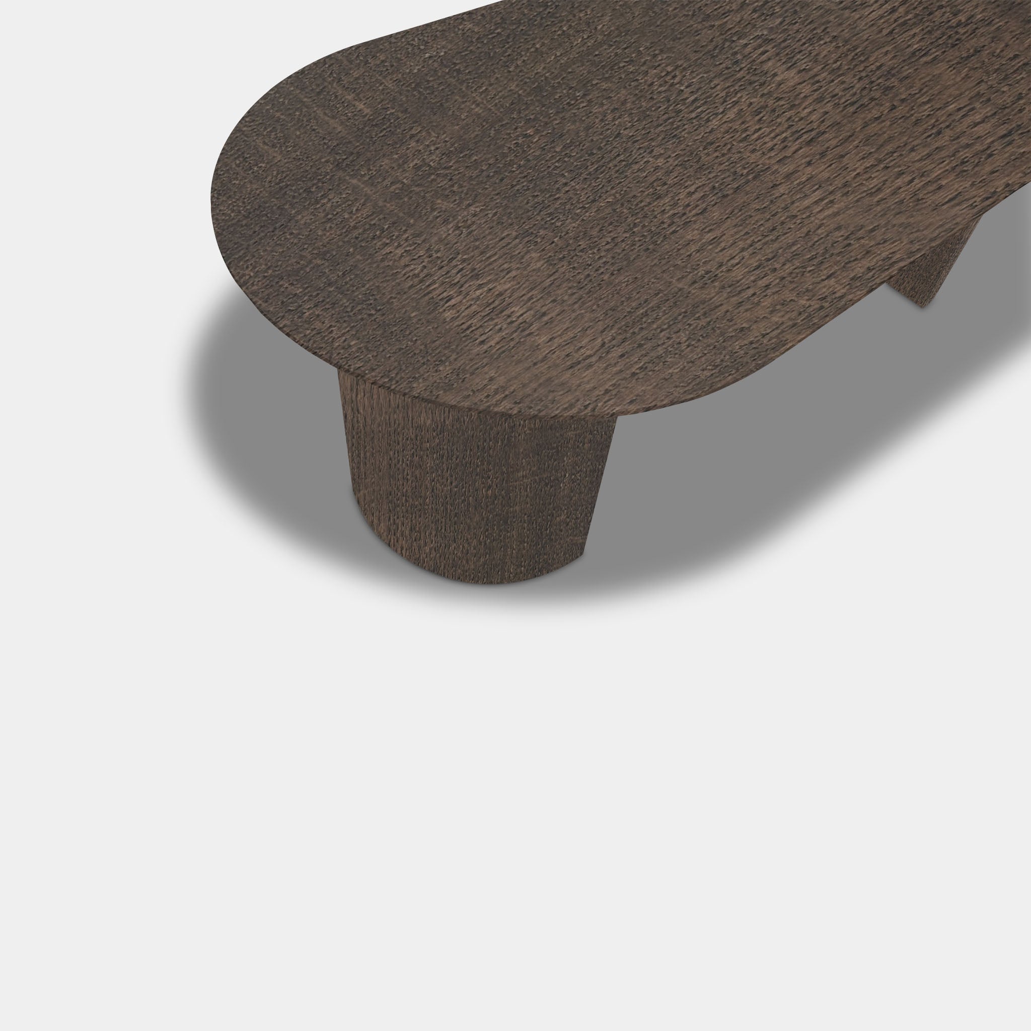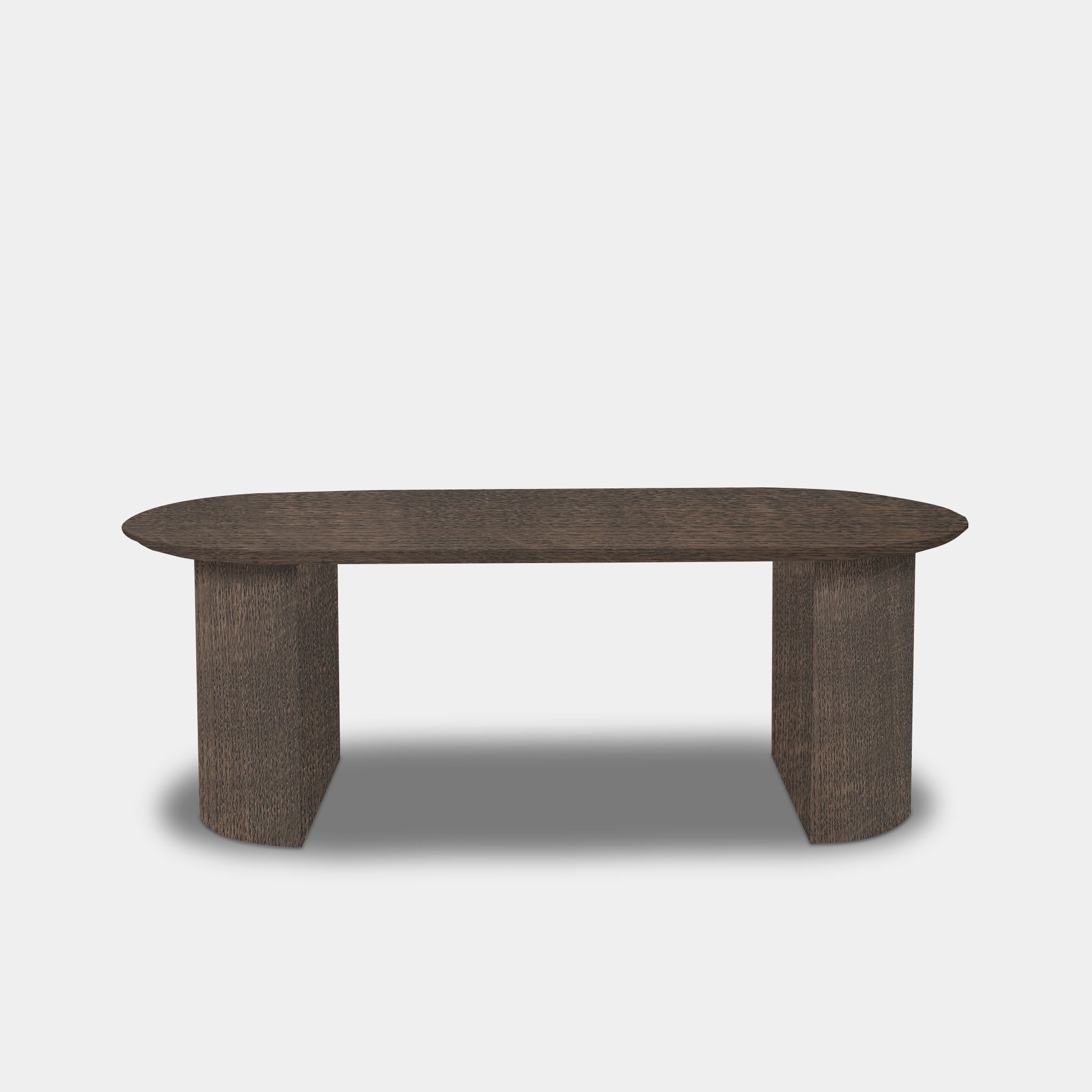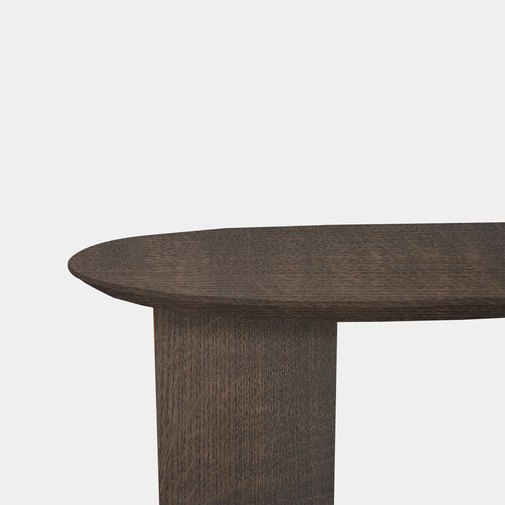 This light and refined flat oval table, crafted from solid oak and finished in a neutral Sand color, exudes tranquility, spaciousness, and natural elegance. The flattened oval shape creates a soft, contemporary silhouette, while the robust semi-circular base, painted in the same color, creates a strong and visually balanced foundation.