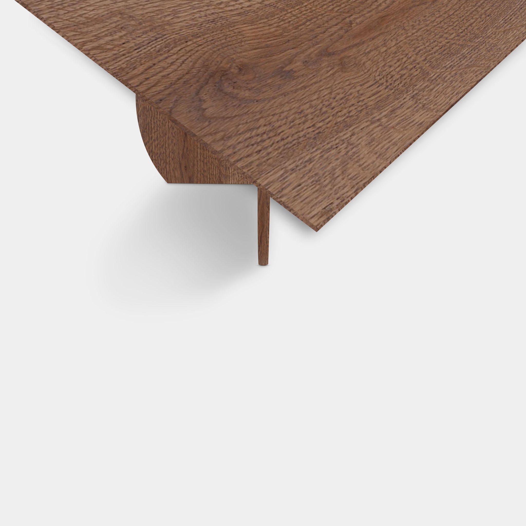 This solid oak table with a distinctive triangular leg is finished entirely in cinnamon