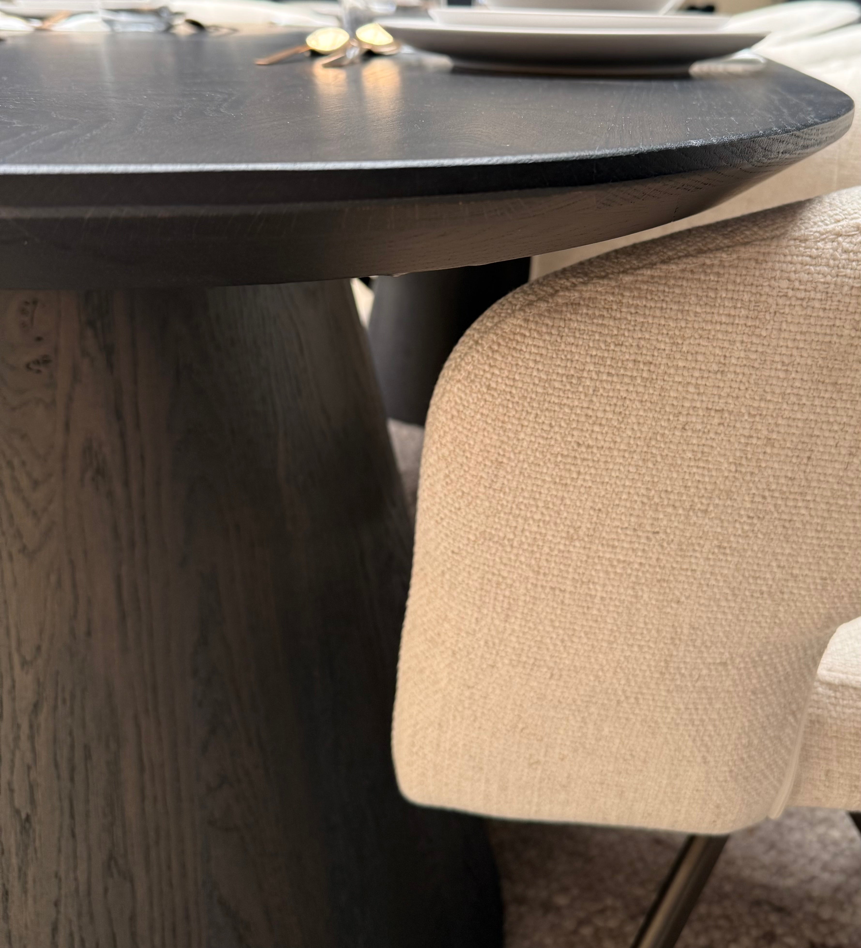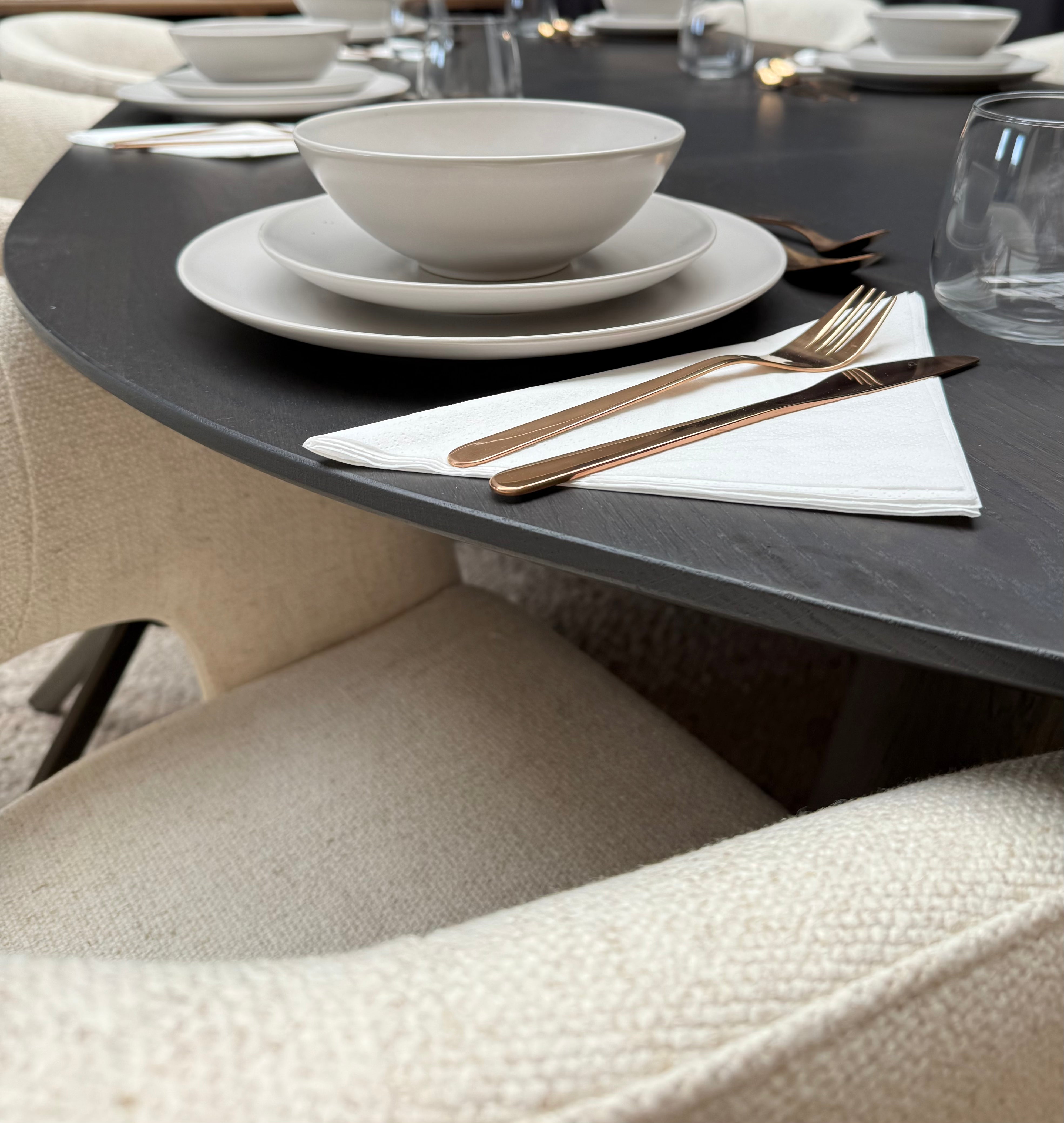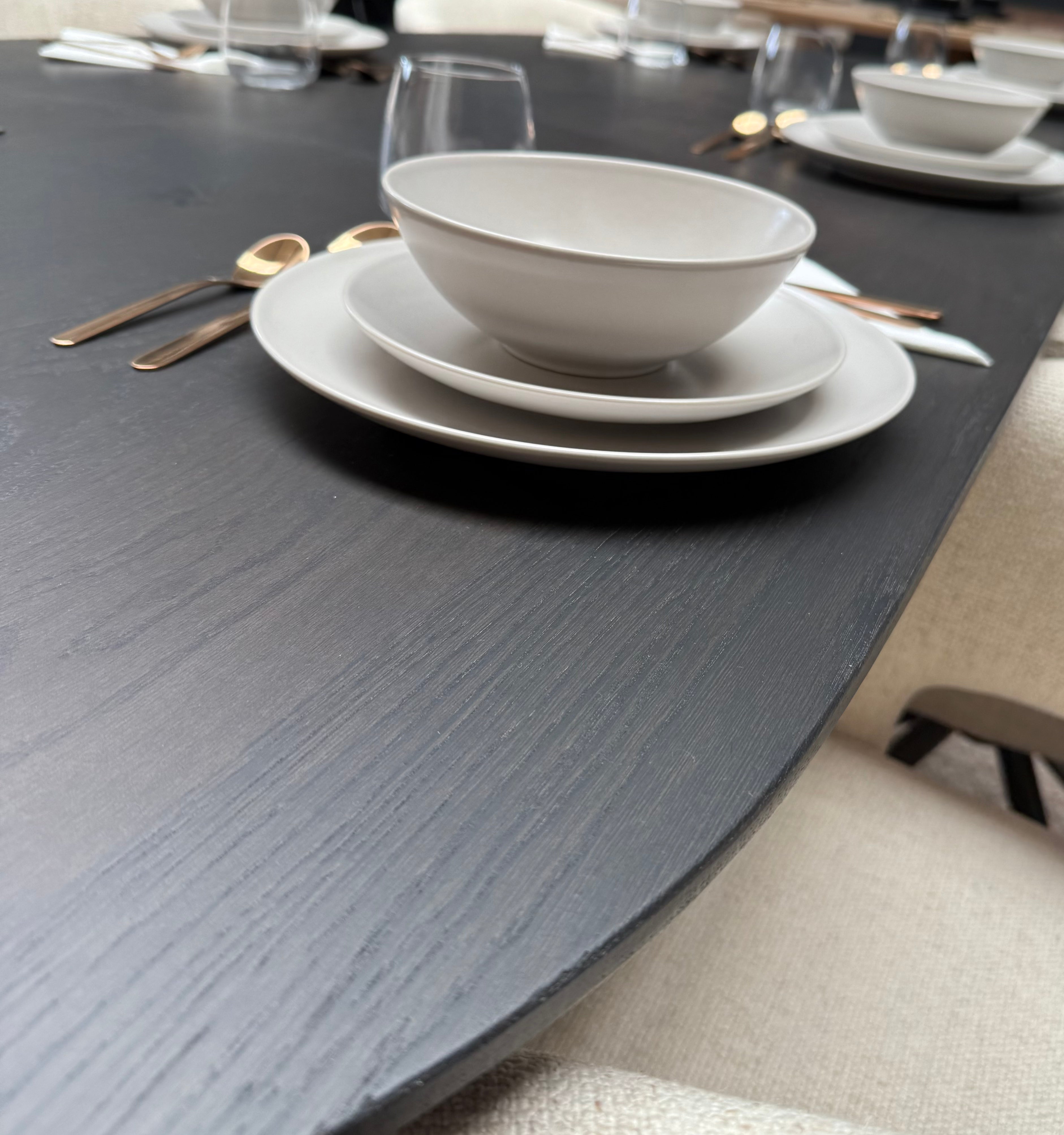 Créez une oasis de calme et de style avec notre table à manger organique. Sa forme unique et douce, sans angles durs, rompt avec l'improvisation et crée une atmosphère chaleureuse. Le gris profond et apaisant du plateau en chêne s'intègre parfaitement à un intérieur moderne et forme une base élégante.