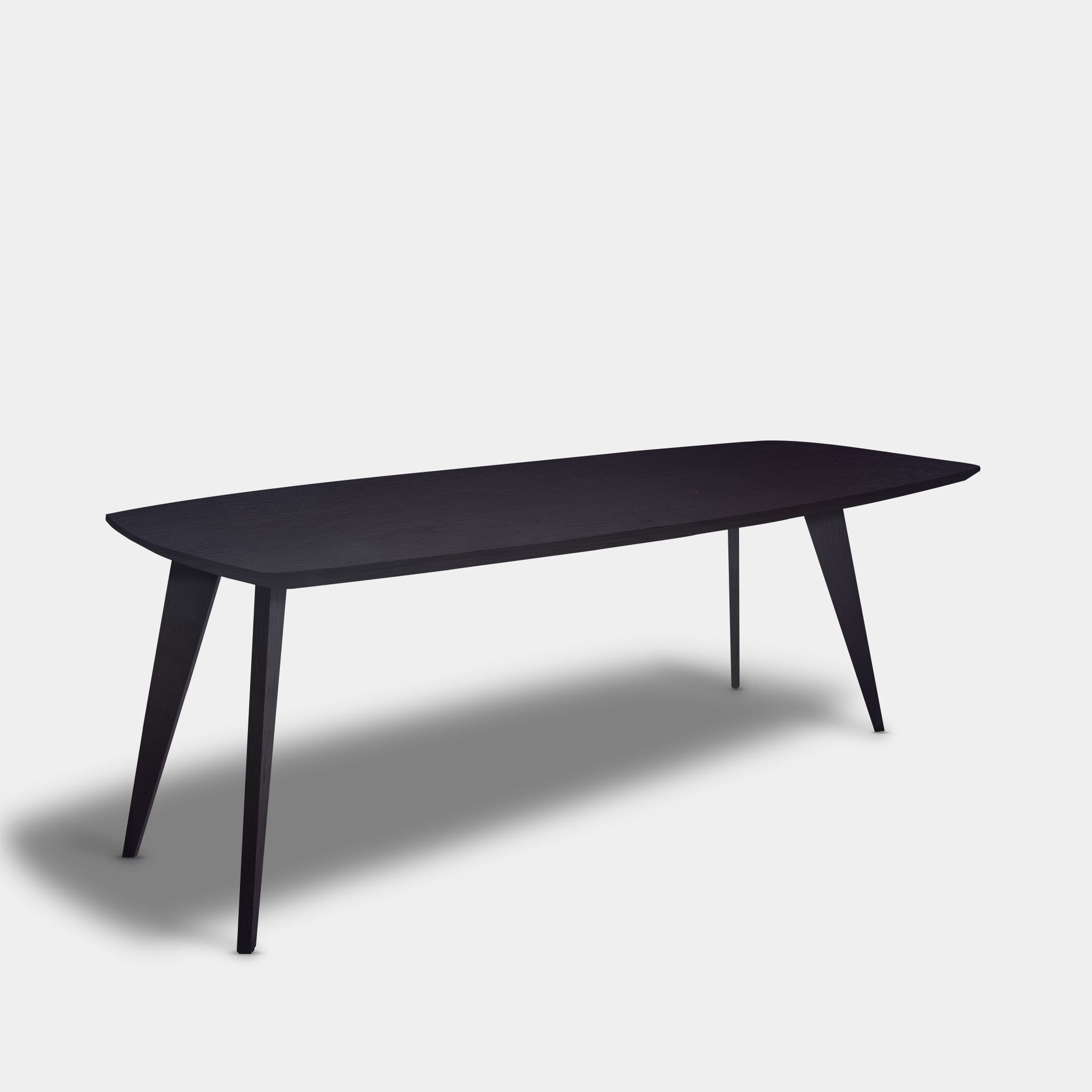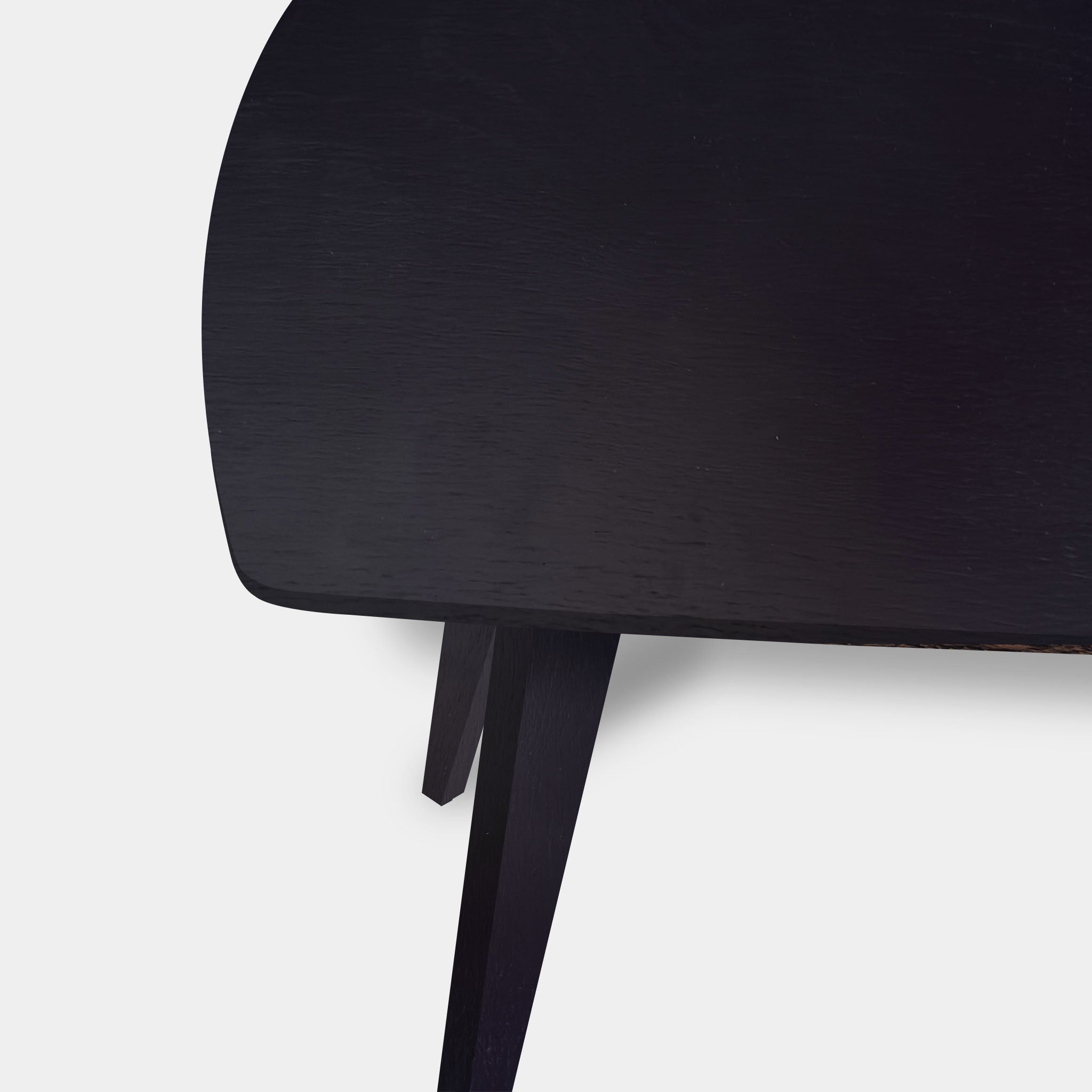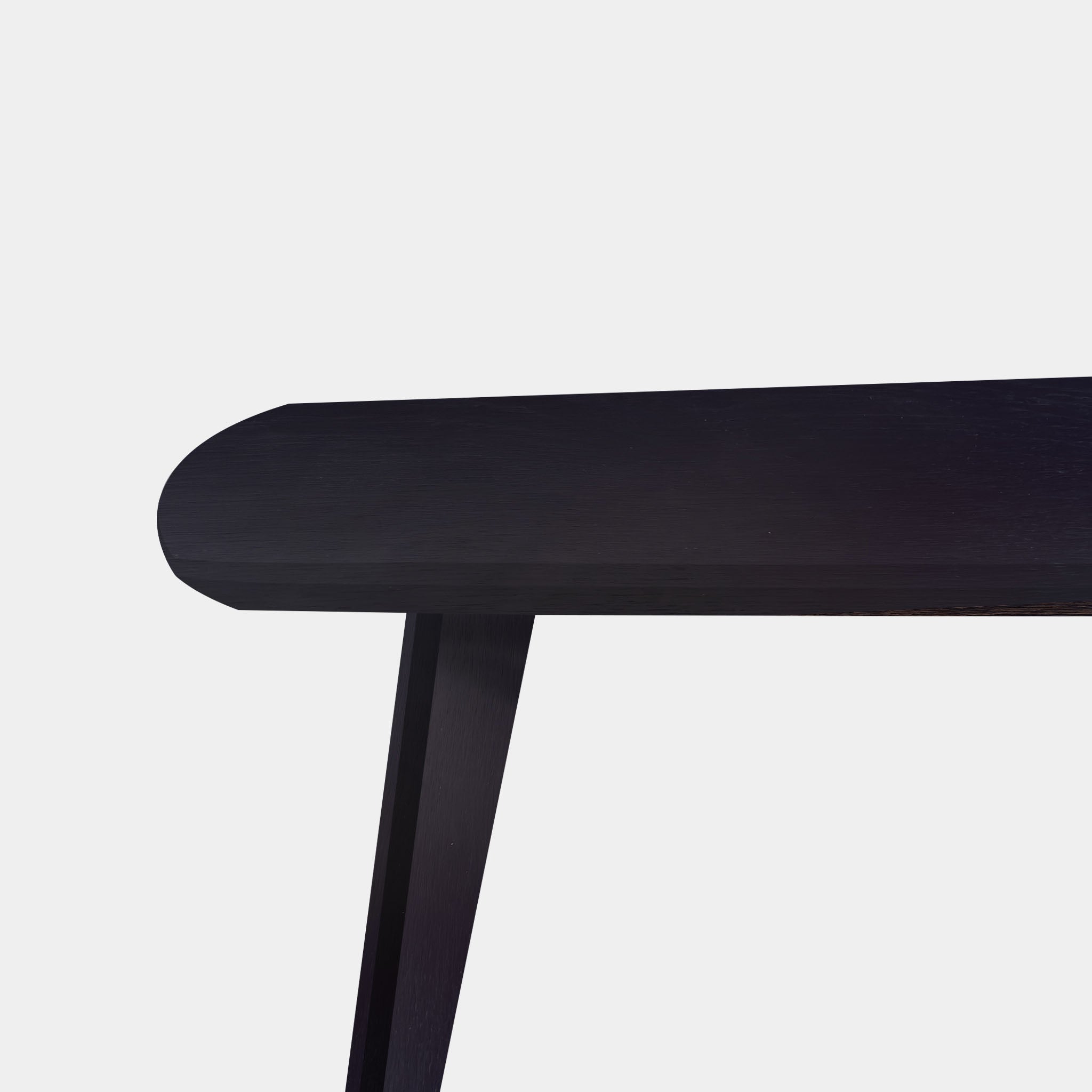 Cette impressionnante table ovale danoise en chêne massif, finition chêne foncé, couleur profonde et classique, respire la robustesse, le savoir-faire et l'élégance intemporelle. Son plateau arrondi lui confère une forme fluide et accueillante, tandis que son piètement en bois massif assorti, peint à la bombe de la même couleur, offre une assise stable et élégante.