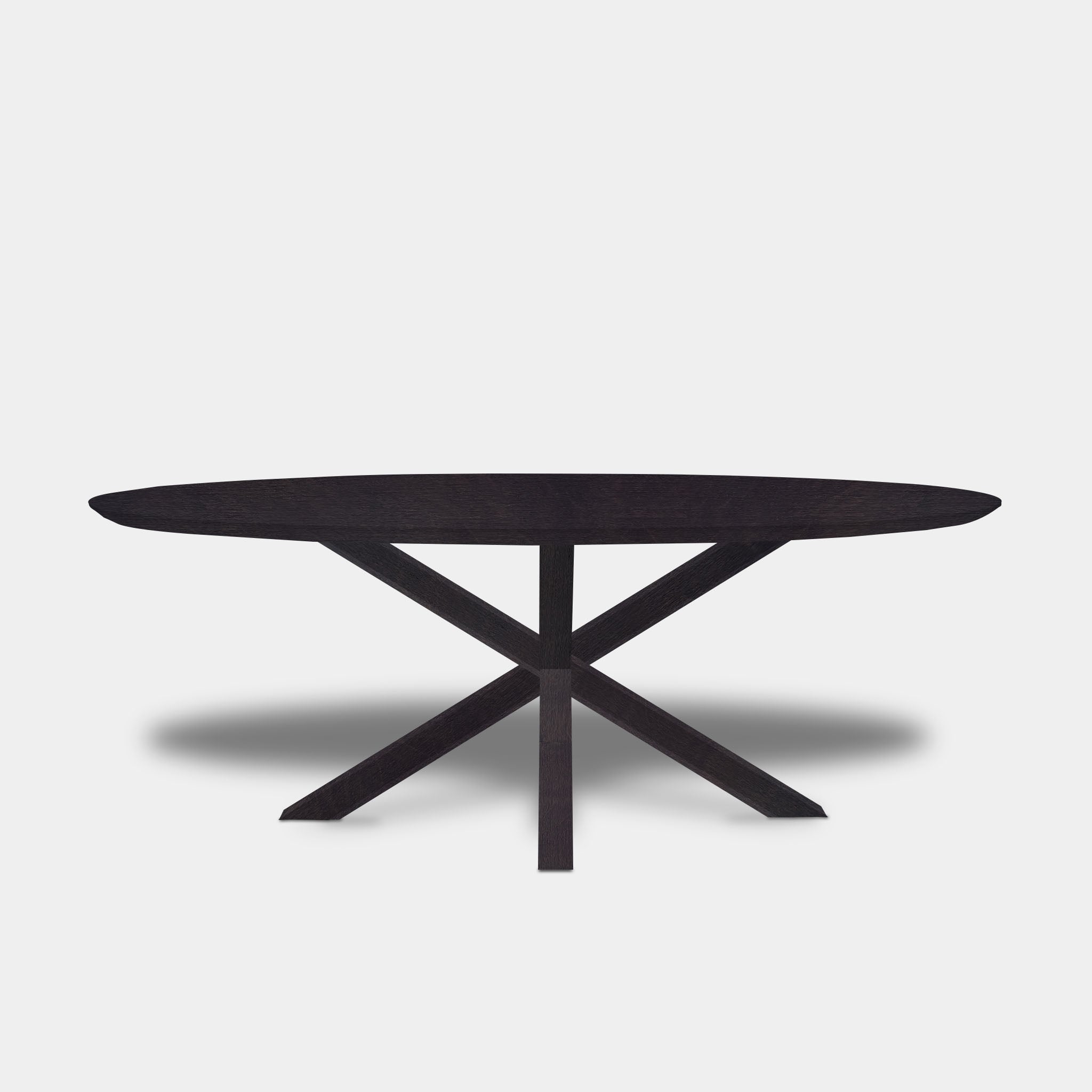Cette table ovale d'ambiance en chêne massif, déclinée dans la teinte profonde et chaleureuse « Night Glow », respire le luxe et le caractère. Sa forme fluide et arrondie crée un profil accueillant et harmonieux, tandis que son robuste piètement en bois matricé, peint de la même teinte, crée un ensemble puissant et visuellement équilibré.