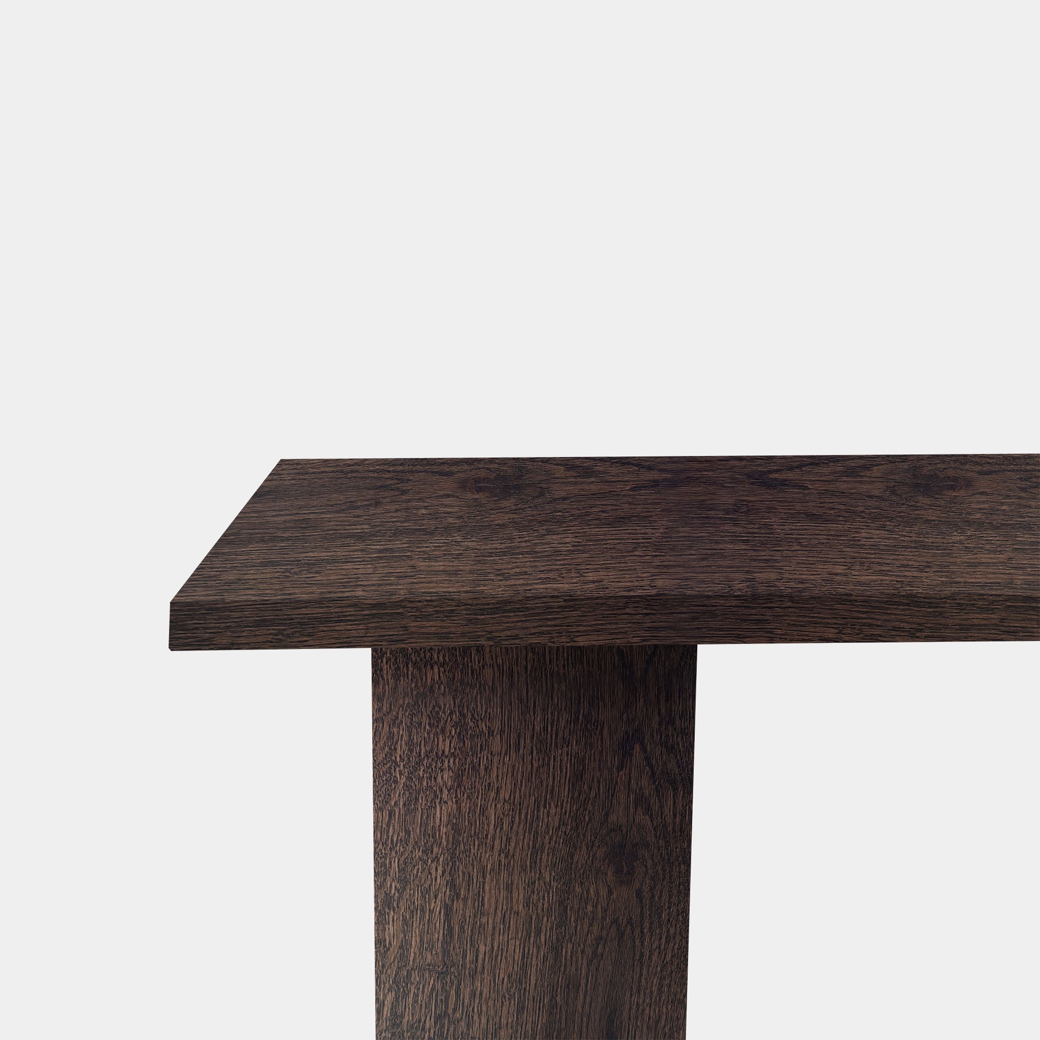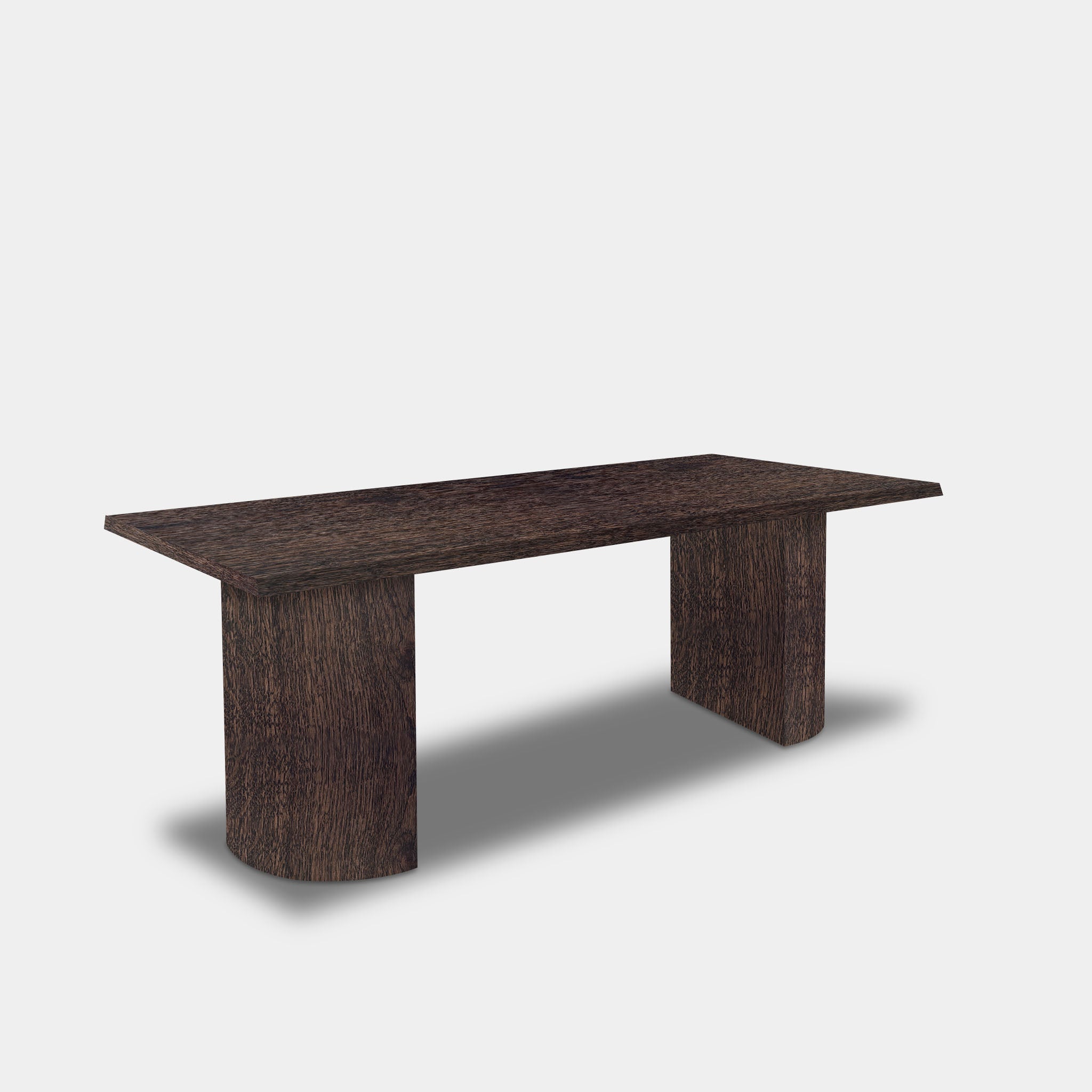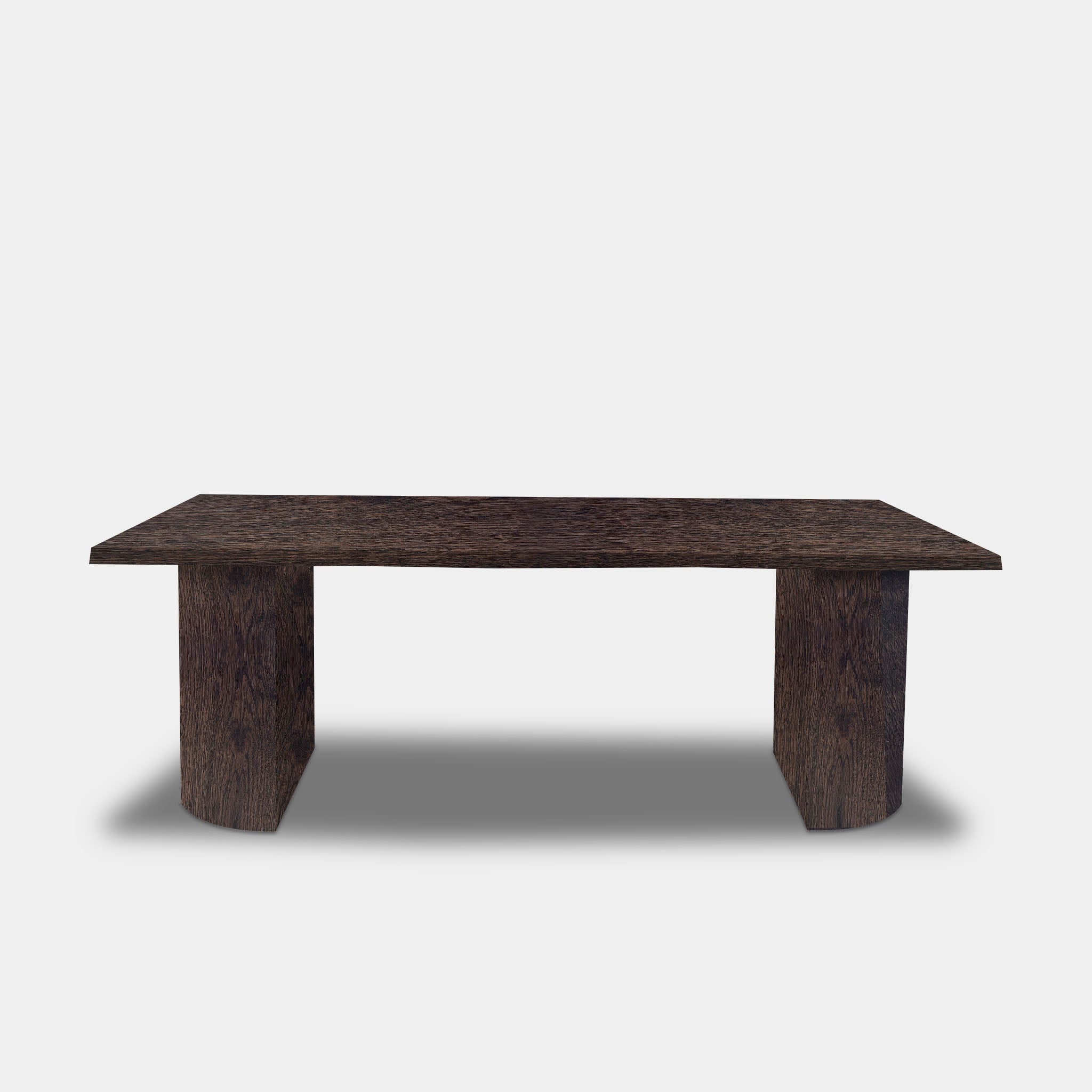 Deze elegante en krachtige boomstamtafel van massief eikenhout, afgewerkt in de diepe kleur Dear Brown, straalt klasse en rust uit. Het organisch gevormde blad en het stevige half rond onderstel zijn beide meegespoten in dezelfde warme tint, wat zorgt voor een harmonieus en stijlvol geheel.