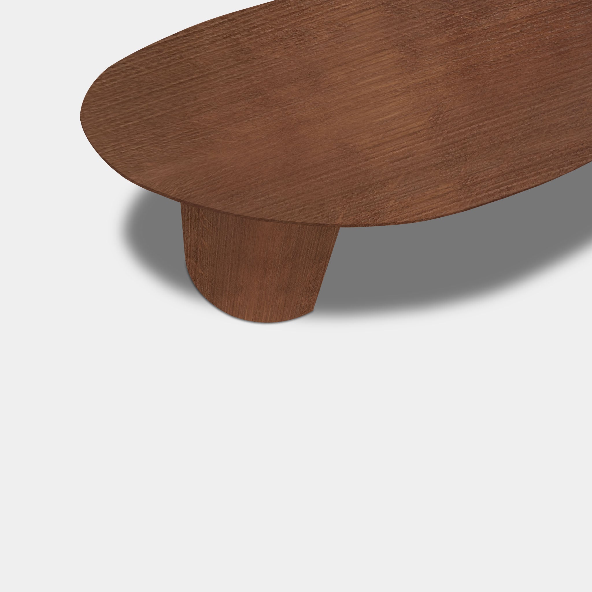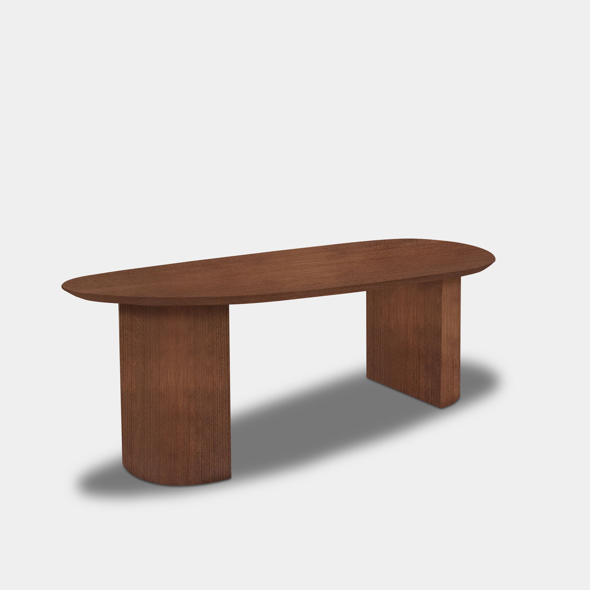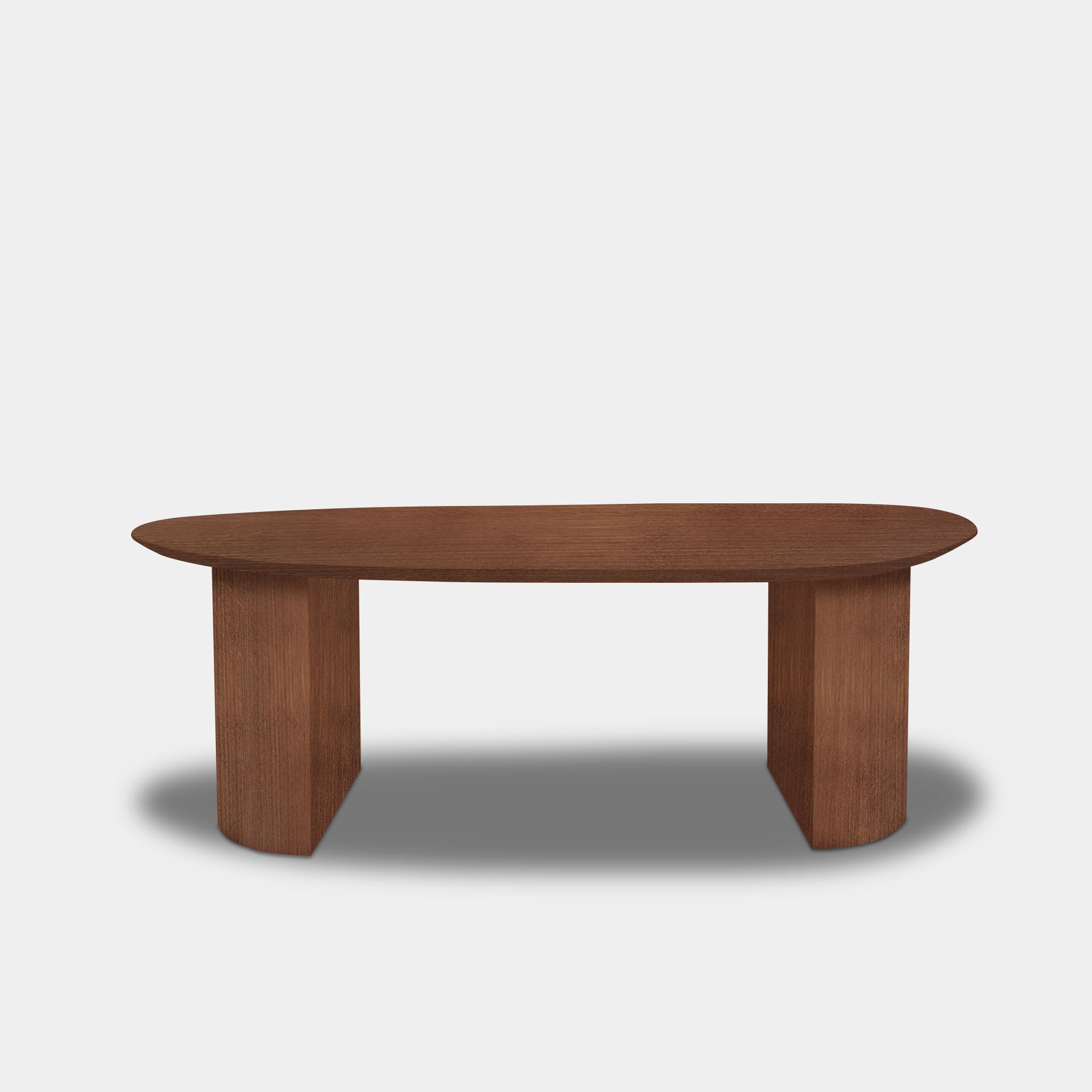 Deze stijlvolle organisch gevormde tafel van massief eikenhout, afgewerkt in de warme, mediterrane kleur Toscane 102, straalt karakter, rust en verfijnde ambacht uit. Het vloeiende, asymmetrische blad zorgt voor een speelse en natuurlijke vorm, terwijl het half ronde onderstel, meegespoten in dezelfde tint, een solide en harmonieus geheel vormt.