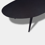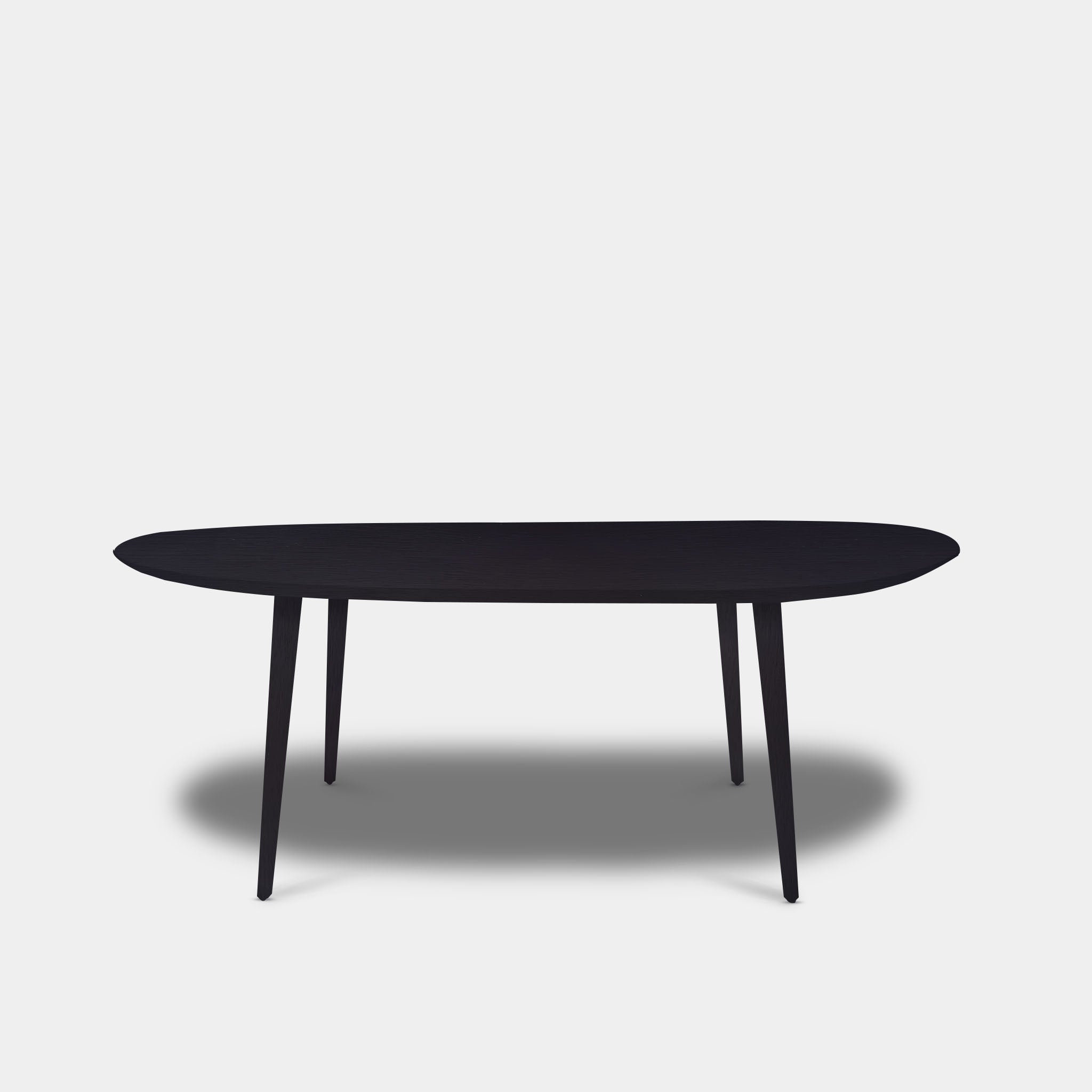 Deze karaktervolle organisch gevormde tafel van massief eikenhout, afgewerkt in de diepe, rijke kleur Donker Eiken, combineert natuurlijke vormen met een tijdloze en krachtige uitstraling. Het vloeiende blad geeft de tafel een zachte, speelse vorm, terwijl de vier konisch gevormde poten, meegespoten in dezelfde donkere tint, zorgen voor een harmonieus en stabiel geheel.