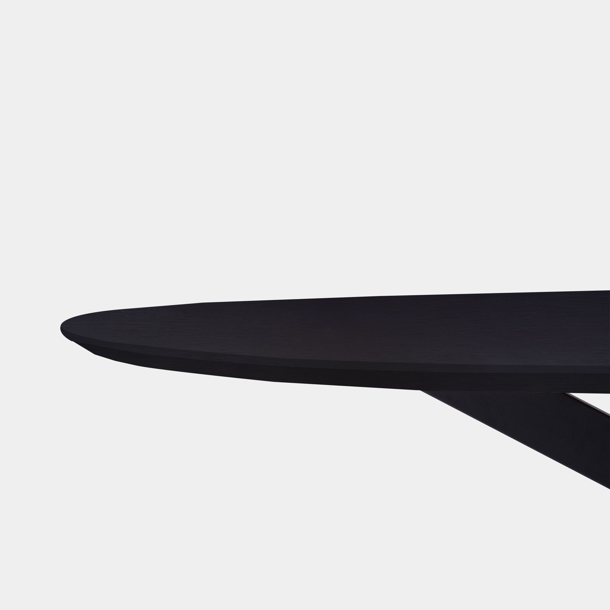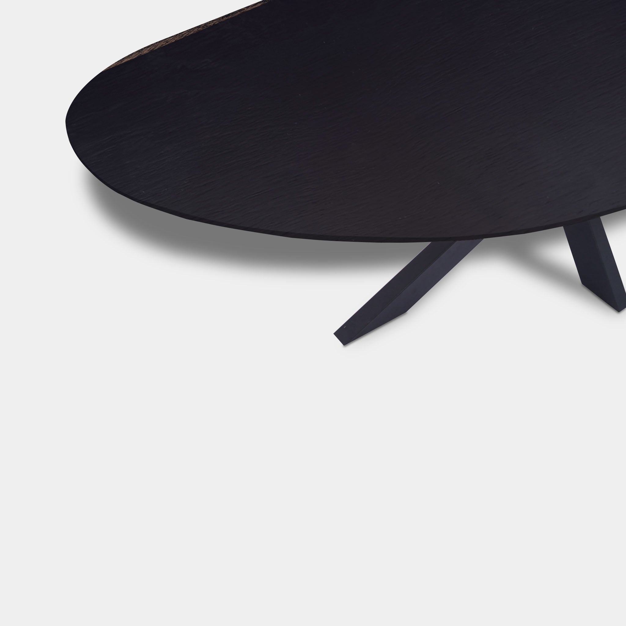 Deze indrukwekkende organisch gevormde tafel van massief eikenhout, afgewerkt in de rijke kleur Donker Eiken, straalt kracht, ambacht en tijdloze elegantie uit. Het vloeiend gevormde blad met natuurlijke contouren creëert een speels en uitnodigend karakter, terwijl het stevige matrix onderstel van zwart gepoedercoat staal zorgt voor een stabiele en moderne basis.