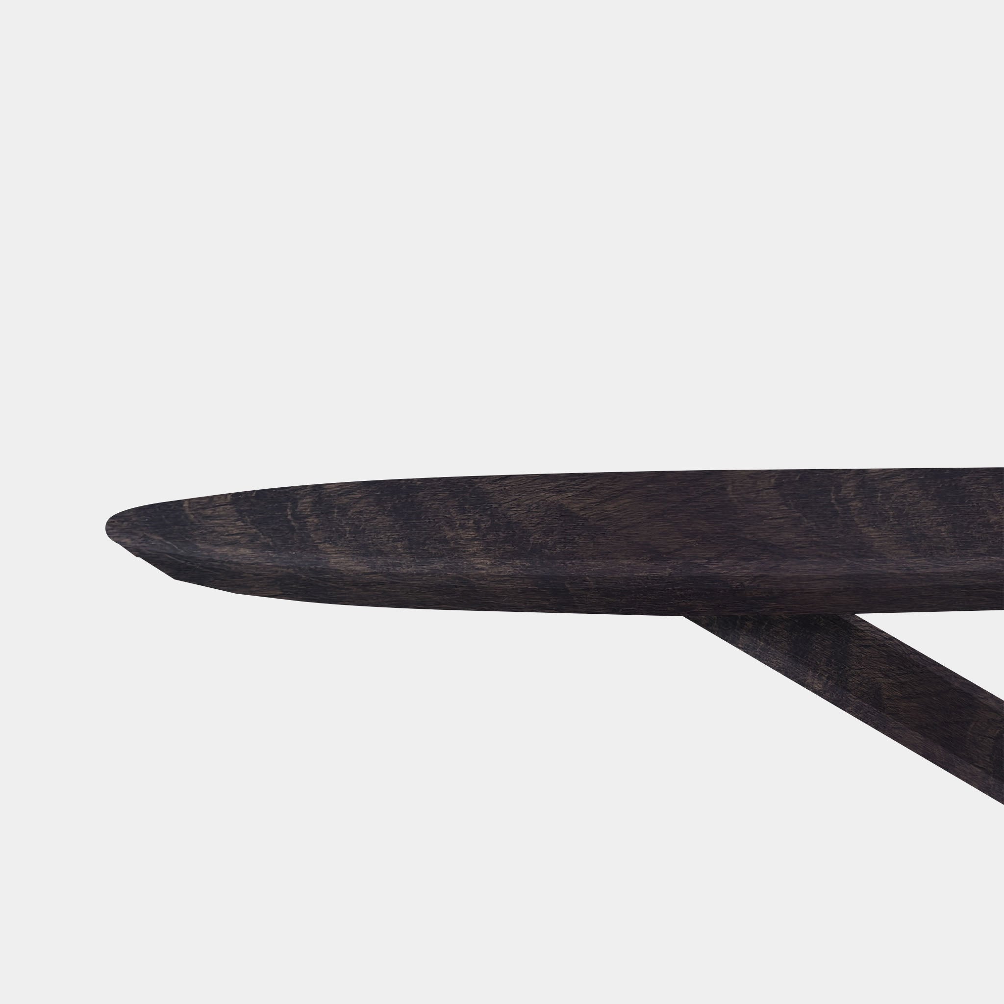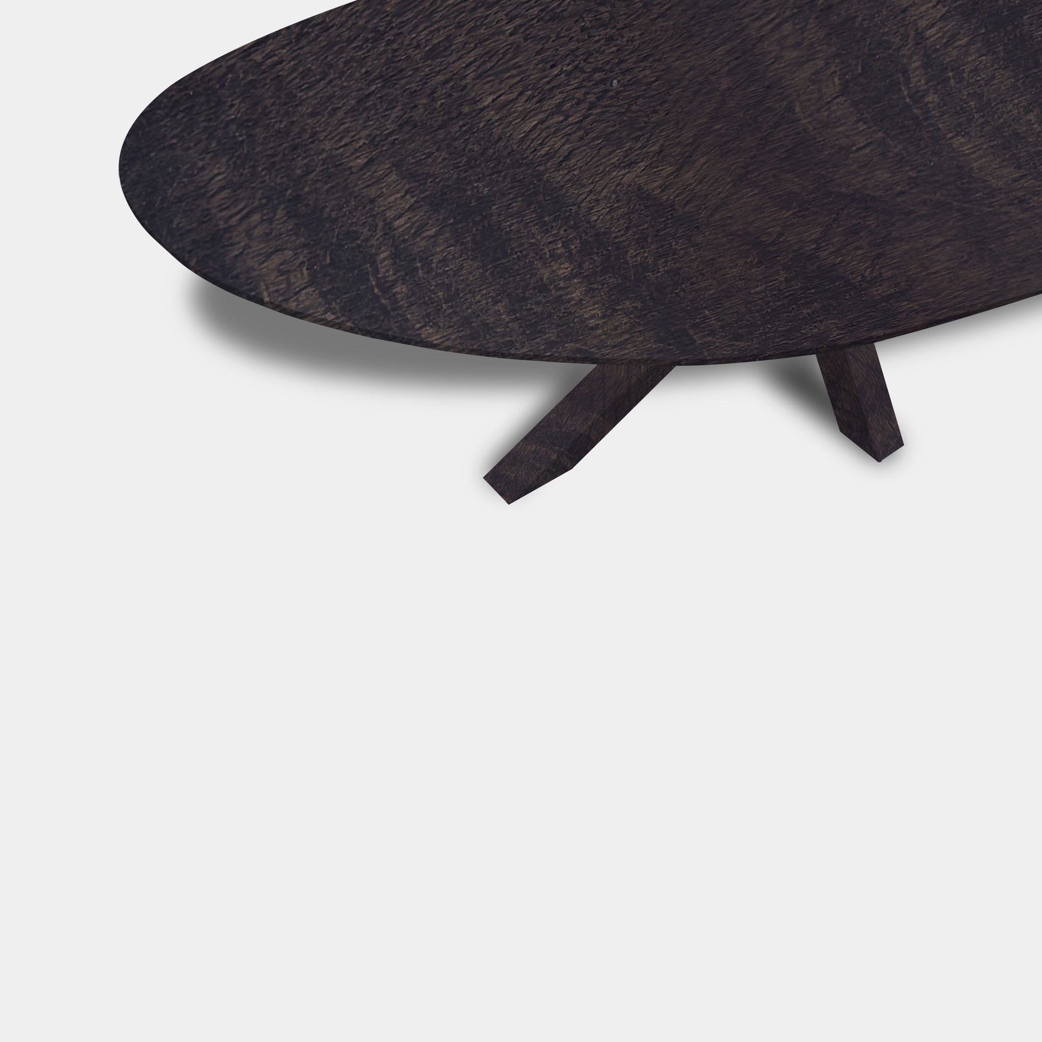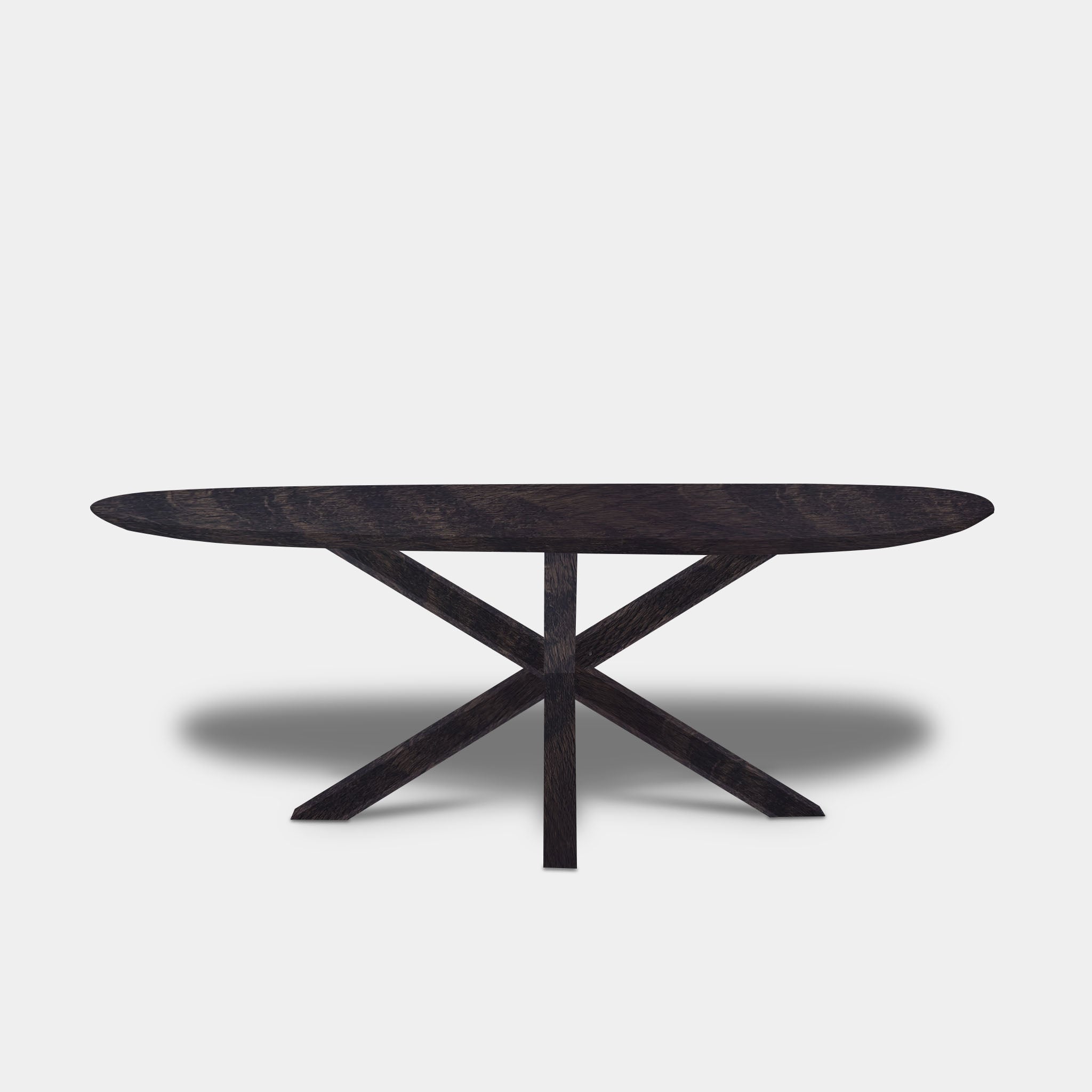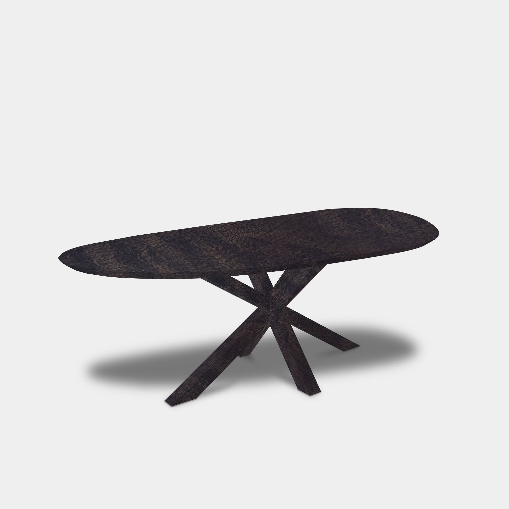 Deze moderne en krachtige organisch gevormde tafel van massief eikenhout, afgewerkt in de diepe kleur Dark Grey, combineert natuurlijke lijnen met eigentijdse uitstraling. Het golvend gevormde blad zorgt voor een zachte, speelse vorm, terwijl het houten matrix onderstel, meegespoten in dezelfde tint, zorgt voor een stevig en strak geheel.