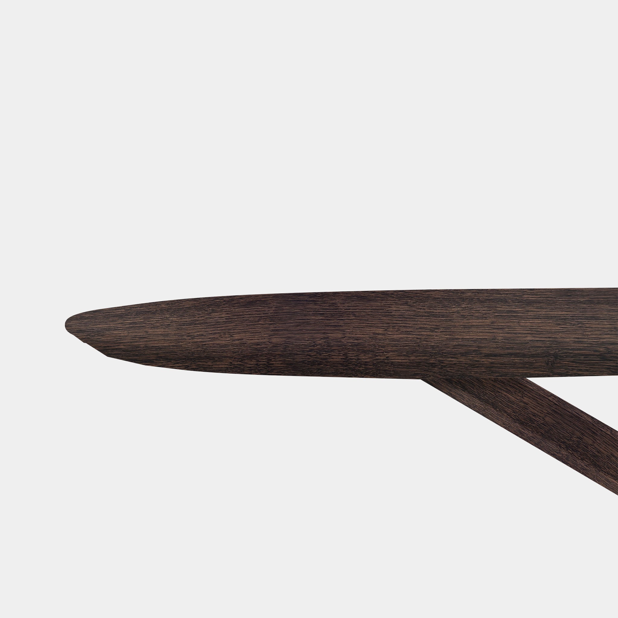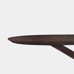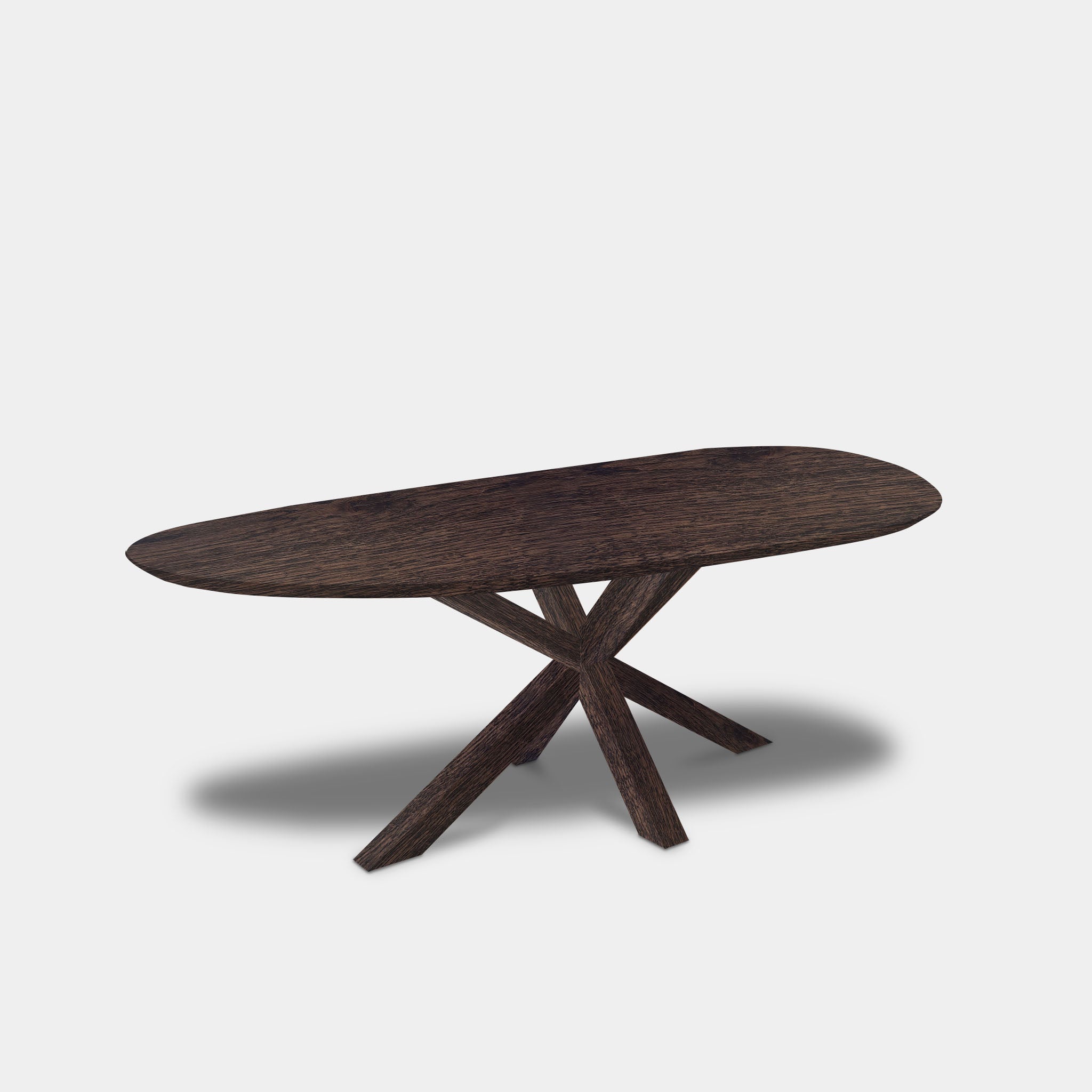 Deze klassieke en karaktervolle organisch gevormde tafel van massief eikenhout, afgewerkt in de diepe kleur Dear Brown, straalt rust, luxe en vakmanschap uit. Het blad met zijn vloeiende, asymmetrische vormen geeft de tafel een zacht en uniek silhouet, terwijl het houten matrix onderstel, meegespoten in dezelfde tint, zorgt voor een stevige en stijlvolle basis.