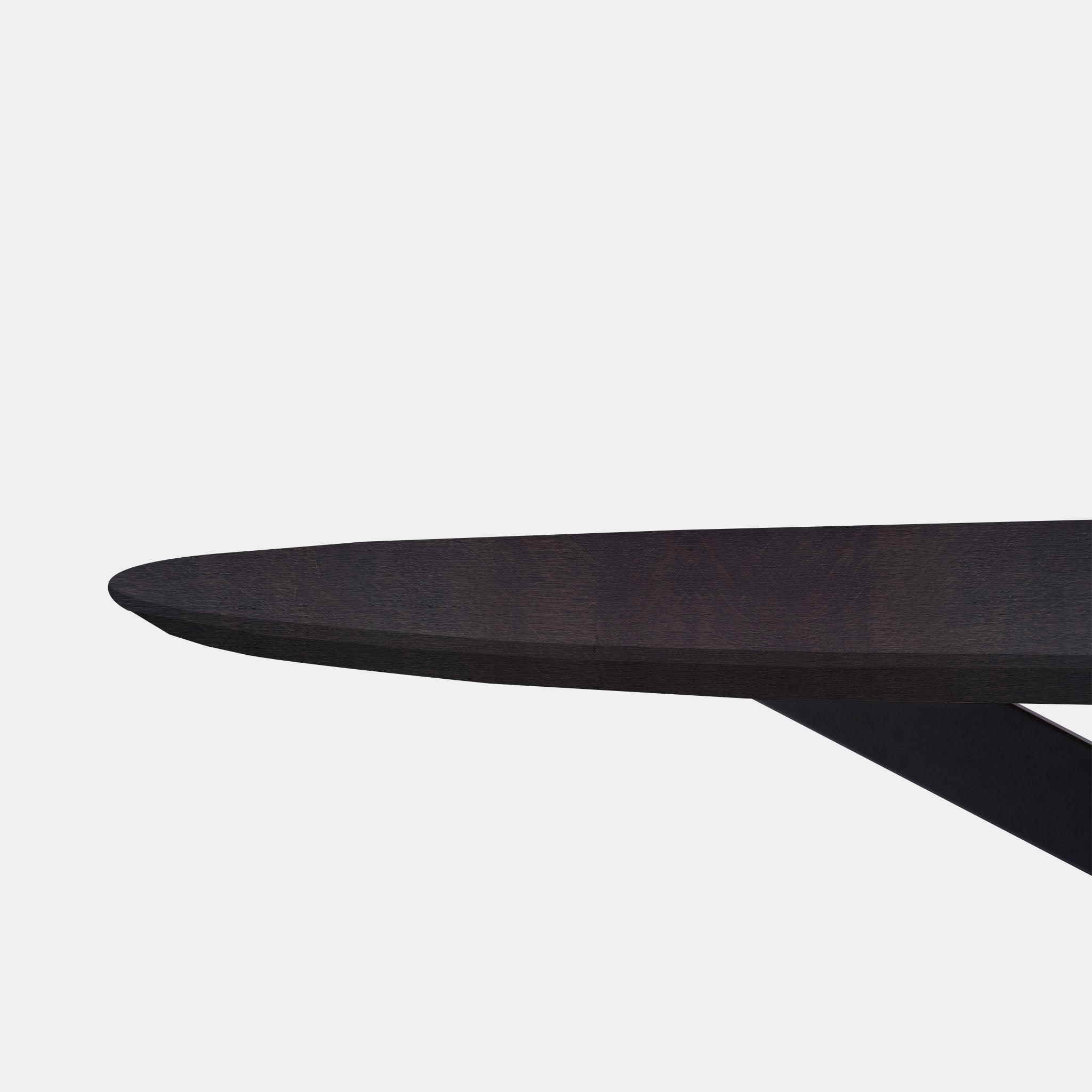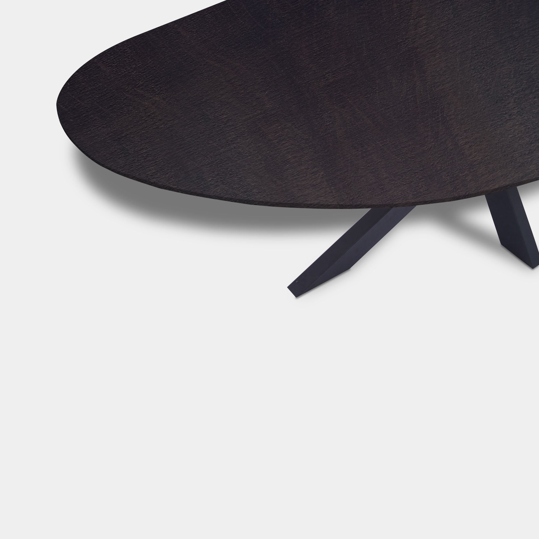Deze sfeervolle organisch gevormde tafel van massief eikenhout, afgewerkt in de diepe en warme kleur Night Glow, combineert natuurlijke elegantie met eigentijdse verfijning. De vloeiende, asymmetrische lijnen van het blad geven de tafel een zachte, uitnodigende uitstraling, terwijl het robuuste matrix onderstel van zwart gepoedercoat staal een modern en stabiel accent toevoegt.