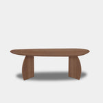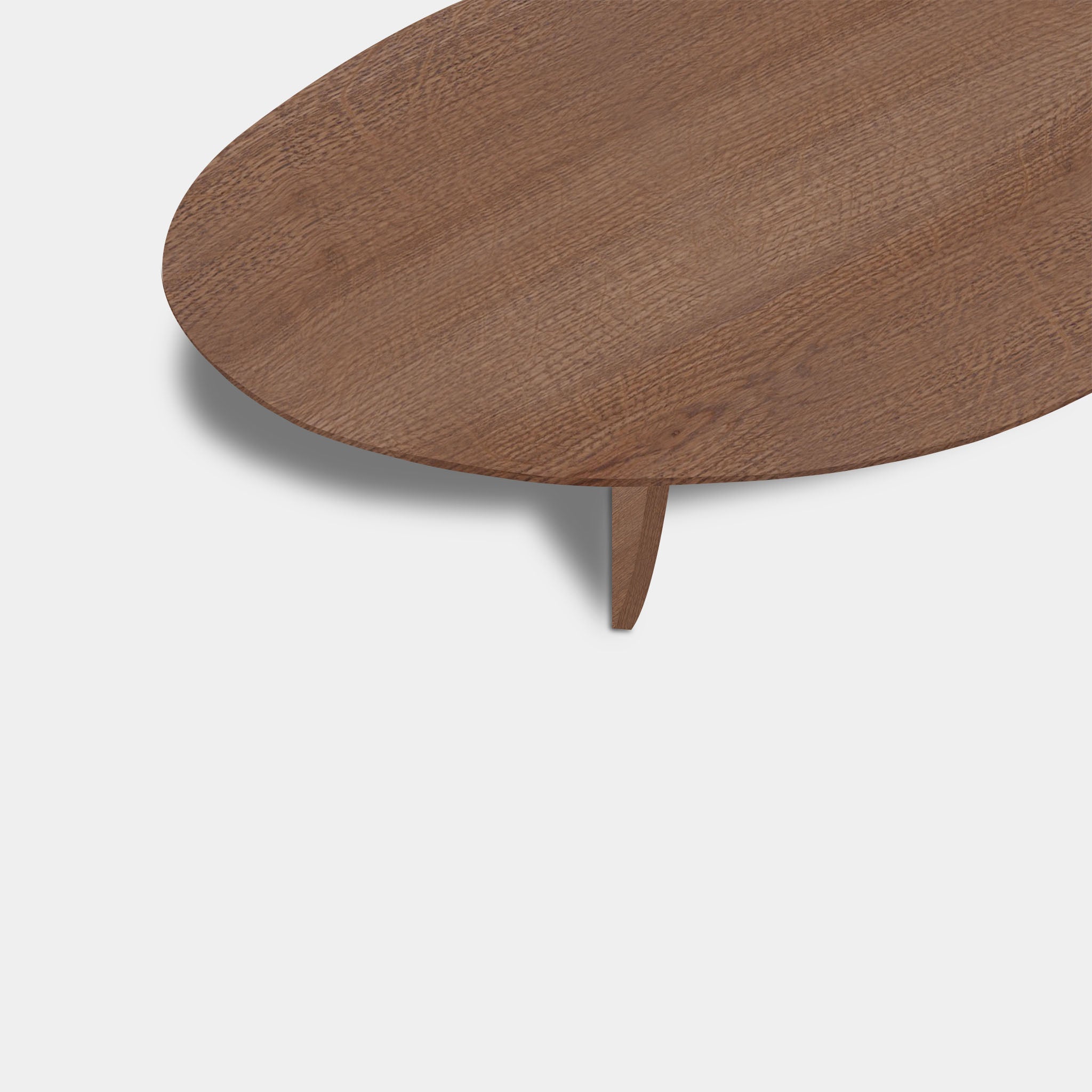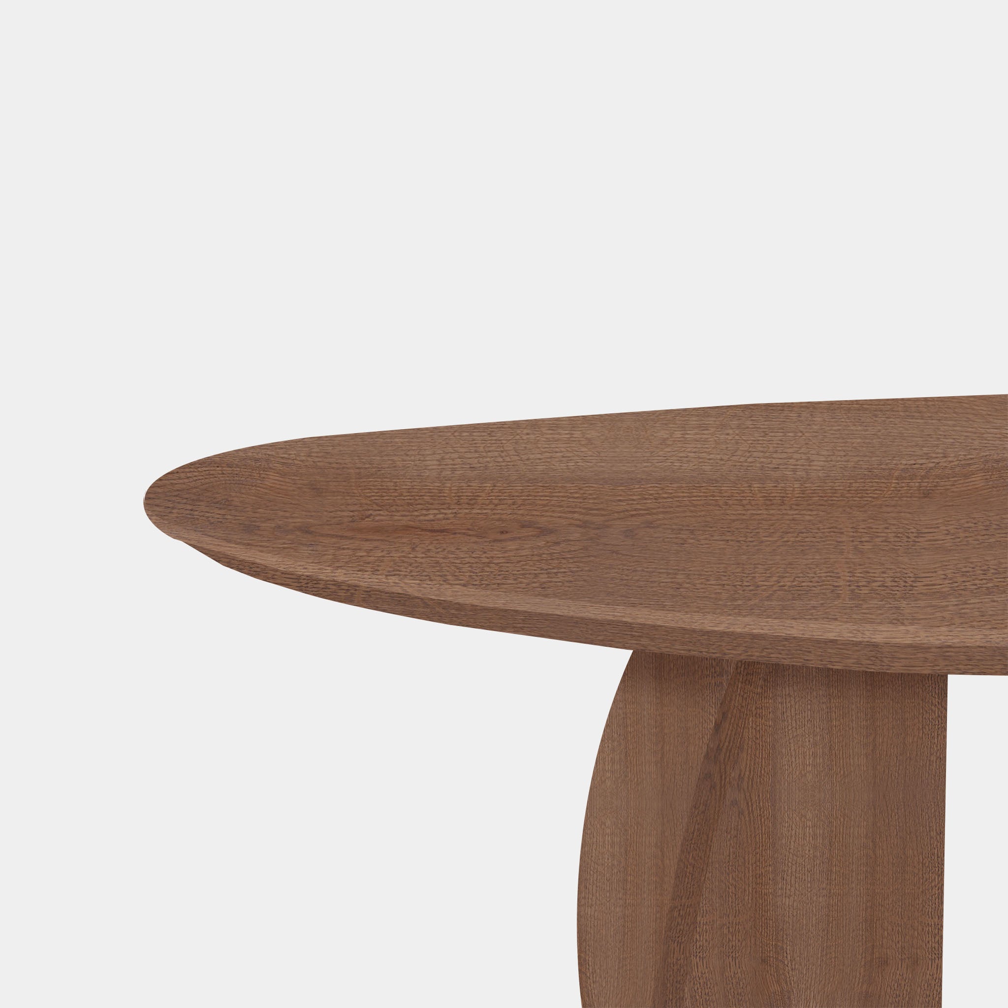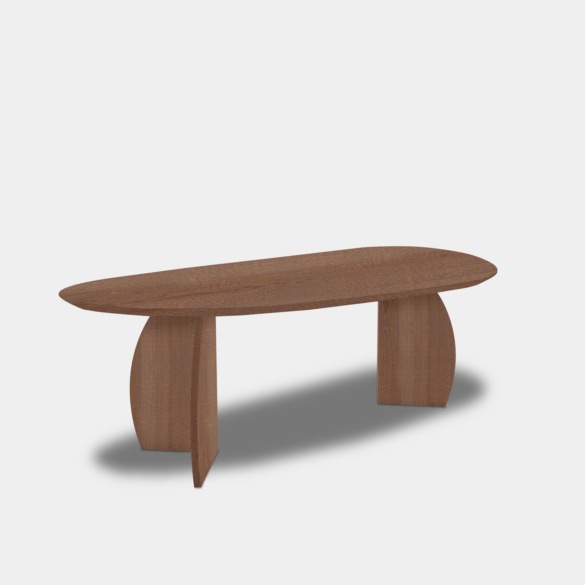Deze warme en karaktervolle organisch gevormde tafel van massief eikenhout, afgewerkt in de rijke kleur Cinnamon, combineert natuurlijke elegantie met moderne lijnen. Het golvende, asymmetrisch gevormde blad straalt zachtheid en dynamiek uit, terwijl de set van twee driehoekige poten, meegespoten in dezelfde tint, zorgt voor een krachtig, geometrisch en stijlvol onderstel.