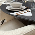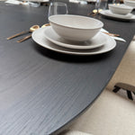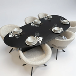 Creëer een oase van rust en stijl met onze organische eettafel. De unieke, zachte vorm zonder harde hoeken doorbreekt de voorspelbaarheid en zorgt voor een uitnodigende sfeer. De kalme, diepgrijze kleur van het eikenhouten blad past moeiteloos in een modern interieur en vormt een prachtige basis.