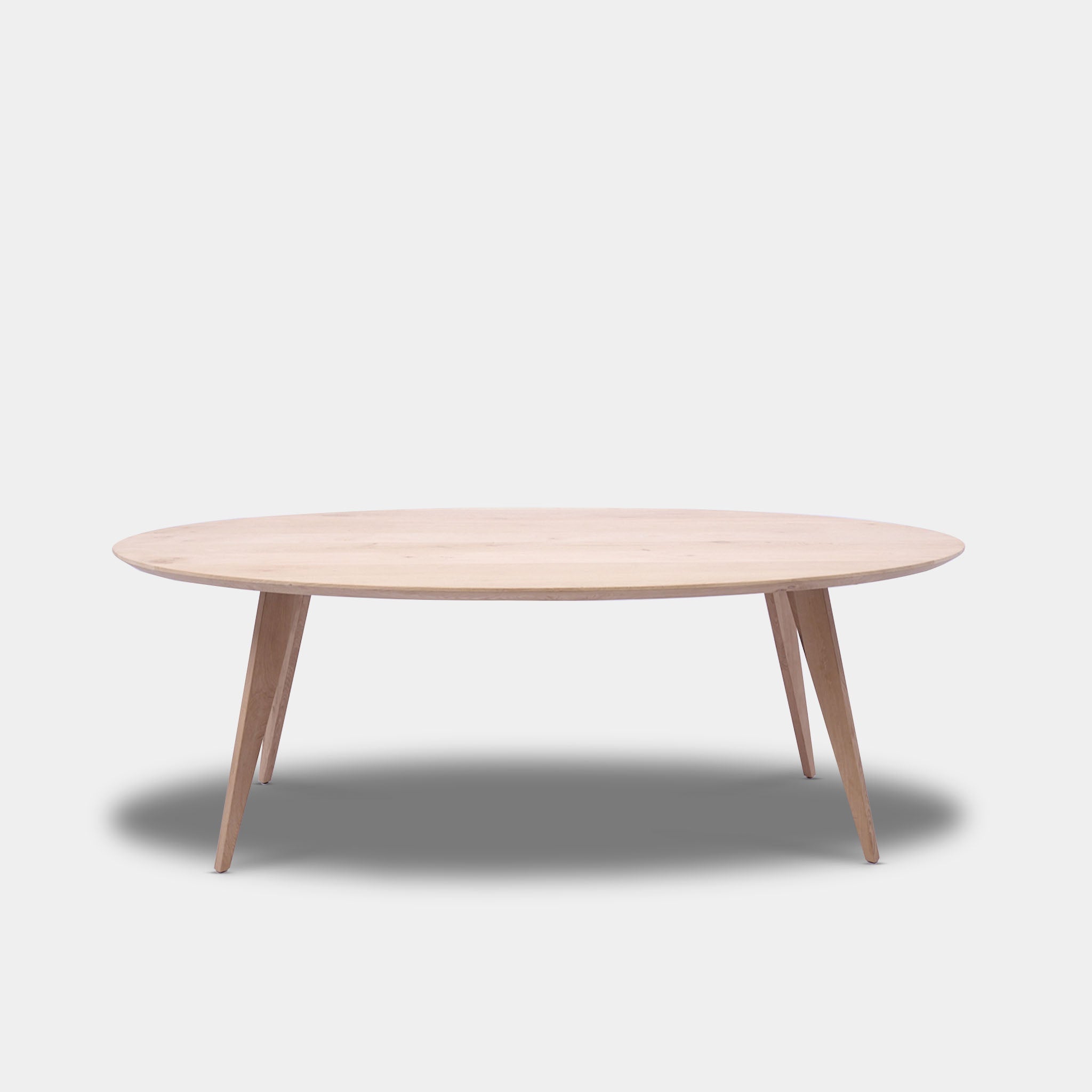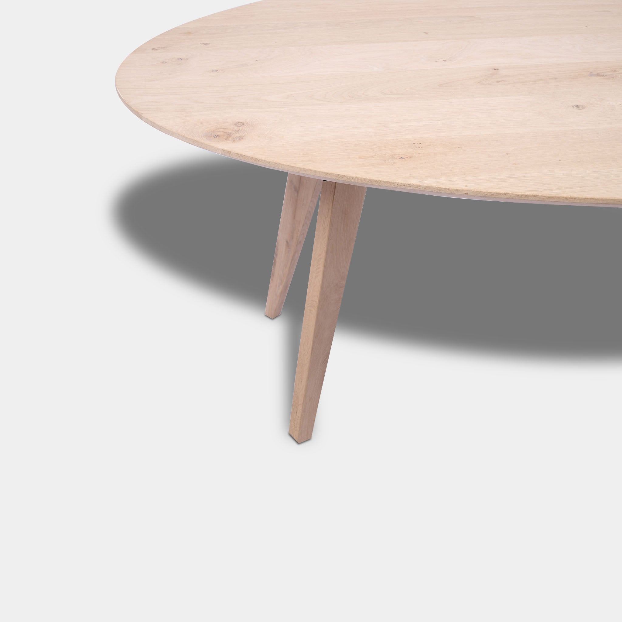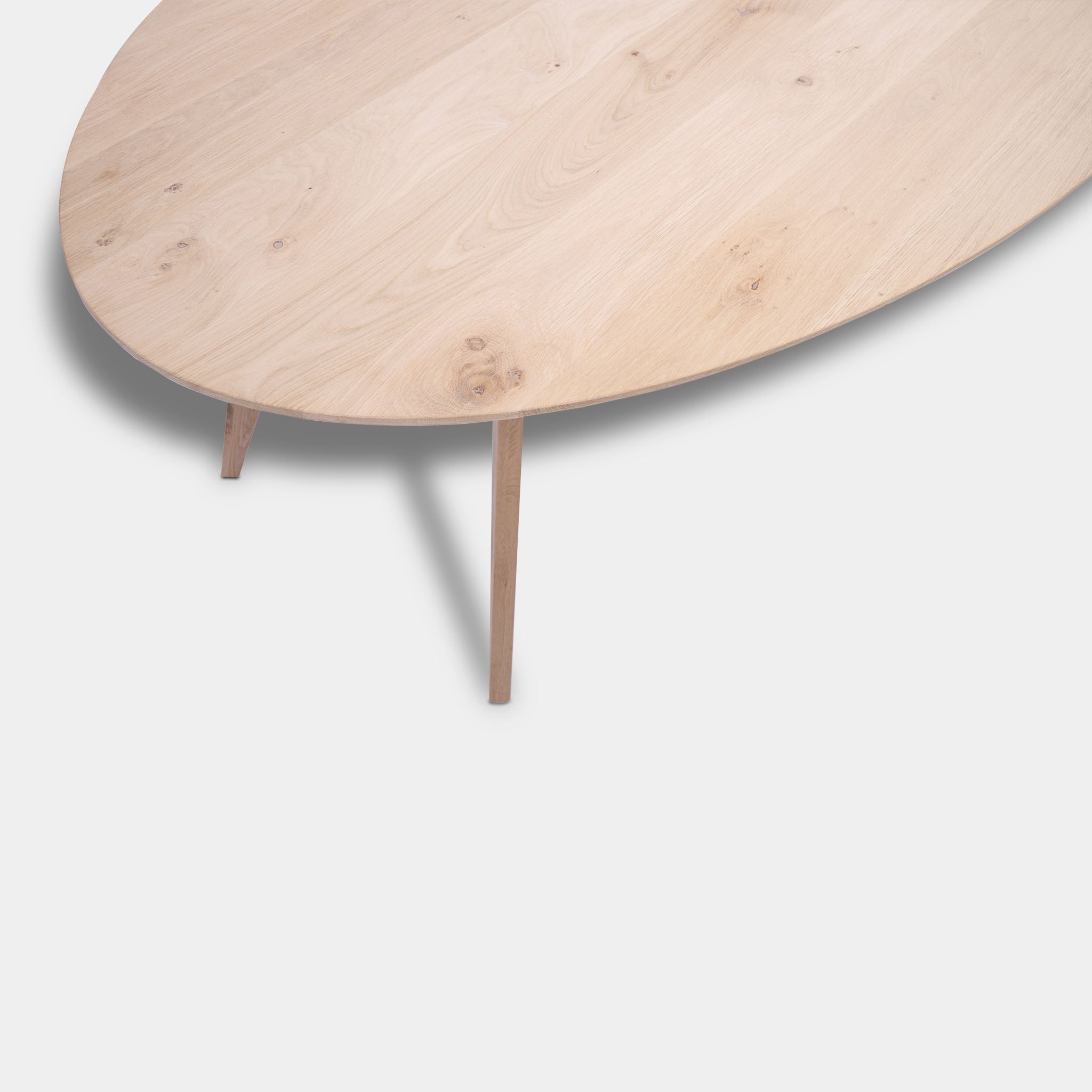 Deze pure en tijdloze ovale tafel van massief eikenhout, uitgevoerd in een onbehandelde afwerking, ademt natuurlijke elegantie en ambachtelijk vakmanschap. De vloeiende, afgeronde vorm zorgt voor een vriendelijke en open uitstraling, terwijl het robuuste volledig houten onderstel zorgt voor een harmonieuze basis – volledig vervaardigd uit hetzelfde eikenhout als het blad.