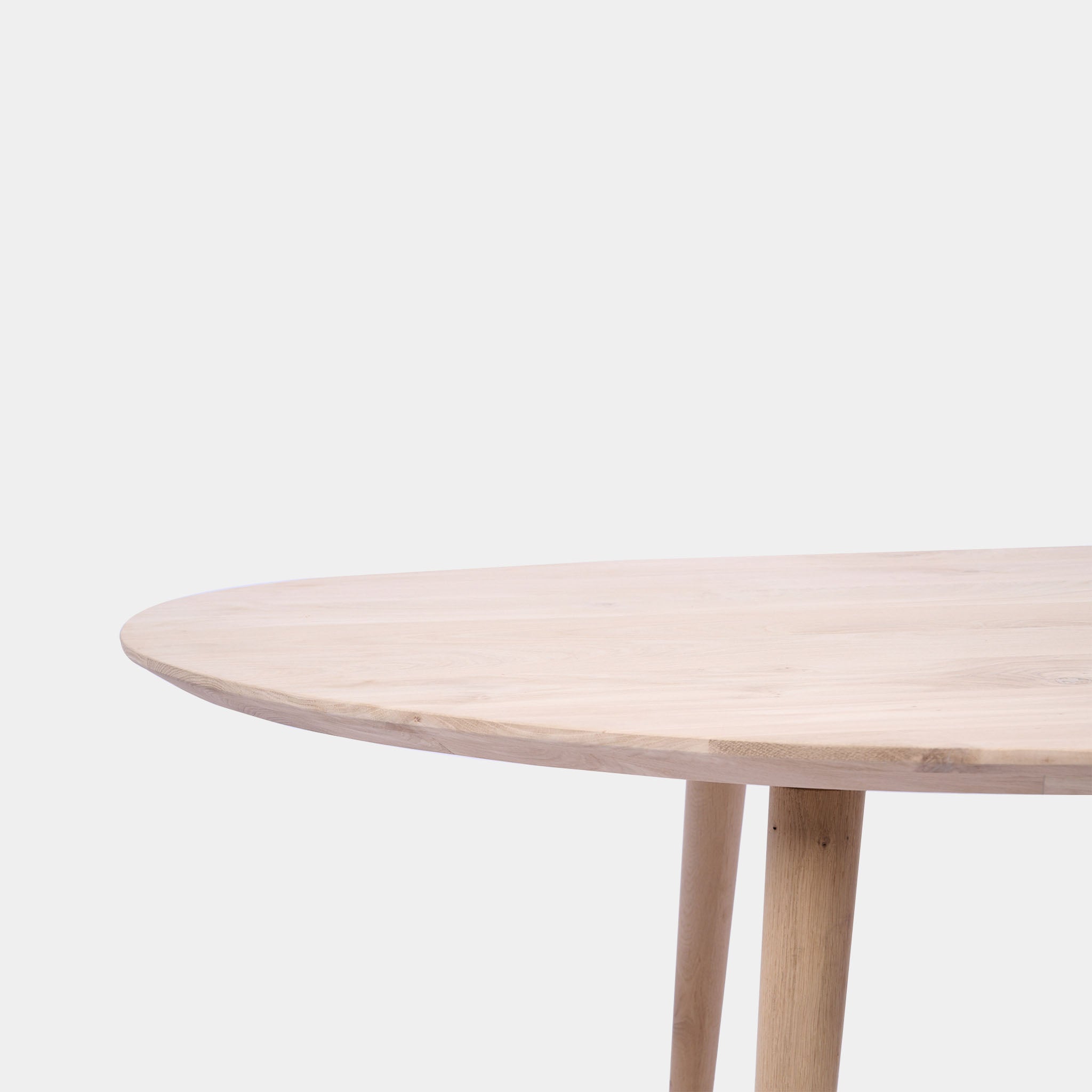 Deze elegante ovale tafel van massief eikenhout, uitgevoerd in een onbehandelde afwerking, straalt rust, eenvoud en vakmanschap uit. De vloeiende, afgeronde ovale vorm zorgt voor een vriendelijk en tijdloos profiel, terwijl de set van vier konische poten, gemaakt van massief eikenhout, zorgt voor een verfijnde en stabiele uitstraling.