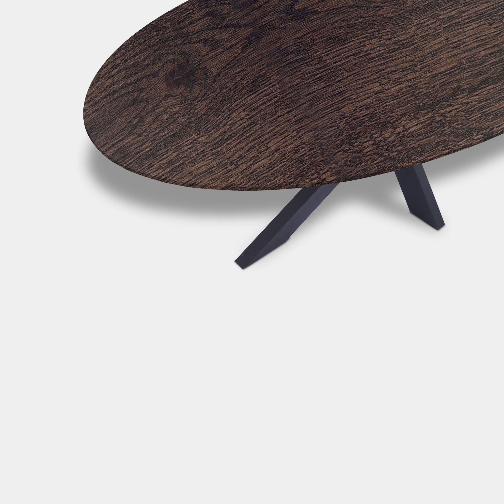 Deze klassieke en karaktervolle ovale tafel van massief eikenhout, afgewerkt in de diepe kleur Dear Brown, brengt tijdloze elegantie samen met ambachtelijk vakmanschap. De zachte, ovale vorm zorgt voor een harmonieus en vriendelijk silhouet, terwijl het robuuste matrix onderstel van zwart gepoedercoat staal zorgt voor een krachtige, moderne basis.