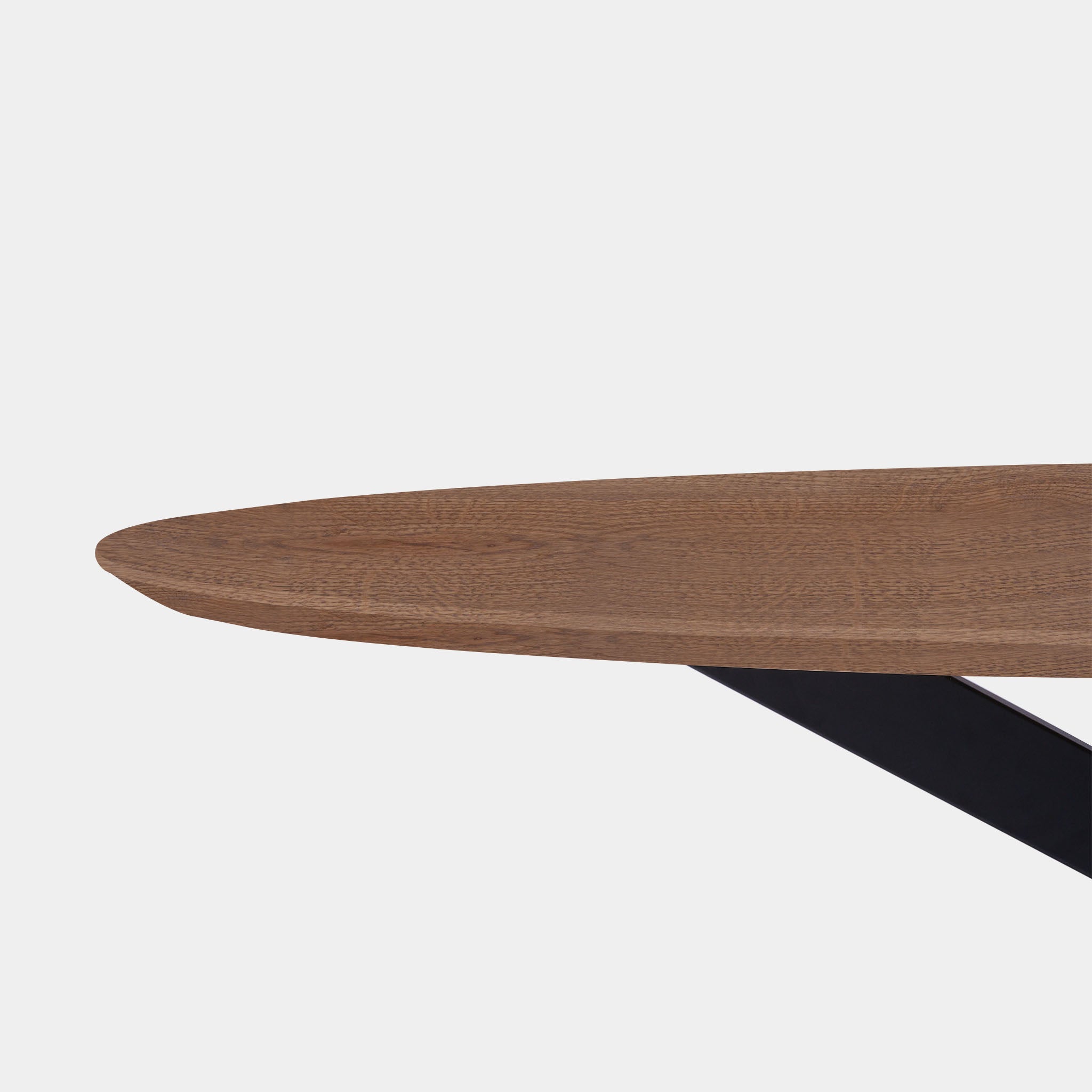 Deze warme en uitnodigende ovale tafel van massief eikenhout, afgewerkt in de rijke kleur Cinnamon, combineert natuurlijke elegantie met een krachtig ontwerp. De vloeiende ovale vorm zorgt voor een zachte, uitnodigende uitstraling, terwijl het robuuste Matrix XL onderstel van zwart gepoedercoat staal zorgt voor een solide, modern fundament.
